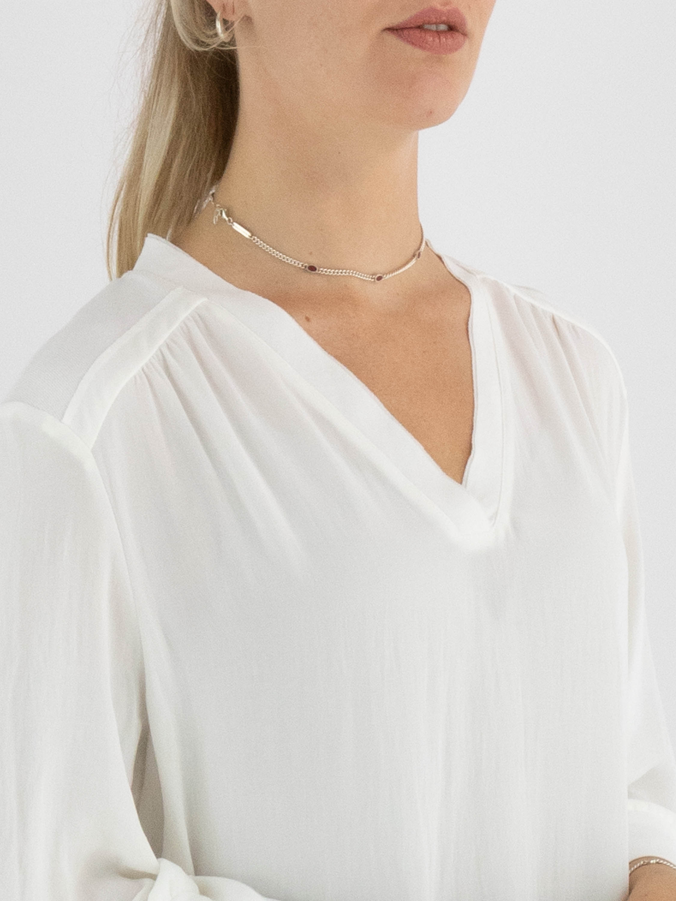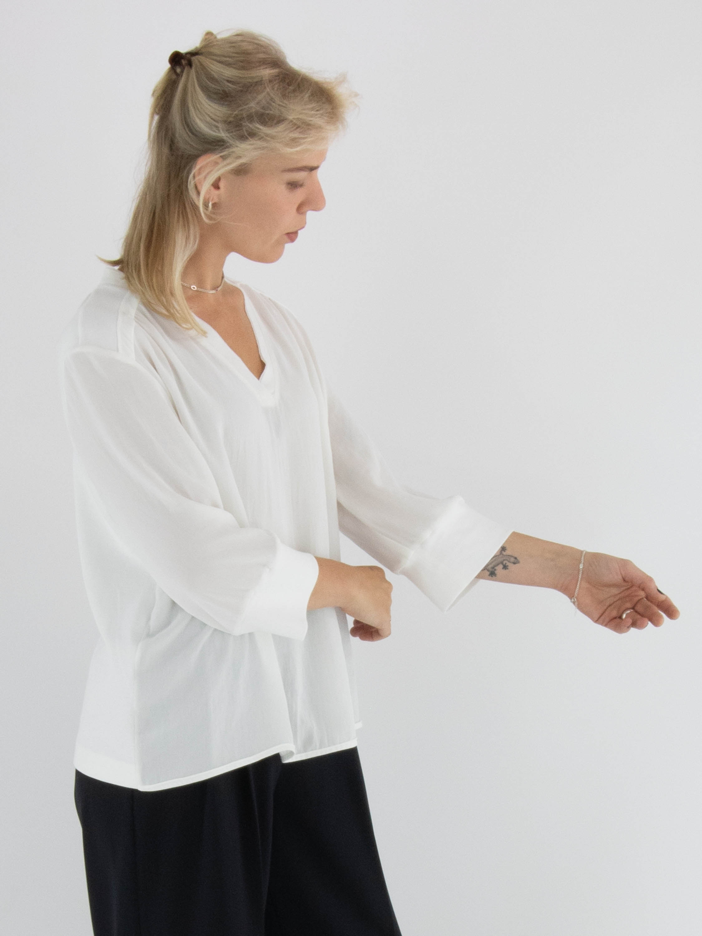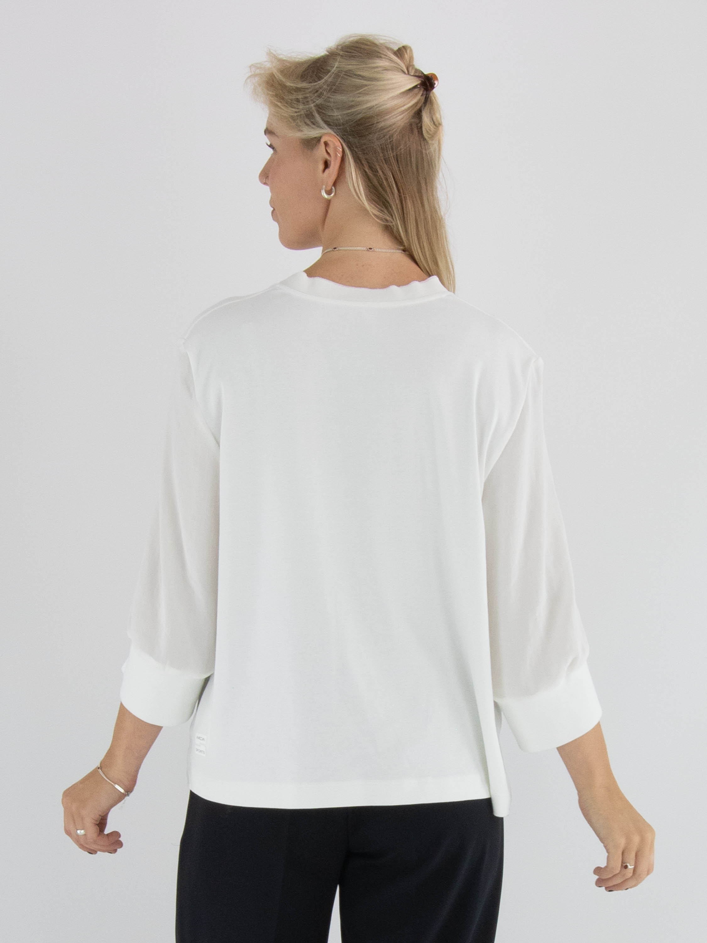 Een shirt van Marc Cain in de kleur roomwit. Aan de uiteinden van de halflange mouwen zit een fijn geribbelde tricotboord. Langs de rand van de V-hals loopt een dubbele bies. Dit shirt mag op 30 graden worden gewassen.