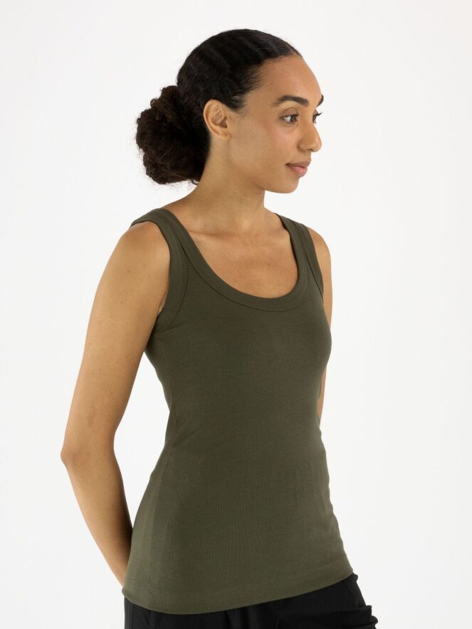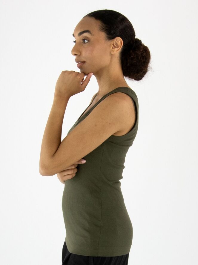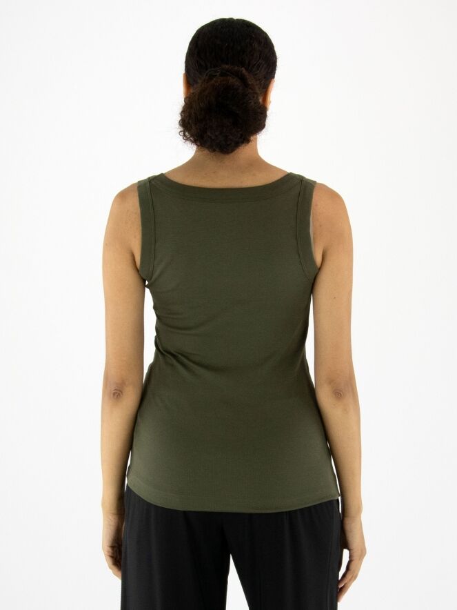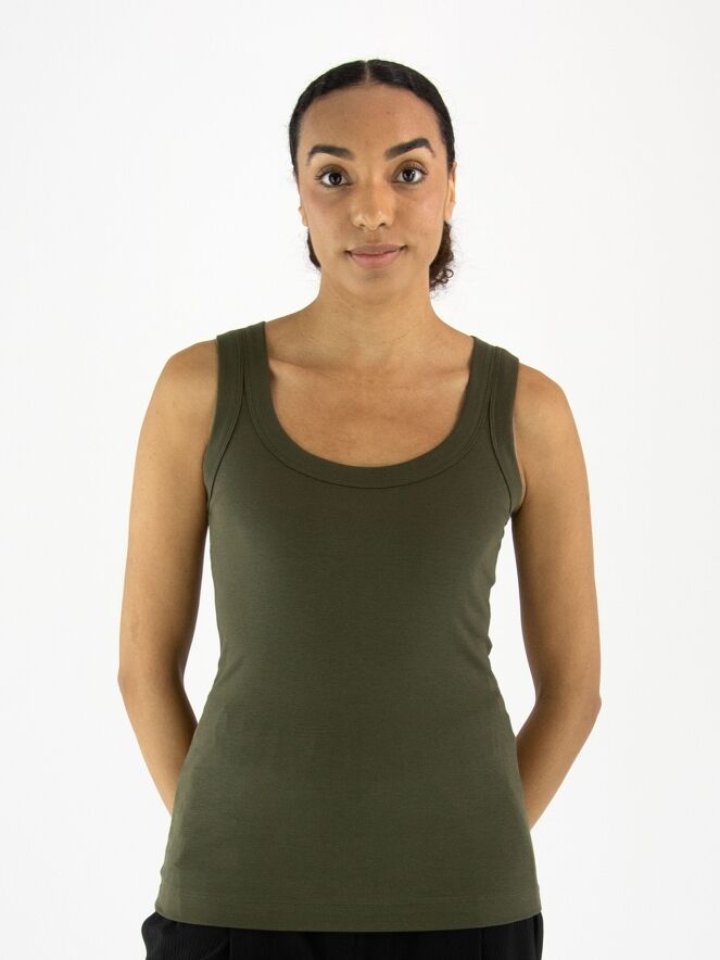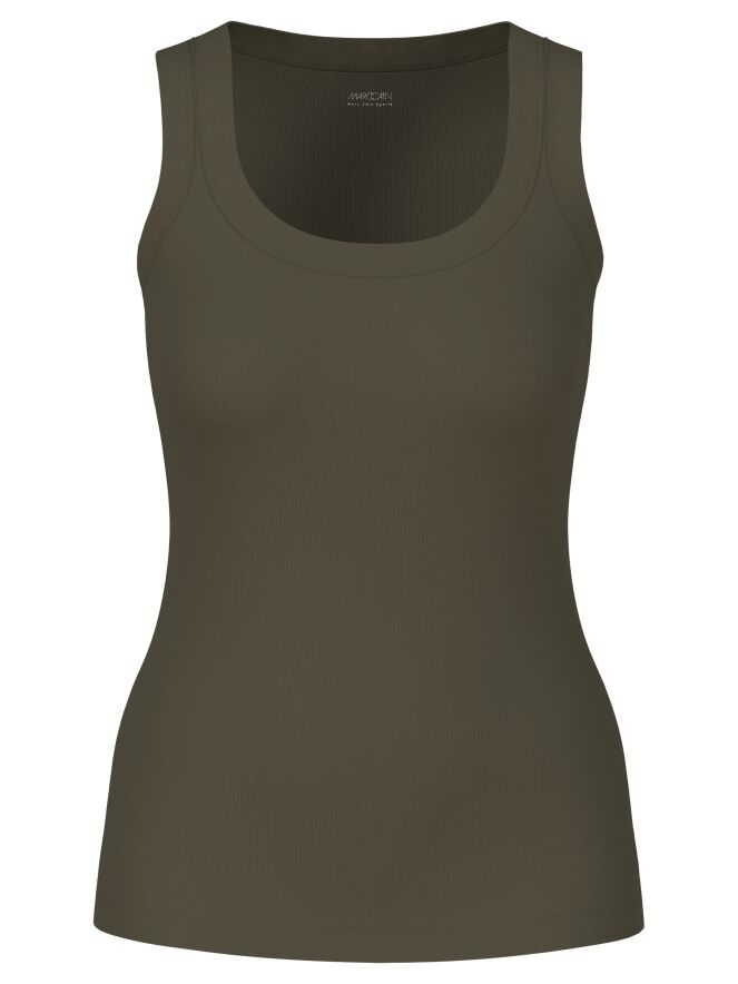Een top van Marc Cain in de kleur olijfgroen. De top heeft een ronde hals en de stof is fijn geribbeld. Deze top mag op 30 graden worden gewassen.