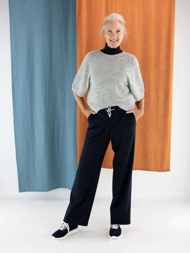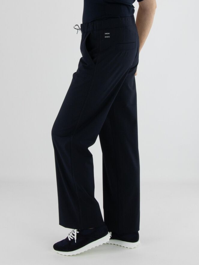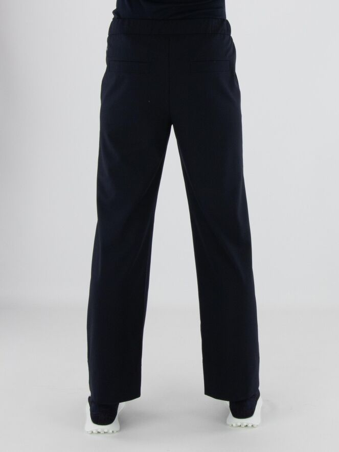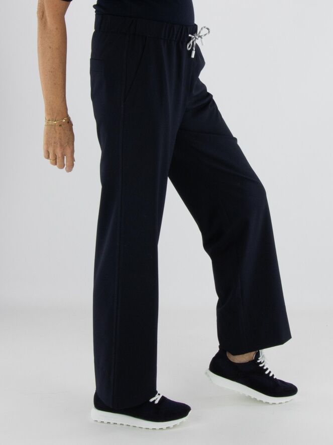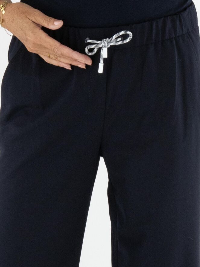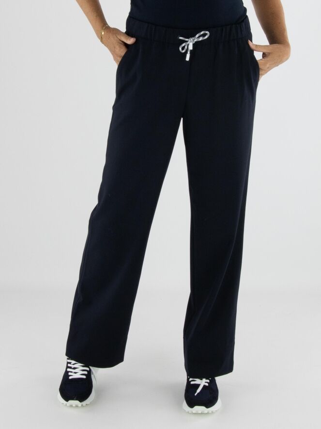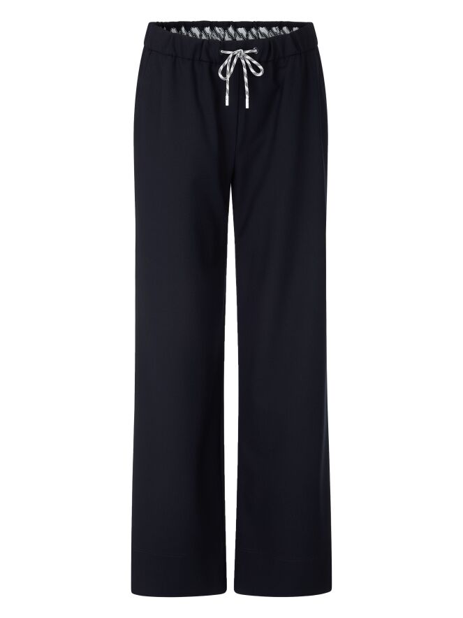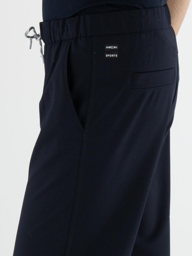 Een joggingbroek van Marc Cain in de kleur marineblauw. In de taille bevindt zich een geplooide elastische band met een koord in een tunnelverwerking. Tien centimeter boven de zoom van de pijpen loopt een dubbele stiknaad. De broek heeft steekzakken en mag op 30 graden worden gewassen.
