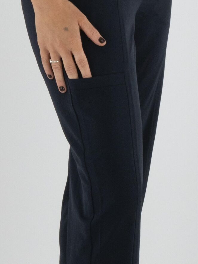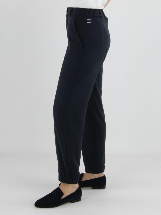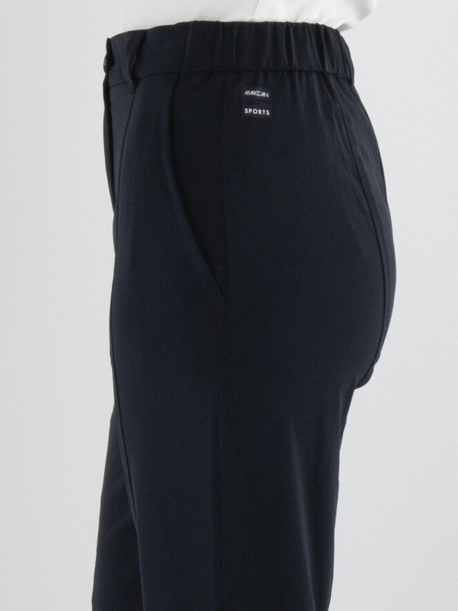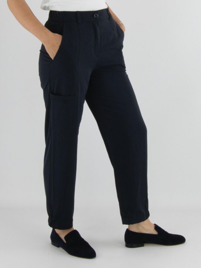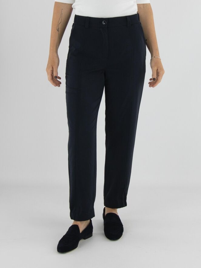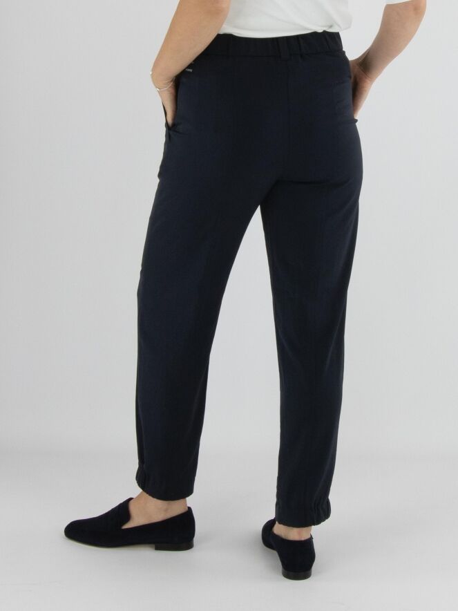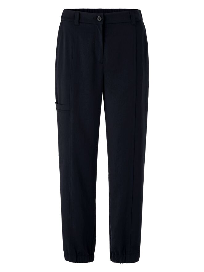 Een cargobroek van Marc Cain in een marineblauwe kleur. In de taille loopt vanaf de zijkanten naar de achterkant een fijn geplooide elastische band. Aan de onderkant van de pijpen zit eveneens een fijn geplooide elastische band. De broek heeft steekzakken en mag op 30 graden worden gewassen.