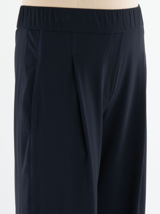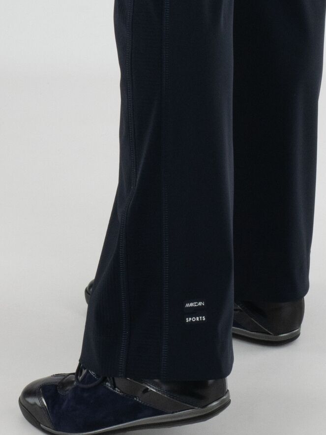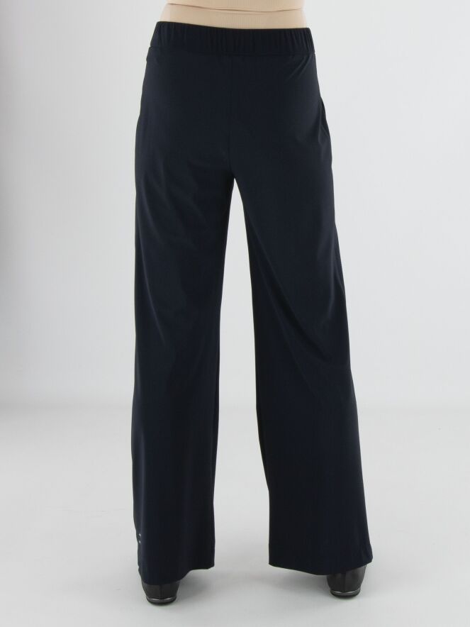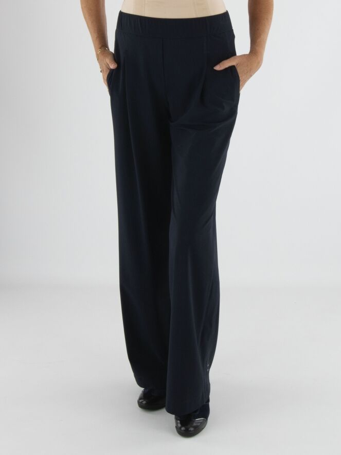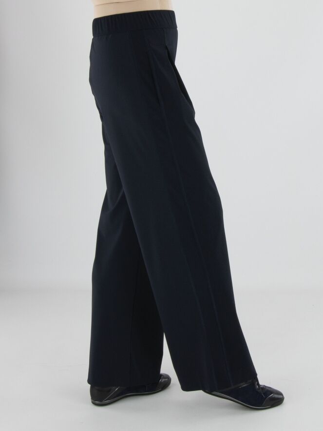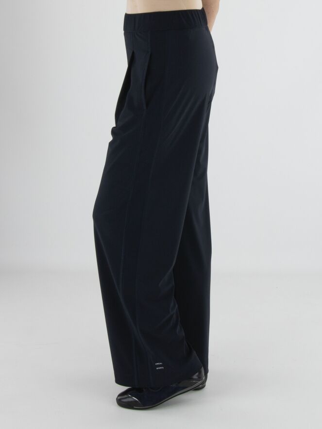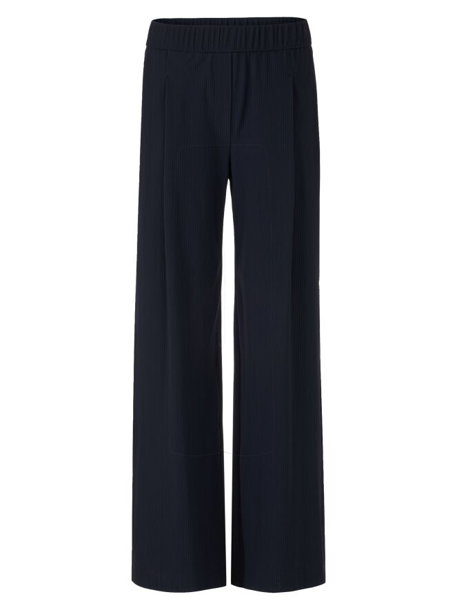 Een wijde broek van Marc Cain met aan de voorzijde een krijtstreepstructuur en aan de achterzijde een uni stof. In de tailleband zit een elastische band. De broek heeft bandplooien en steekzakken. Deze broek mag op 30 graden worden gewassen.