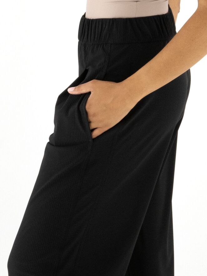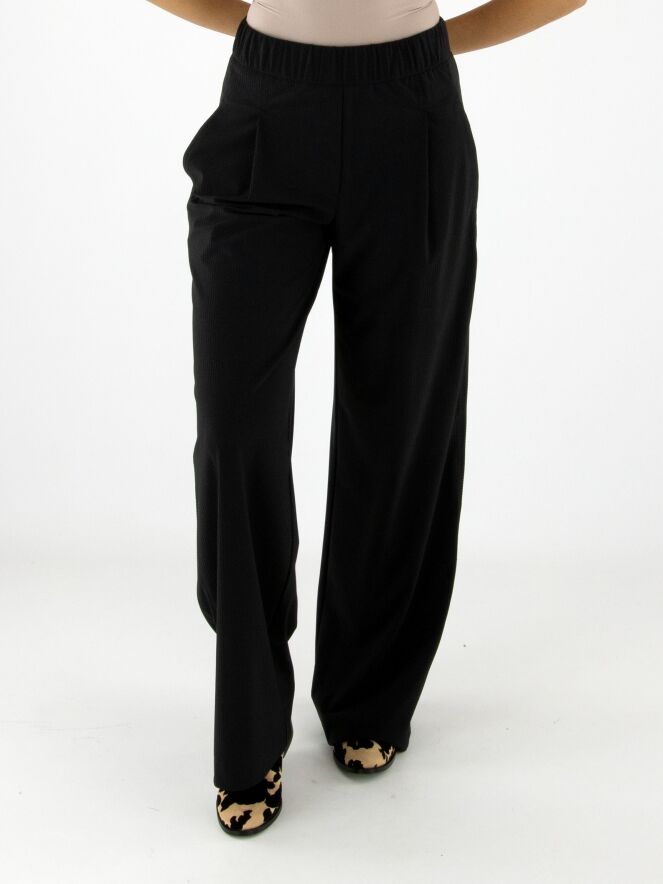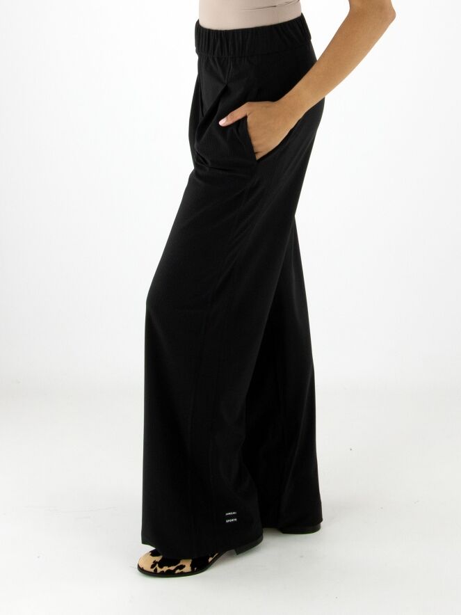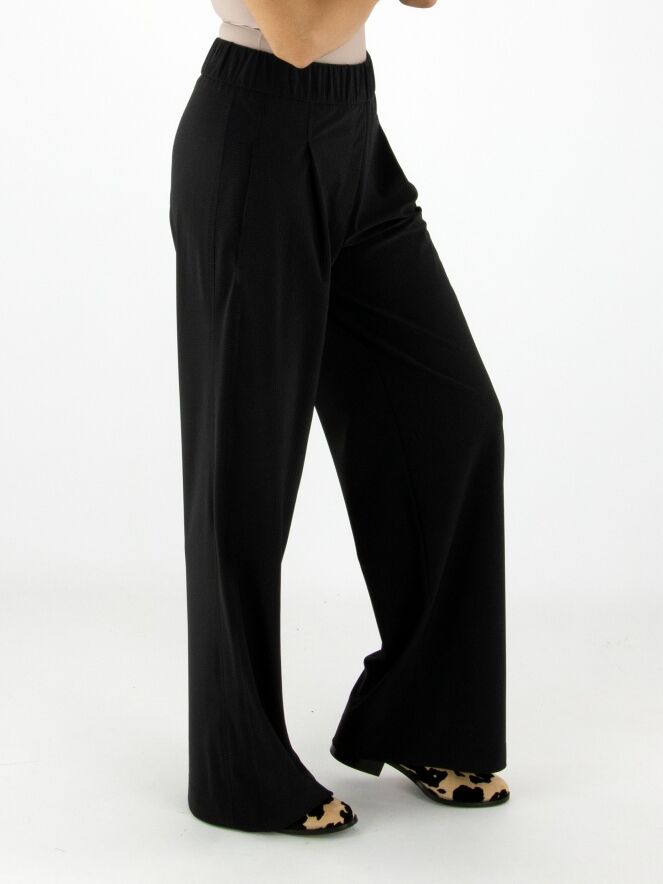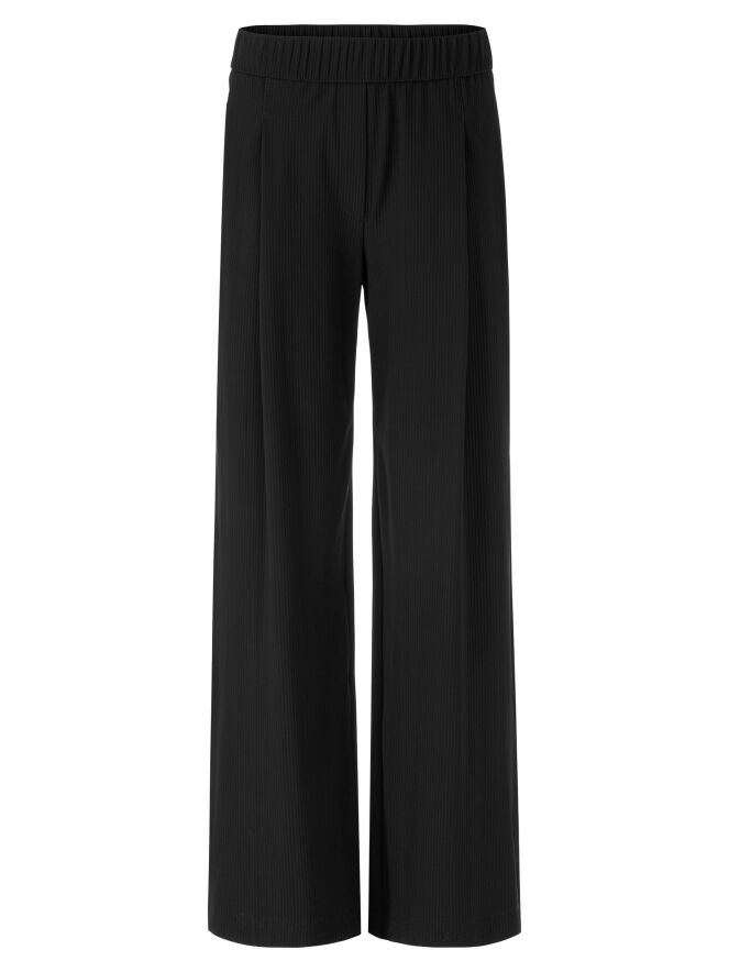 Een wijde broek van Marc Cain in de kleur zwart, met aan de voorzijde een krijtstreepstructuur en aan de achterzijde een uni stof. In de tailleband zit een elastische band. De broek heeft bandplooien en steekzakken. Deze broek mag op 30 graden worden gewassen.