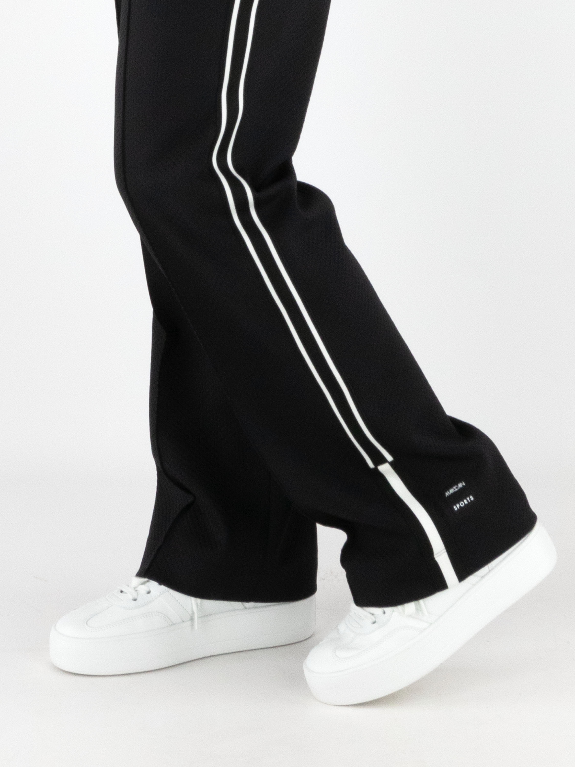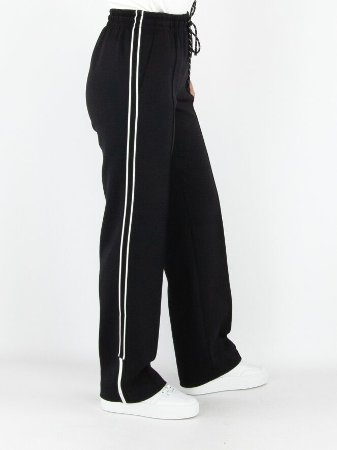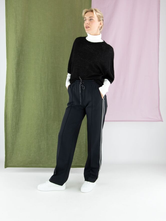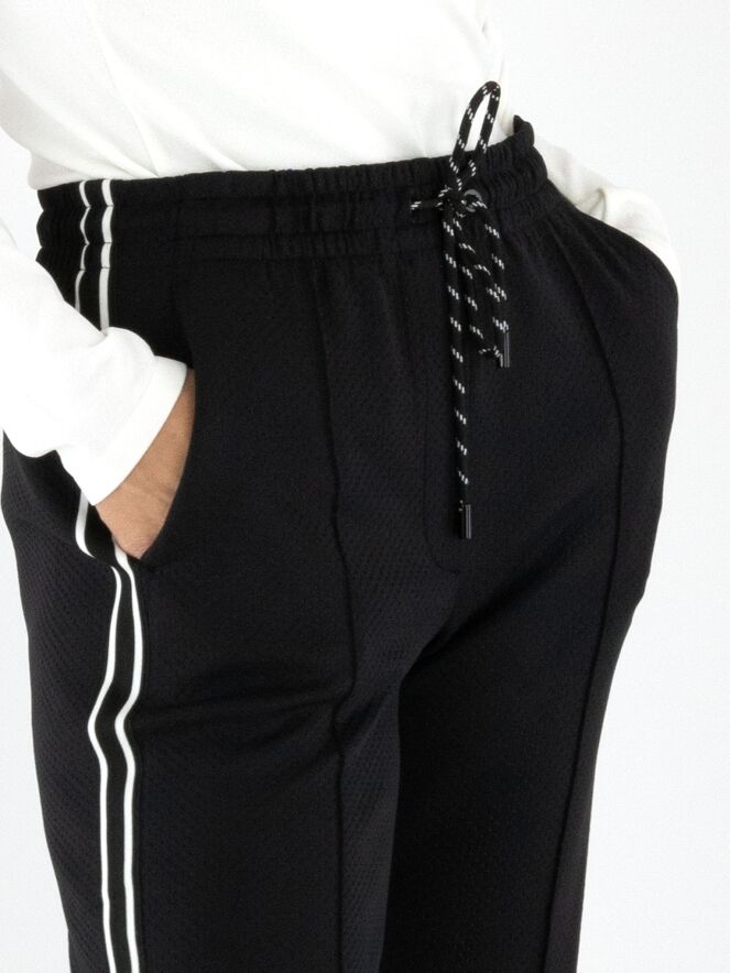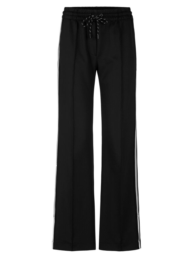 Een joggingbroek van Marc Cain in de kleur zwart. De broek is uitgevoerd in twee lagen stof, waarvan de bovenste laag fijn geperforeerd is. In de taille zit een brede elastische band met een koord in een tunnelverwerking. Langs de zijkanten van de pijpen loopt een bies met een zwart-wit strepenpatroon. De broek heeft steekzakken en mag op 30 graden worden gewassen.