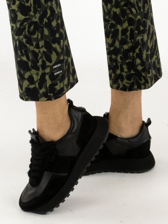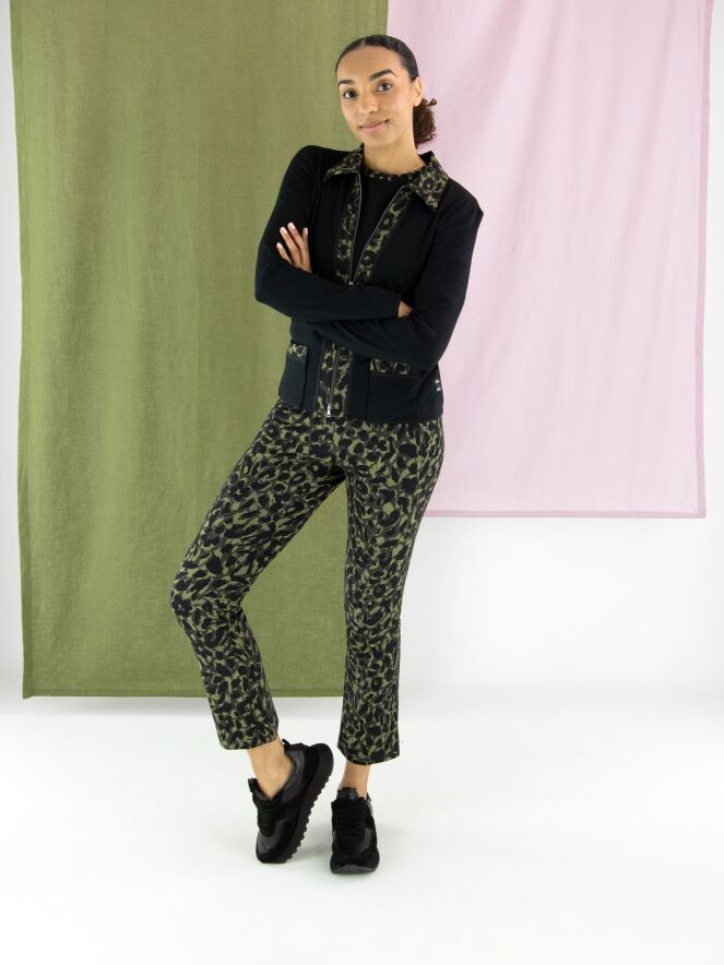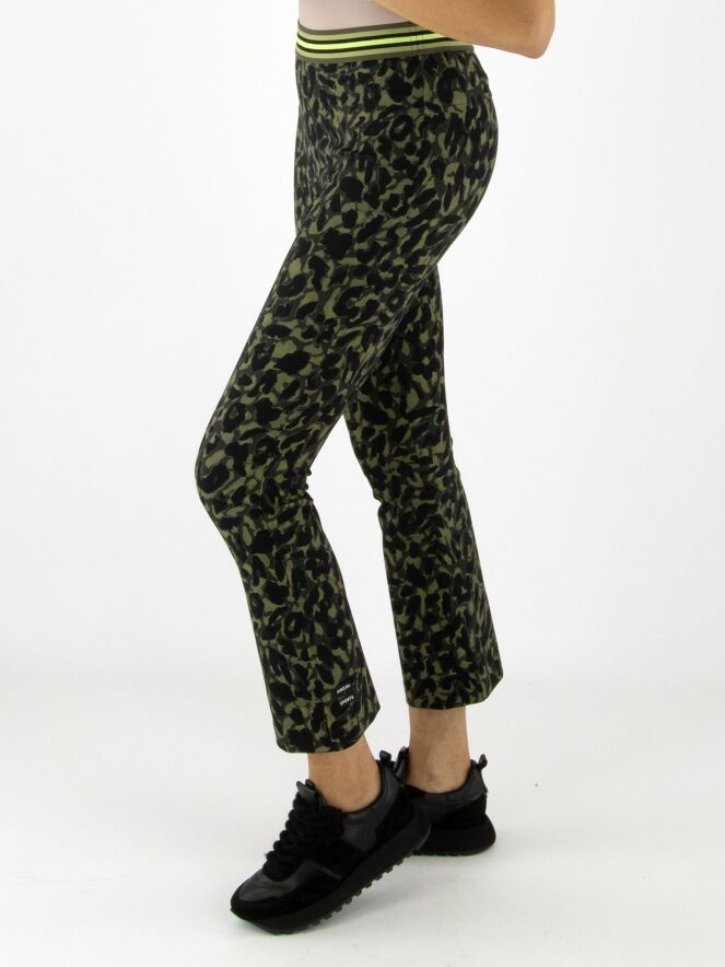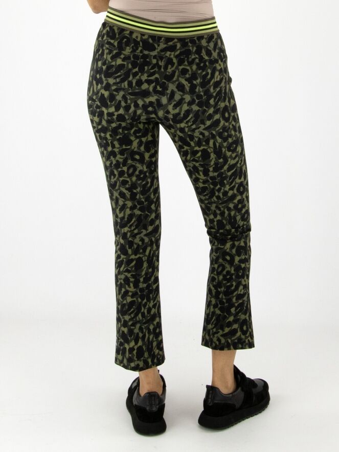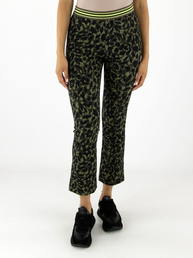 Een broek van Marc Cain in een grafische print met meerdere tinten olijfgroen en zwart. In de taille zit een elastische band in een strepenpatroon met de kleuren limoengroen, olijfgroen en zwart. Deze broek mag op 30 graden worden gewassen.