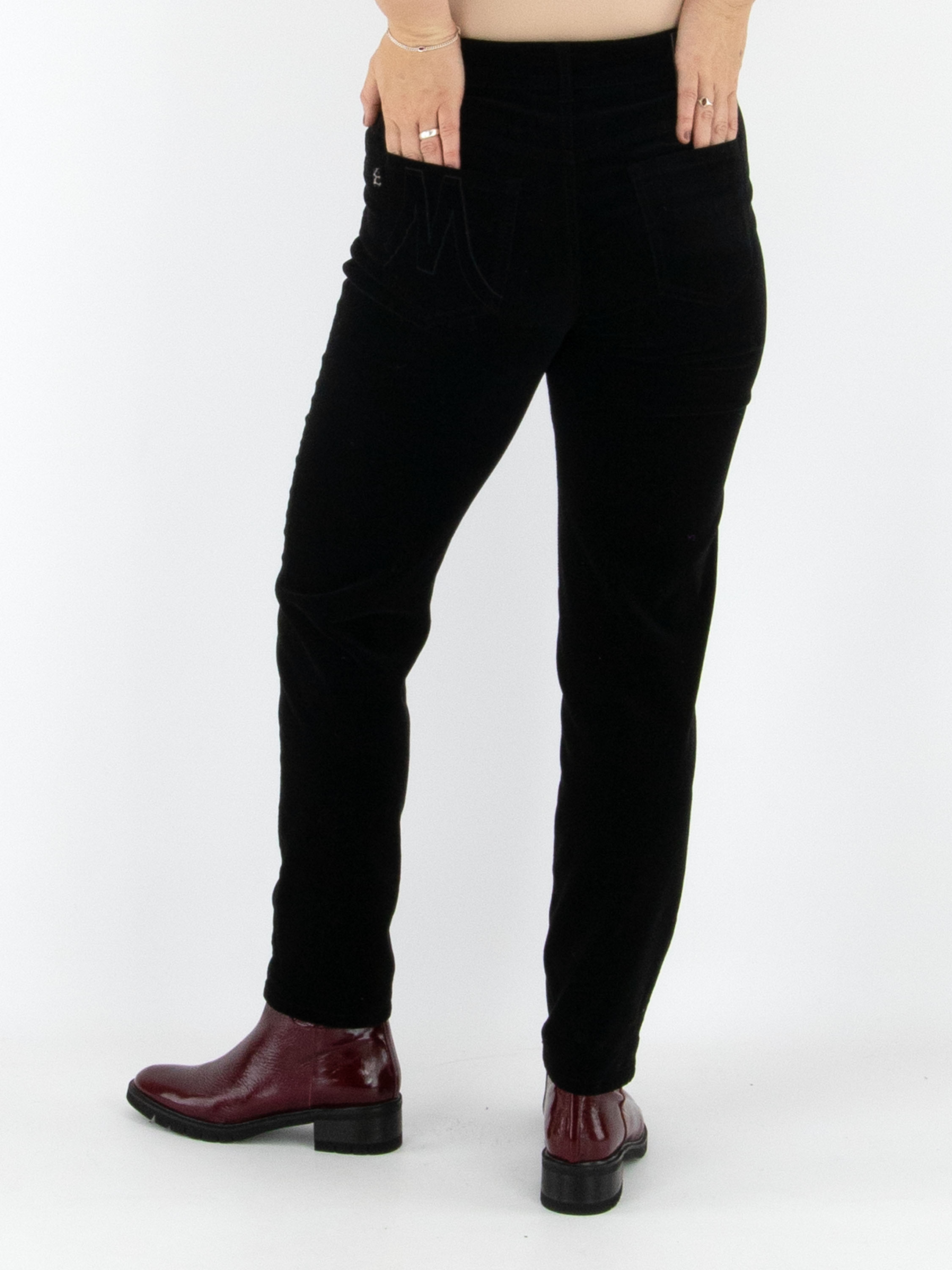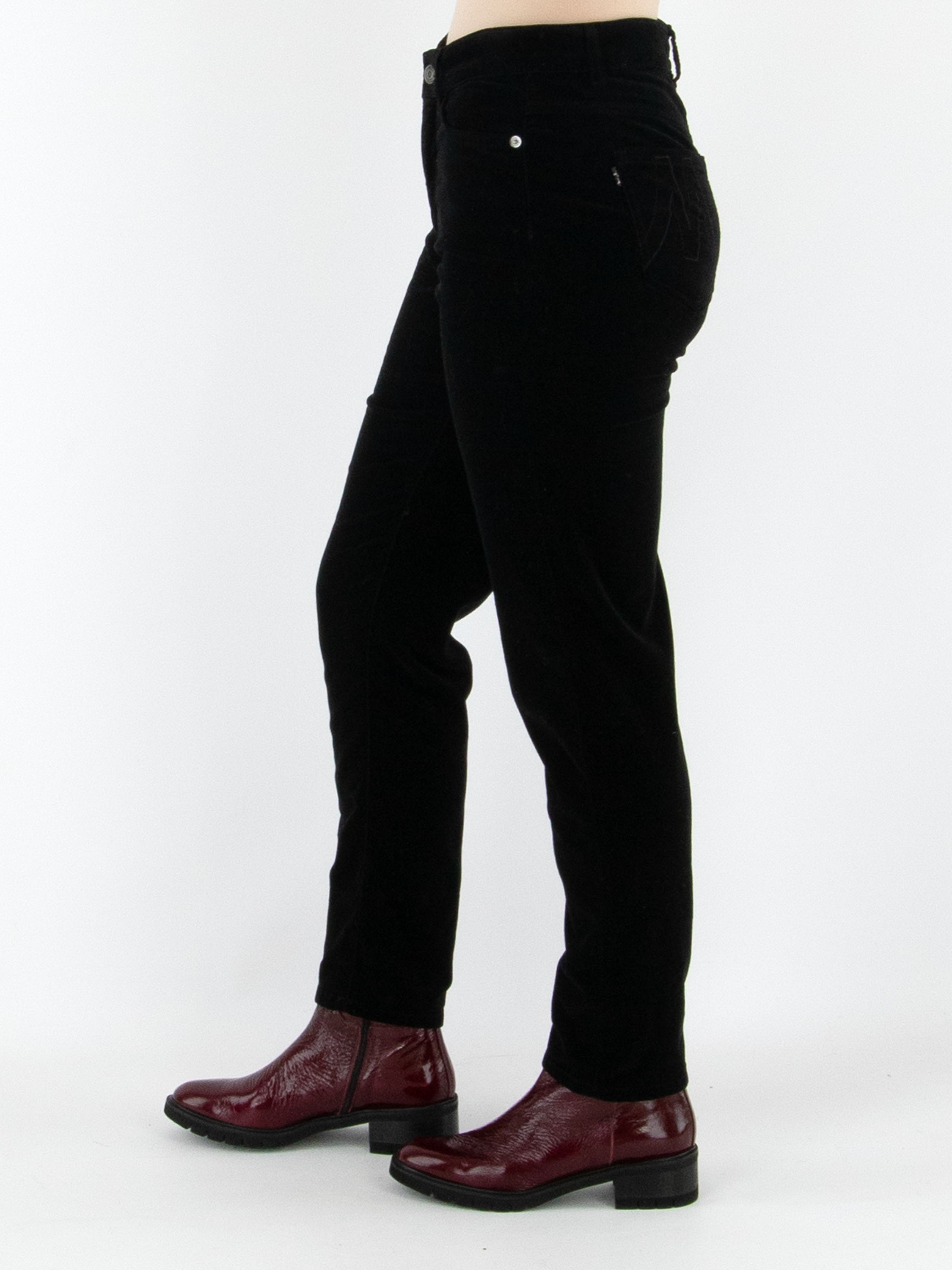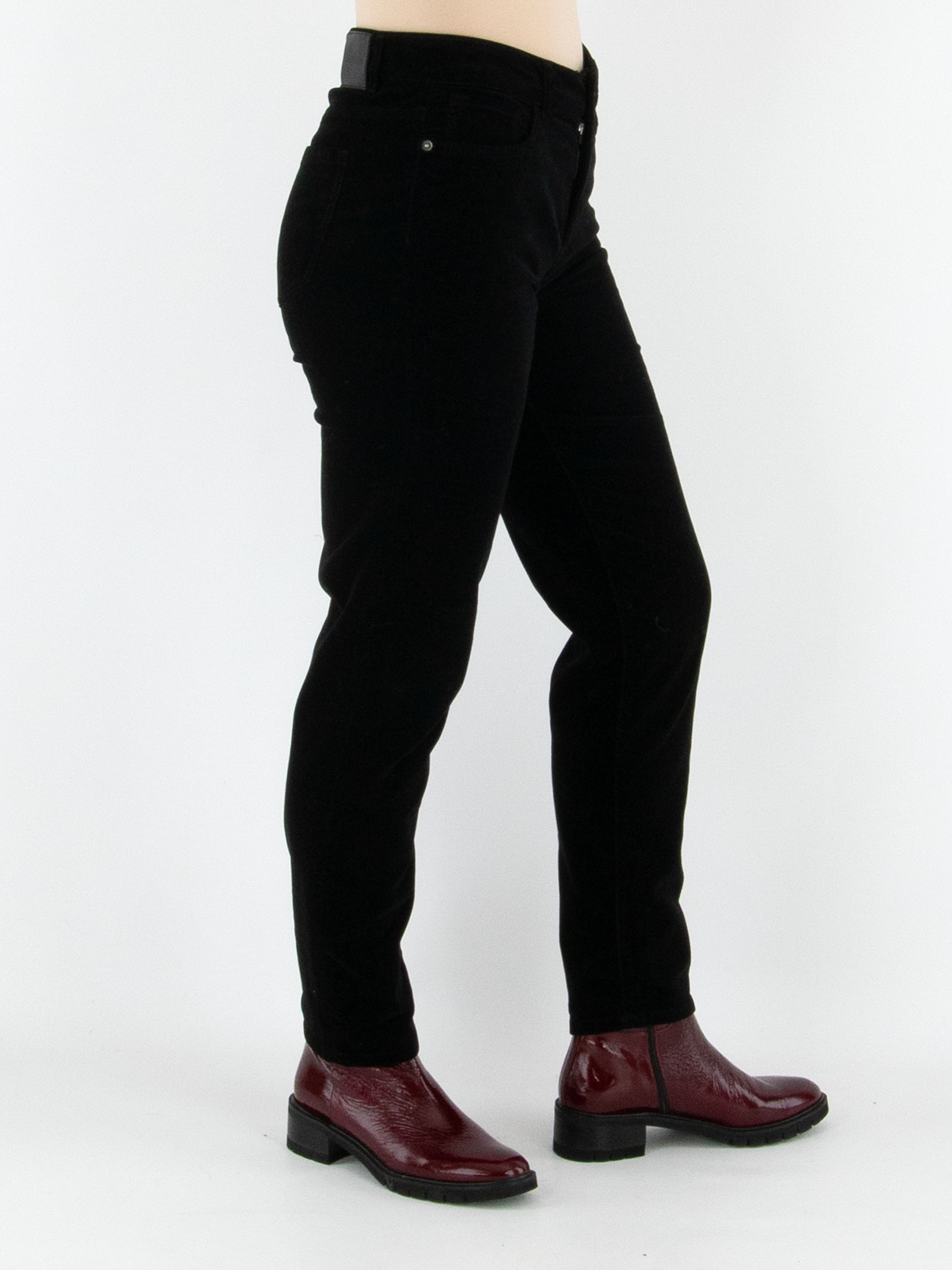 Een velourbroek van Marc Cain in de kleur zwart. De broek is uitgevoerd in een klassiek 5-pocket model en kan op 30 graden worden gewassen.
