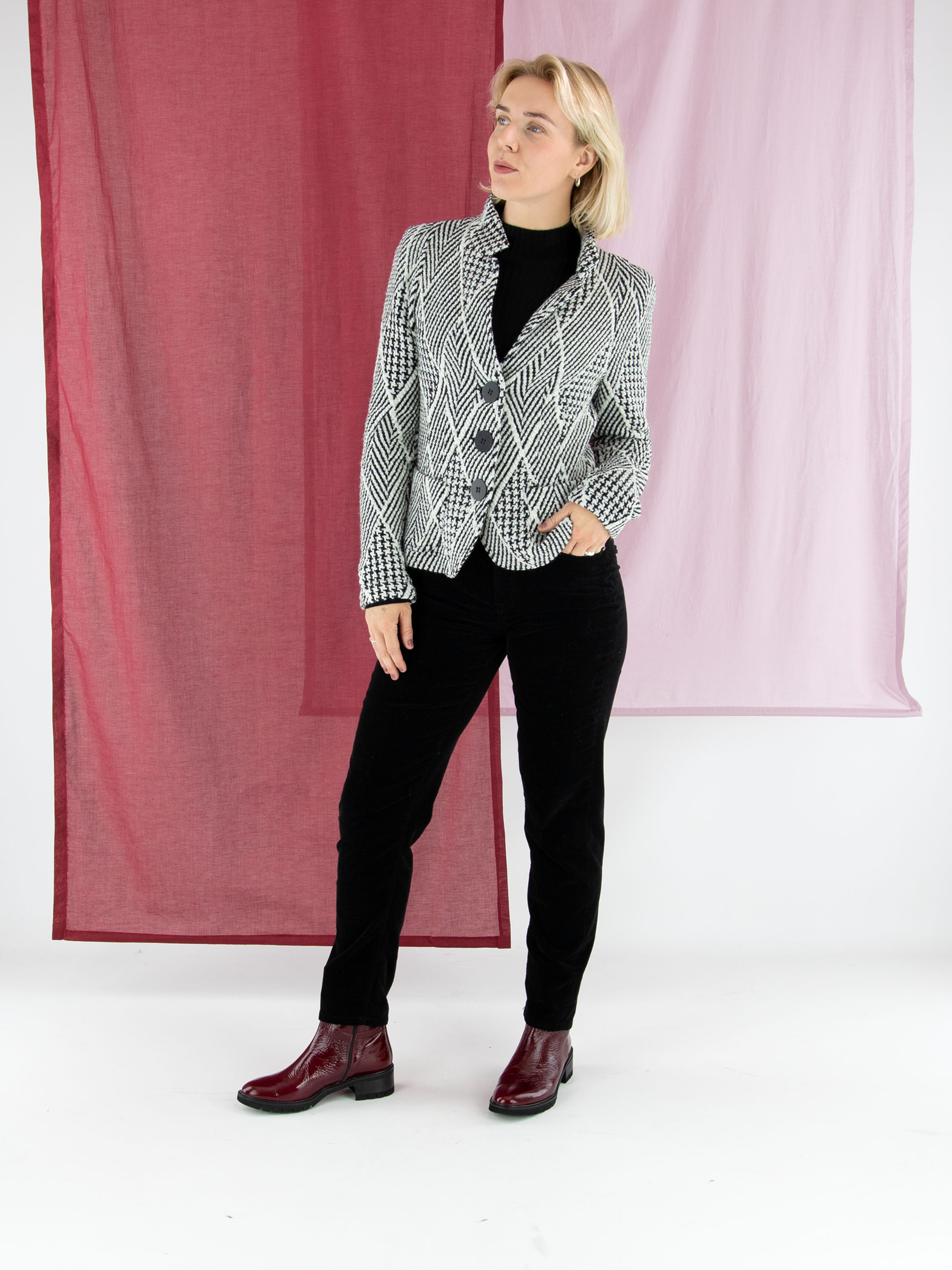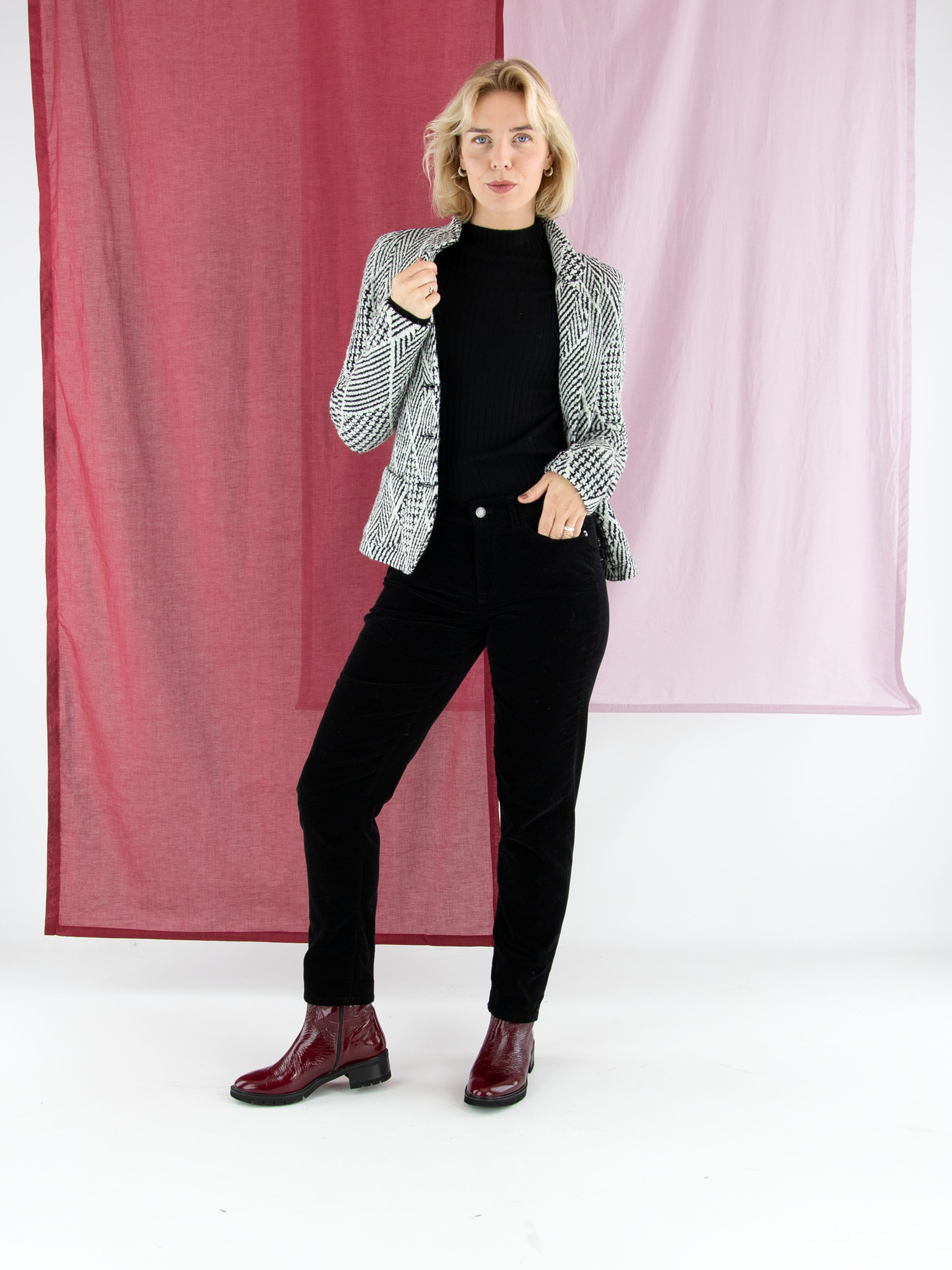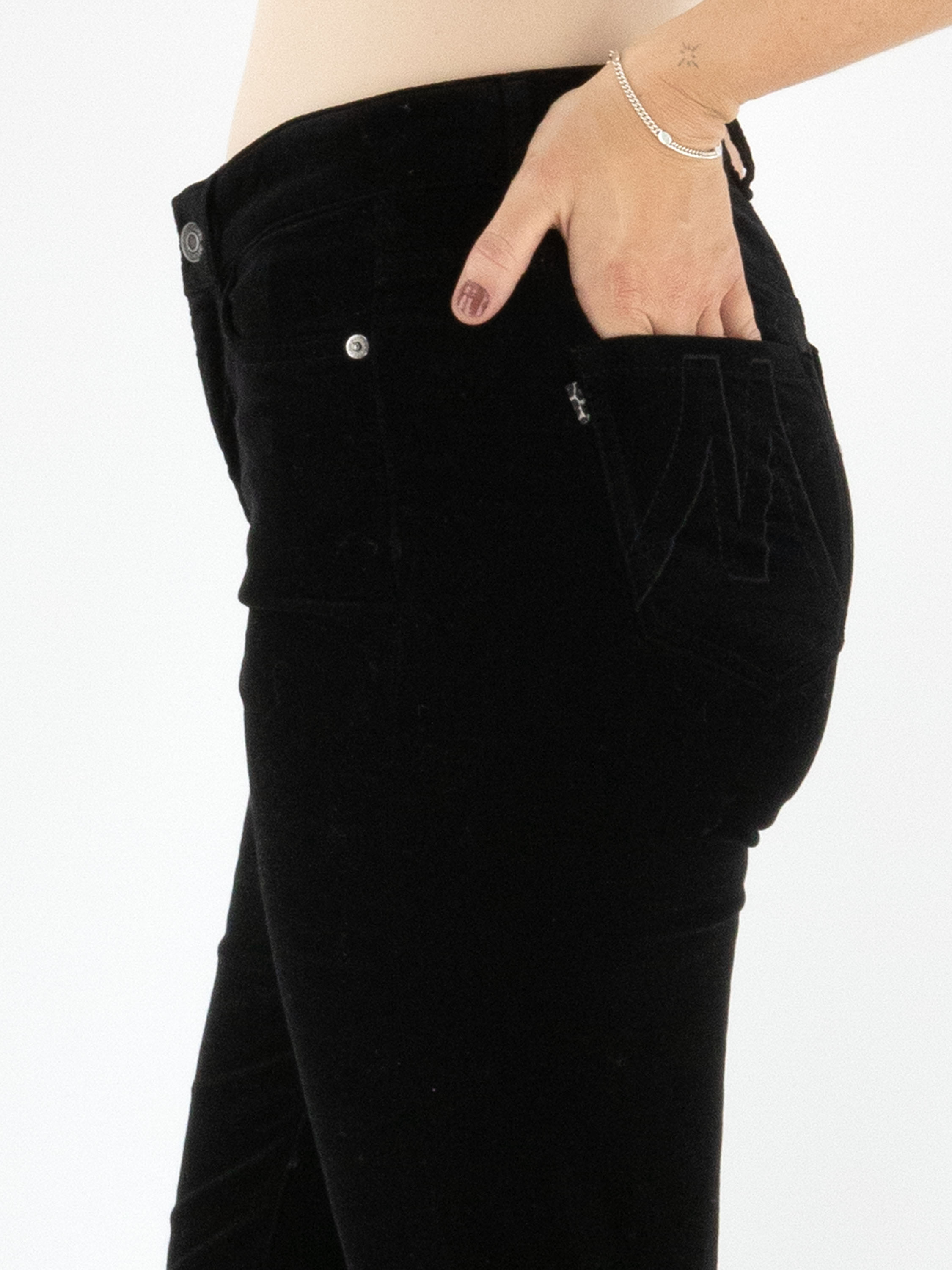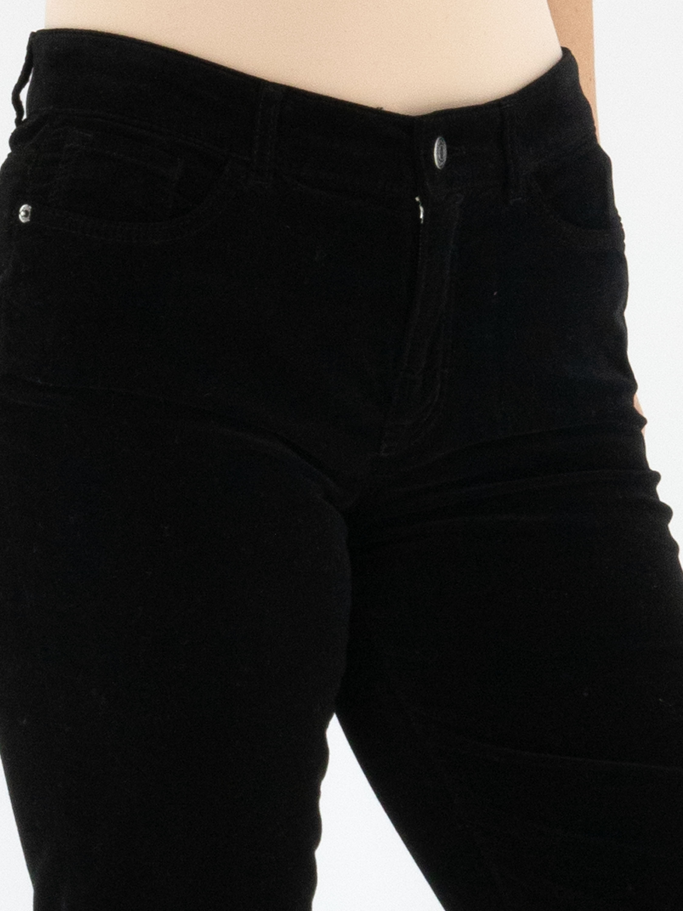 Een velourbroek van Marc Cain in de kleur zwart. De broek is uitgevoerd in een klassiek 5-pocket model en kan op 30 graden worden gewassen.