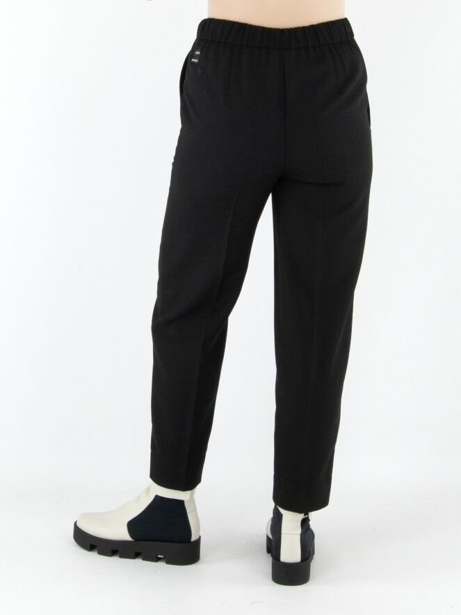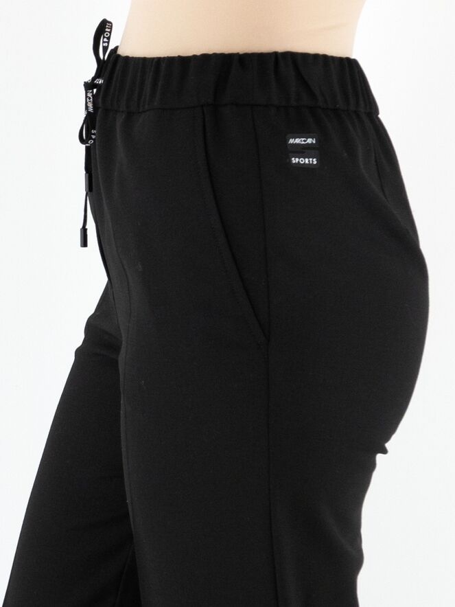 Een broek in jogginglook van Marc Cain in de kleur zwart. In de taille zit een fijn geplooide elastische band met een koord in een tunnelverwerking. De broek heeft steekzakken en mag niet worden gewassen.