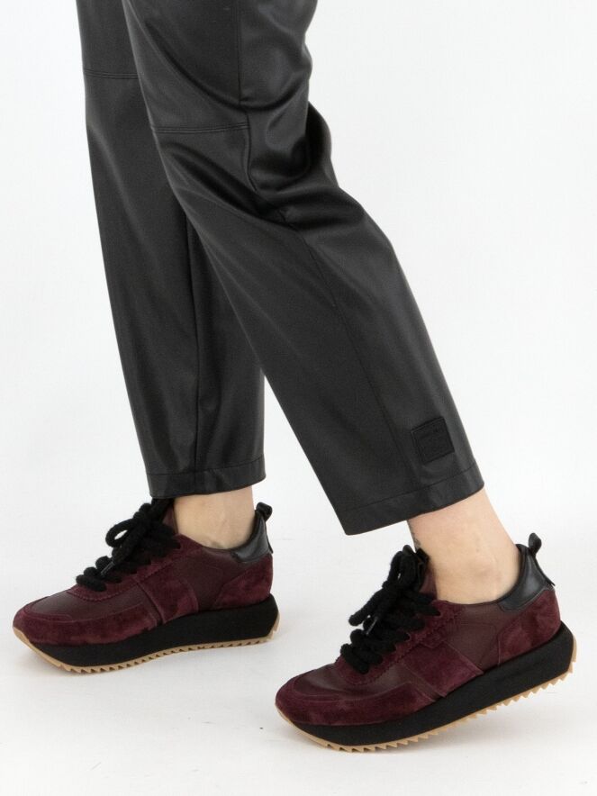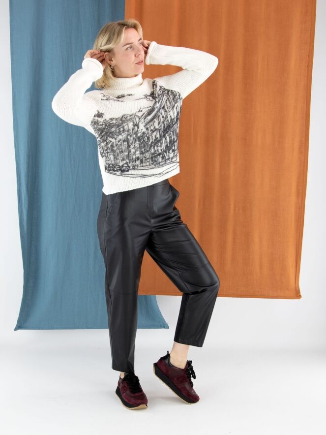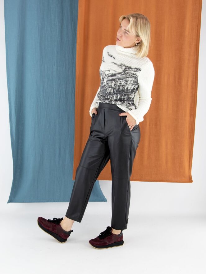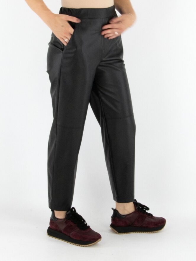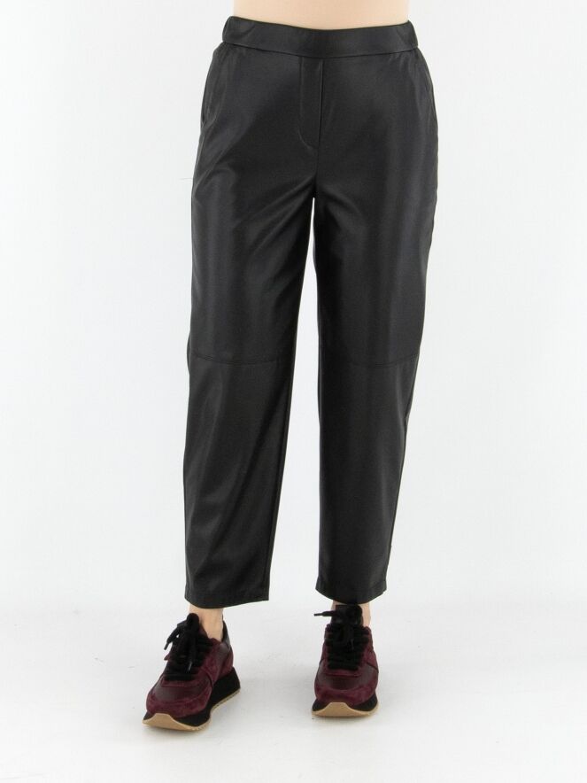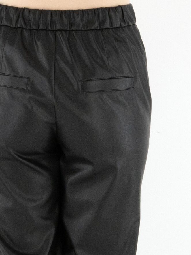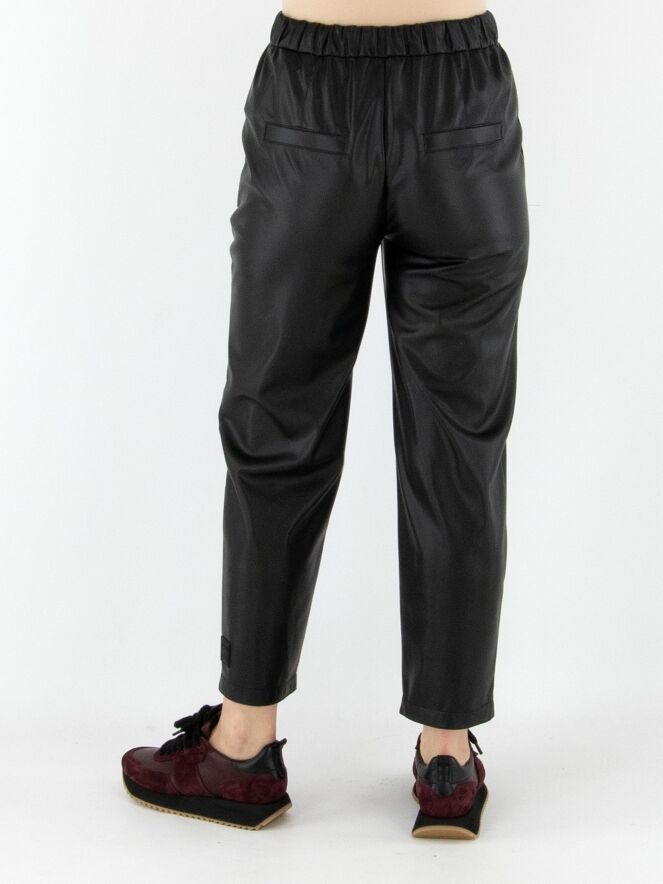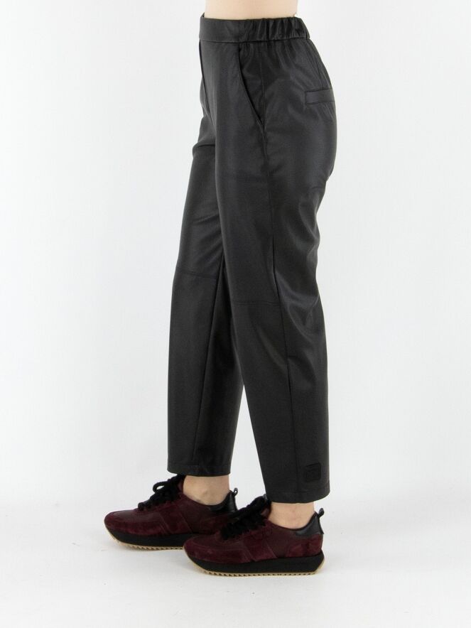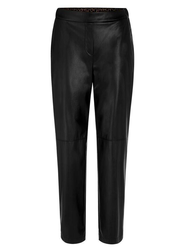 Deze imitatie leren broek van Marc Cain is uitgevoerd in de kleur zwart. In de taille bevindt zich een elastische band die aan de achterzijde fijn geplooid is. De broek heeft steekzakken en kan op 30 graden worden gewassen.