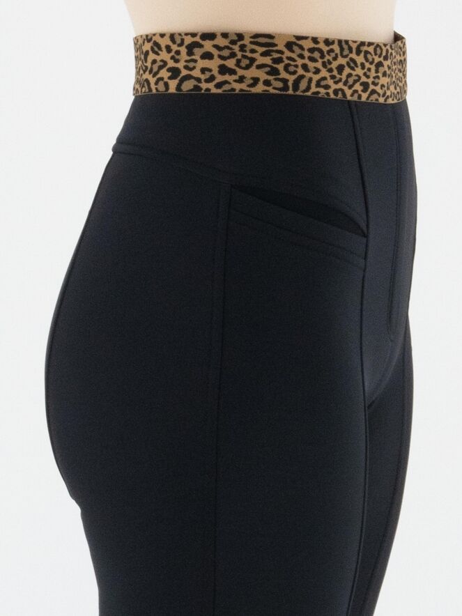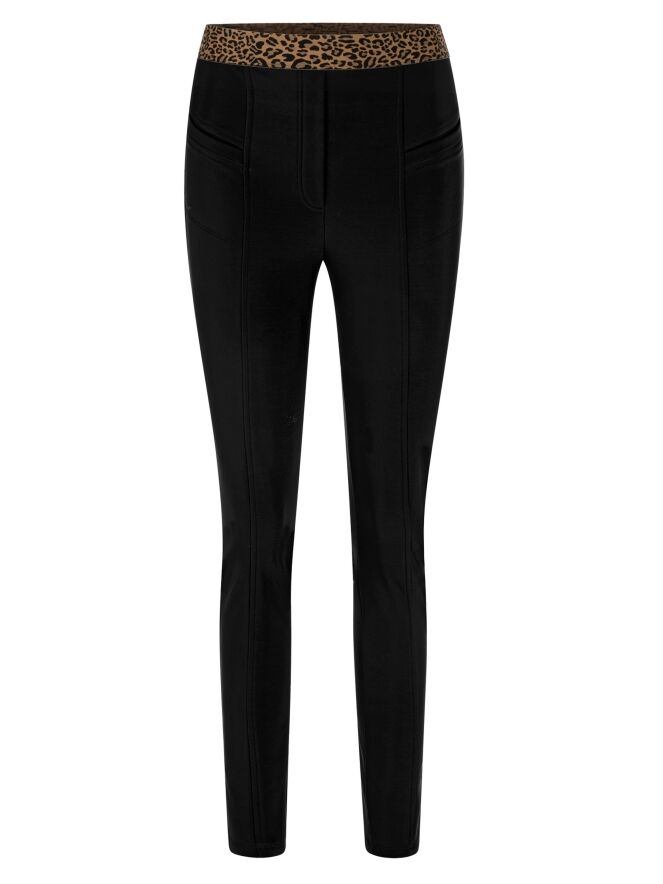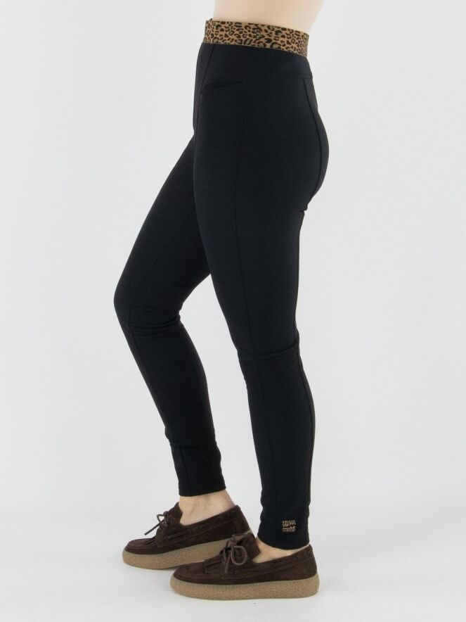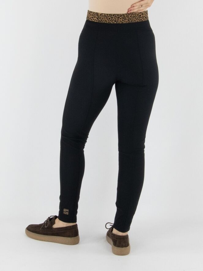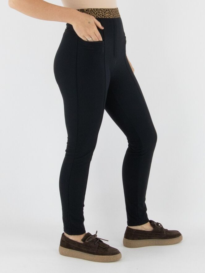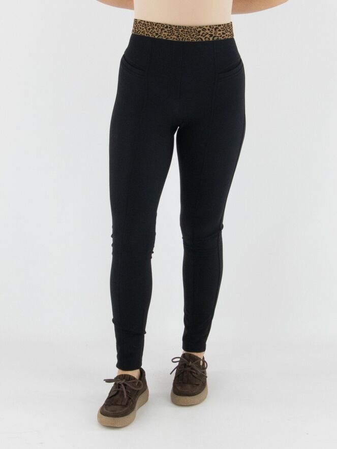 Een legging van Marc Cain in de kleur zwart. In de taille zit een elastische band met een panterprint in bruin en zwart. De legging heeft korte zakken en kan op 30 graden worden gewassen.