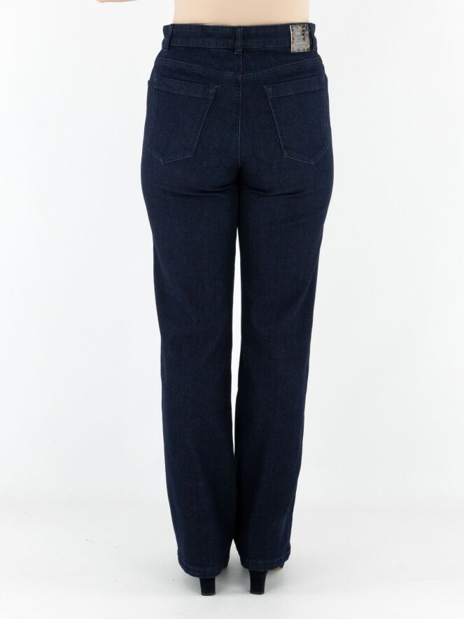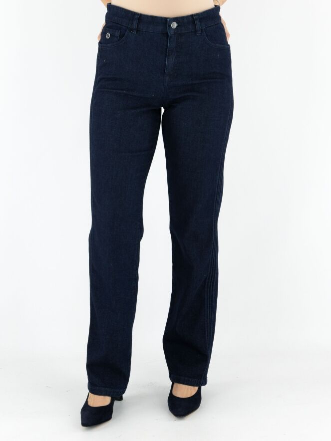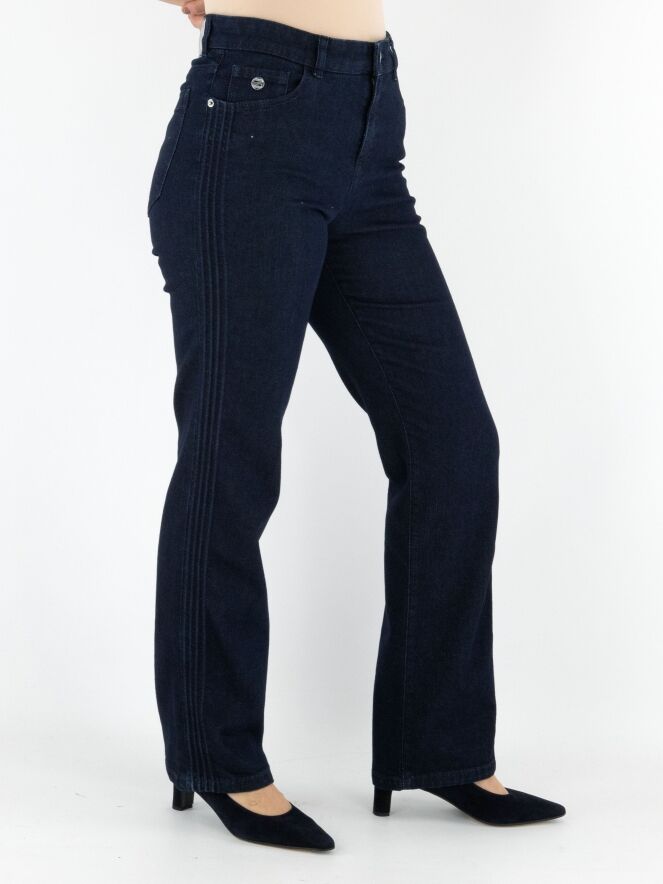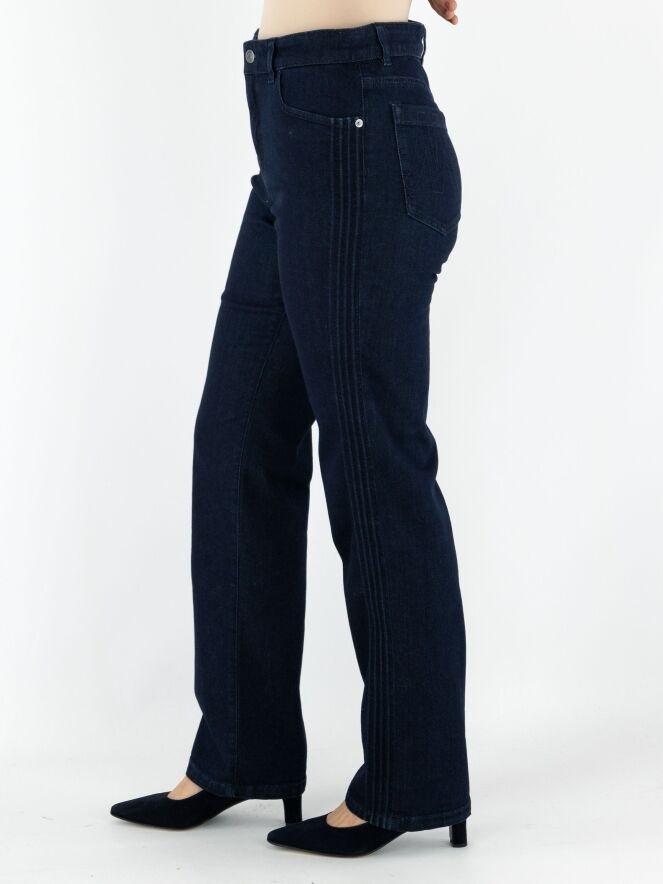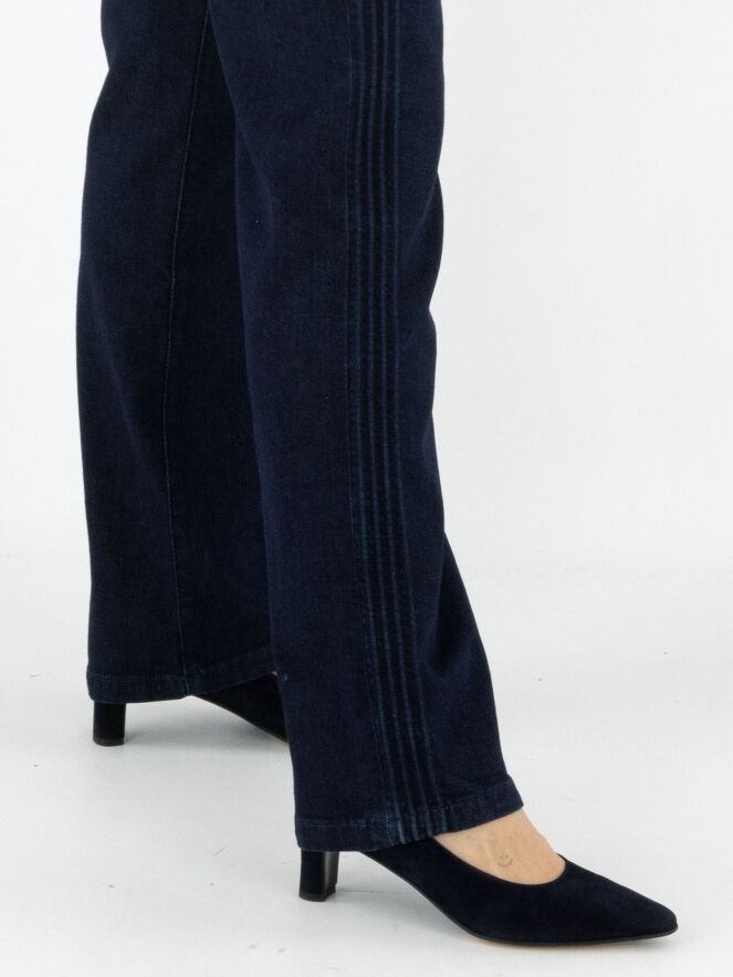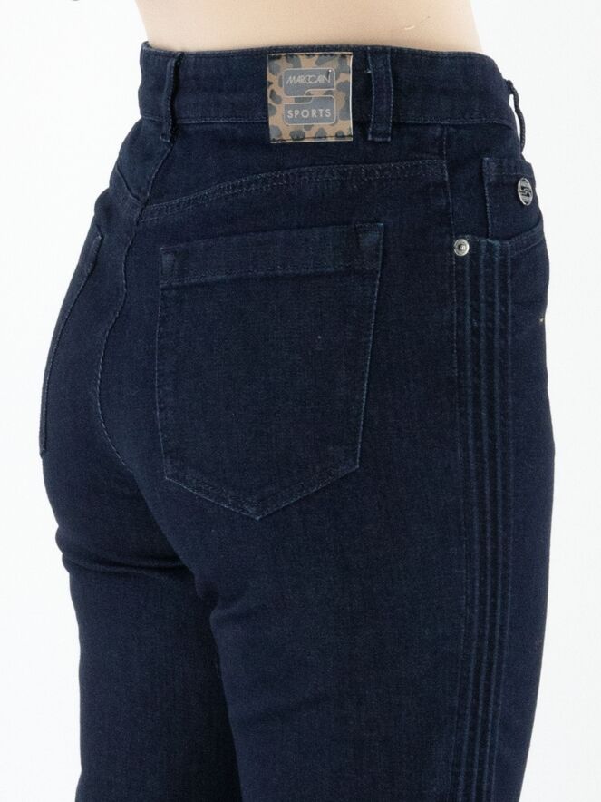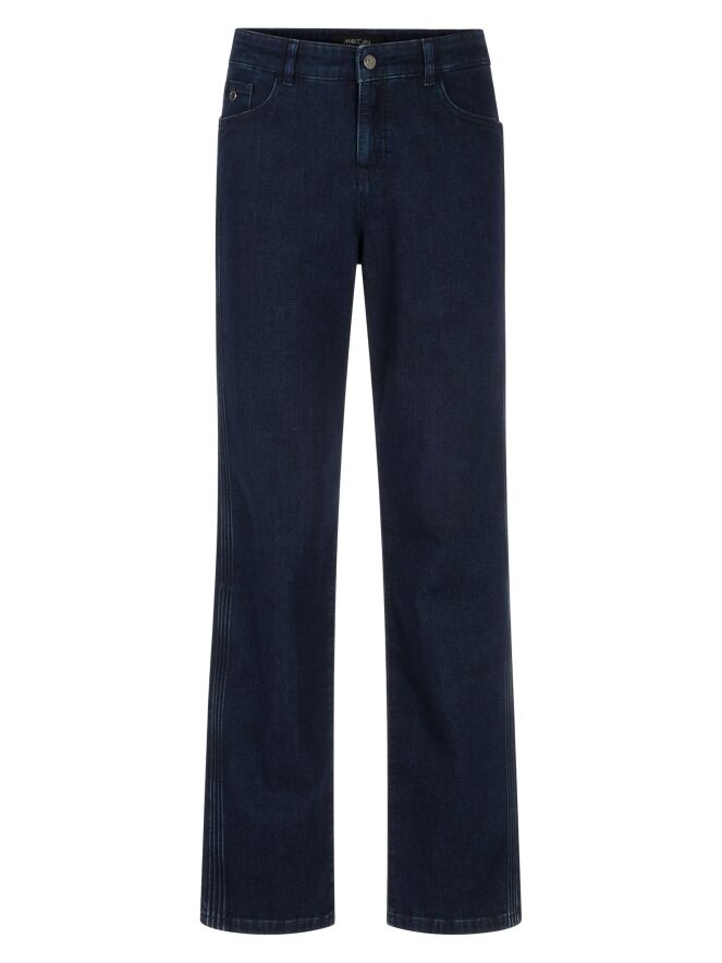 Een dark denim jeans van Marc Cain in een diepe jeanskleur. De jeans is uitgevoerd in een 5-pocket model. Langs de zijkanten lopen vier reliëfbiezen in een ribbelstructuur. Deze jeans kan op 30 graden worden gewassen.