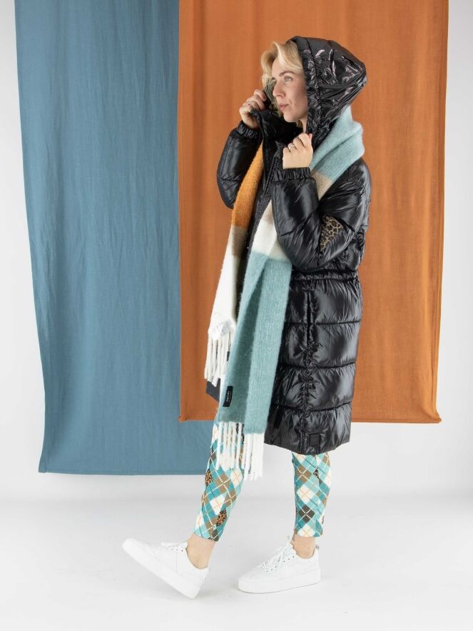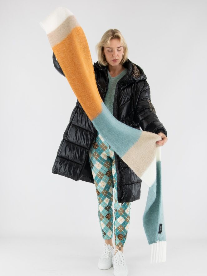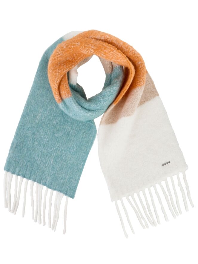 Een luxe lange shawl van Marc Cain, uitgevoerd in kleurvlakken met onder andere oranje, roomwit, turquoise en beige. Aan de uiteinden is de shawl afgewerkt met lange franjes, wat zorgt voor een elegante en speelse uitstraling. Deze shawl kan met de hand worden gewassen.
