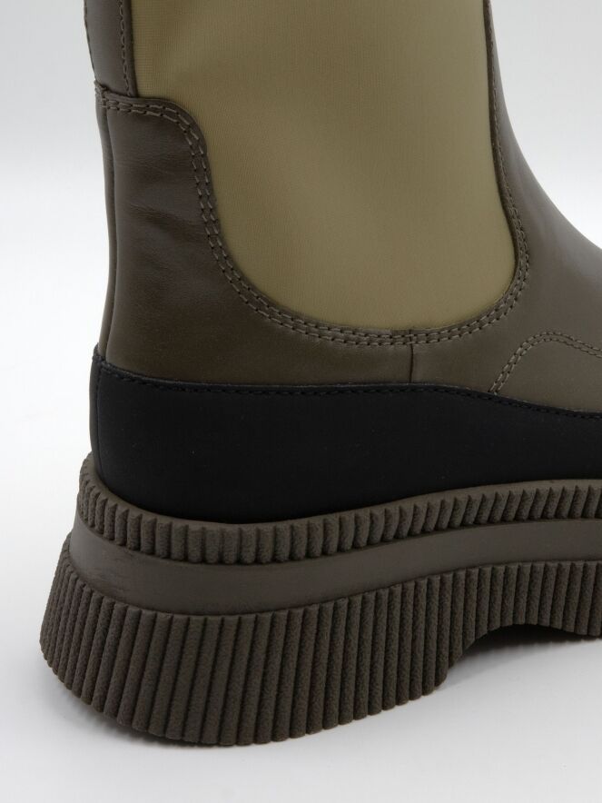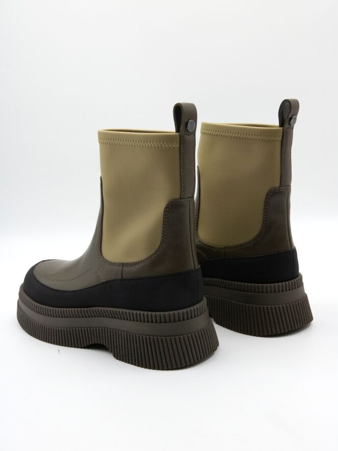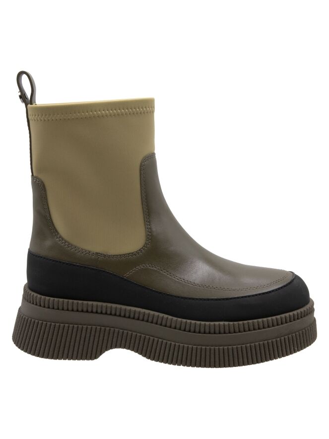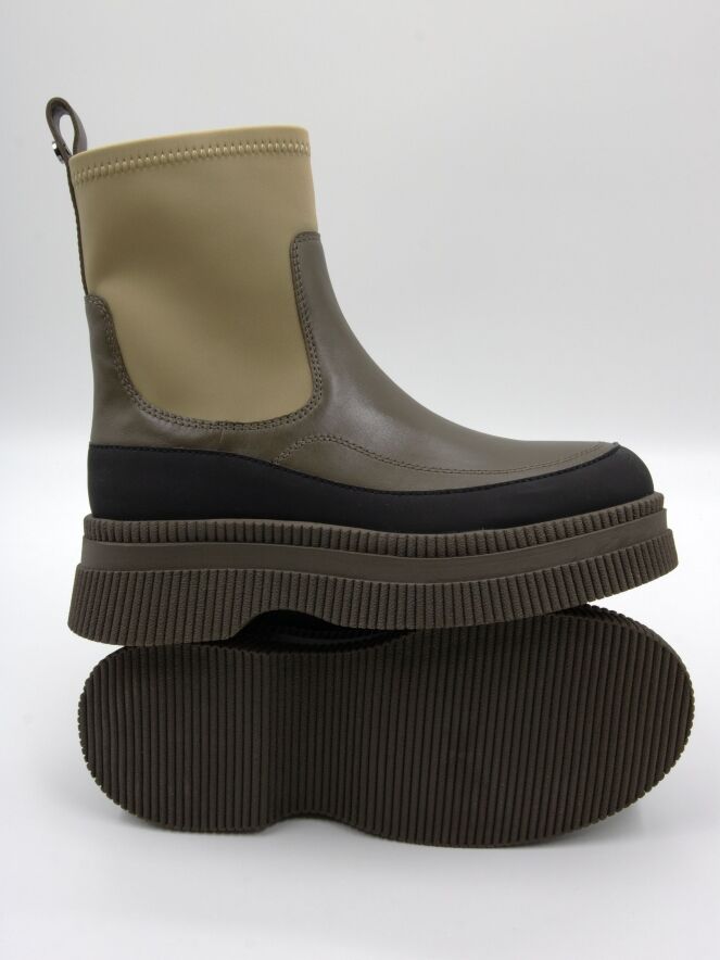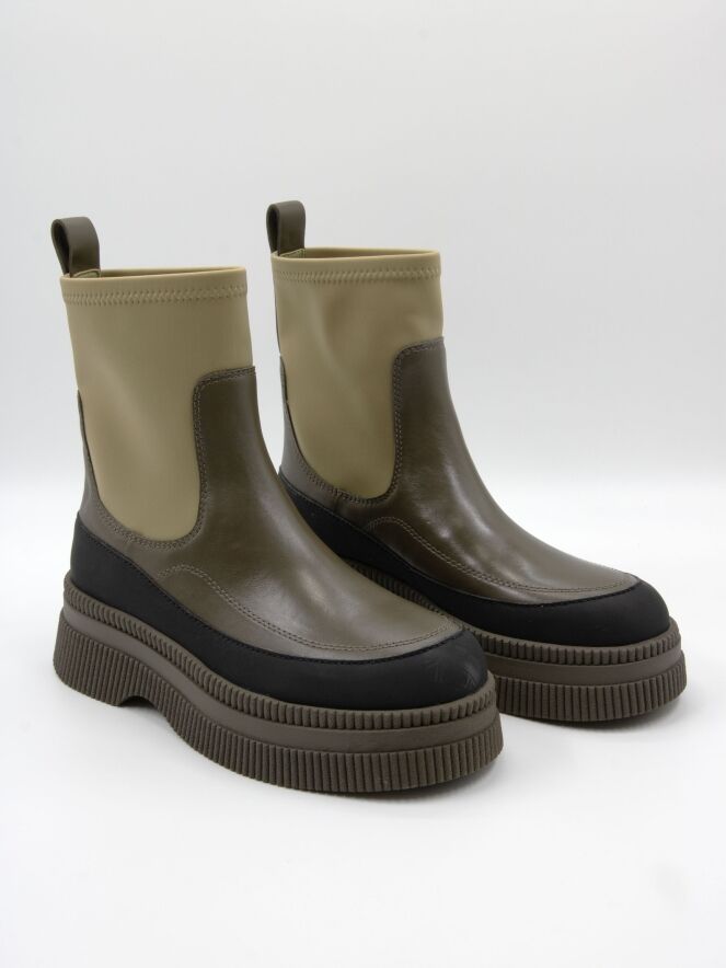 Een enkellaarsje van Marc Cain in meerdere tinten groen met zwart. Langs de rand van de mosgroene, fijn geribbelde zool loopt een band in zwart mat leer. De voorvoet, met een smalle rand naar de hiel, is uitgevoerd in olijfgroen leer. De schacht is pistachegroen en gemaakt van elastische stof.
