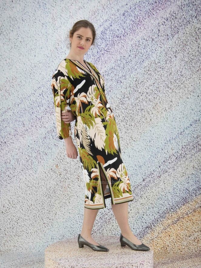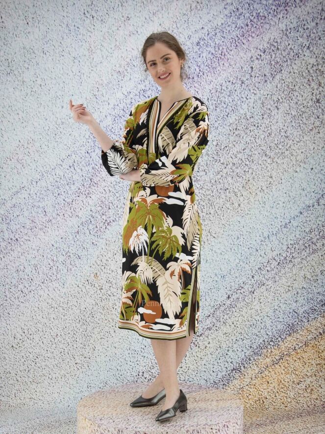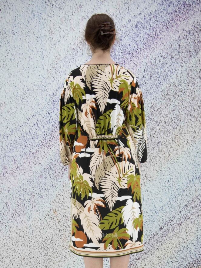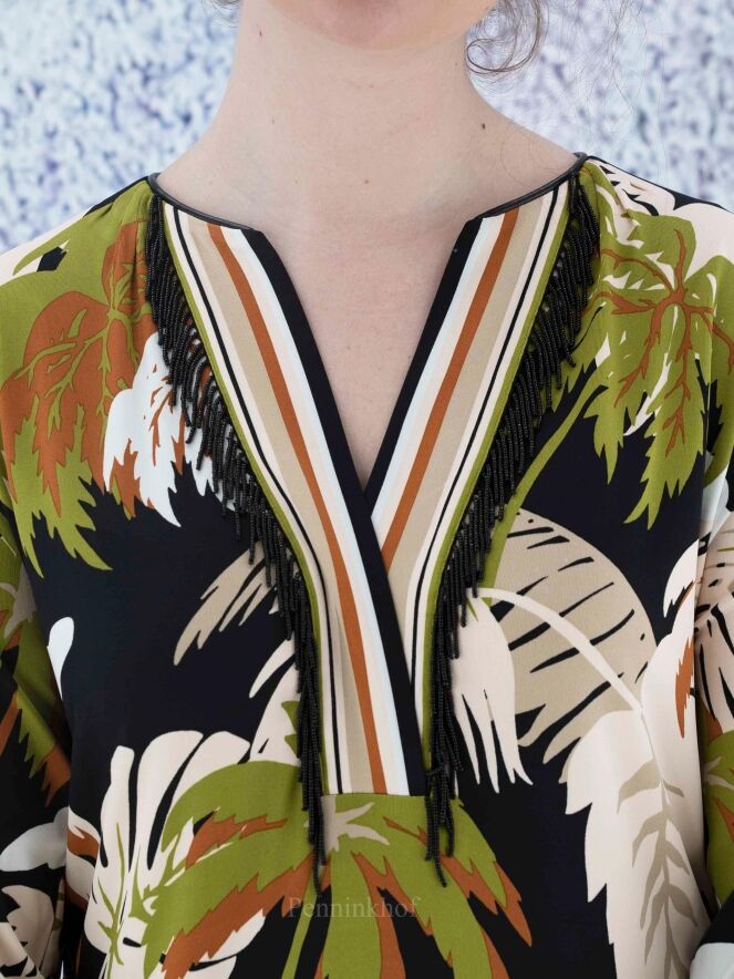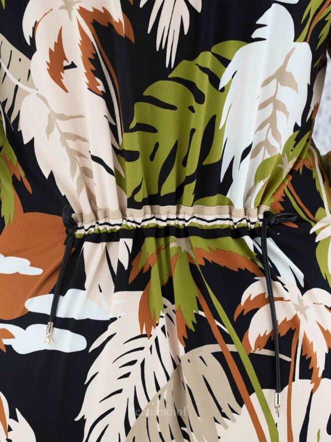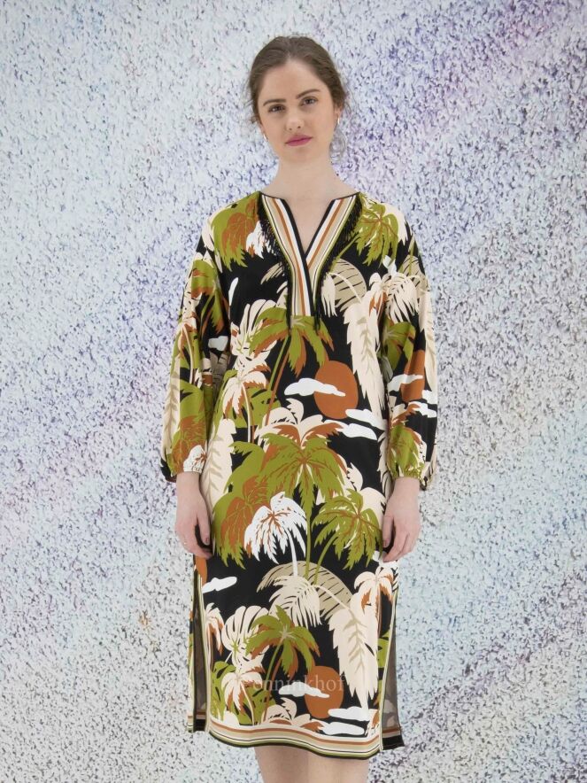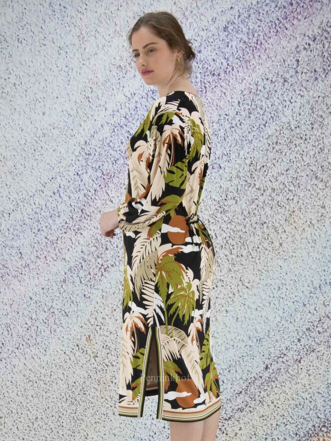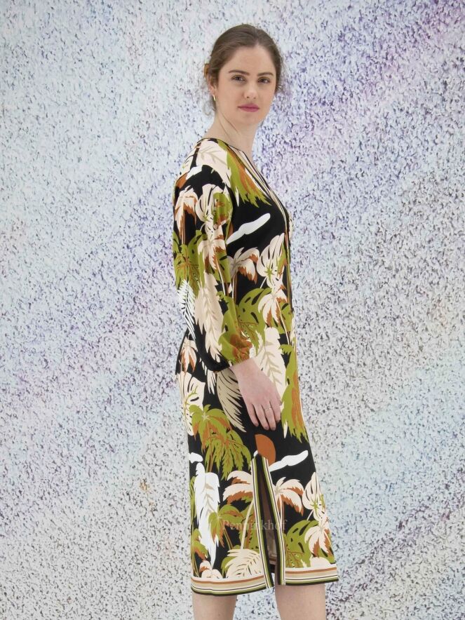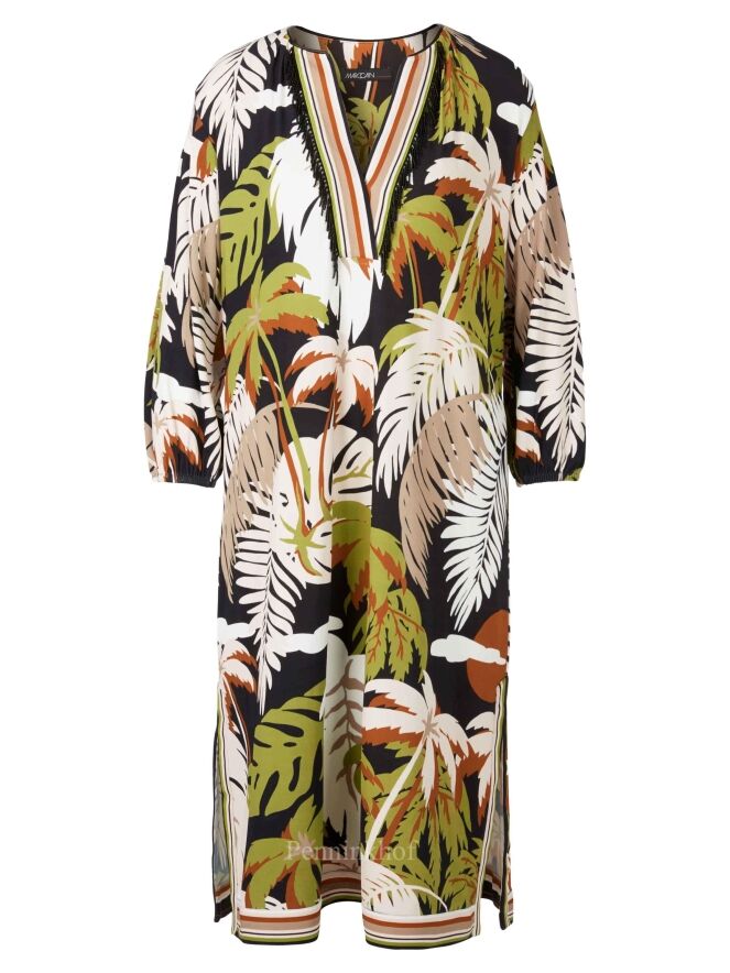 Een jurk van Marc Cain in een print met bladeren in de kleuren pistache groen, cognac, roomwit en zwart. Langs de rand van de V - Hals is een gestreepte bies. Aan beide kanten van het midden is een split met aan beide zijden van de split een gestreepte bies. In de rand van de lange mouwen is een fijn geplooide elastieken bies. Deze jurk mag op 30 graden worden gewassen.