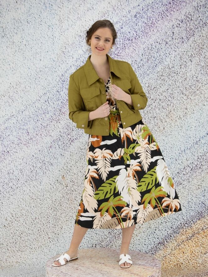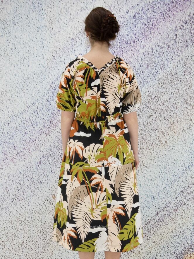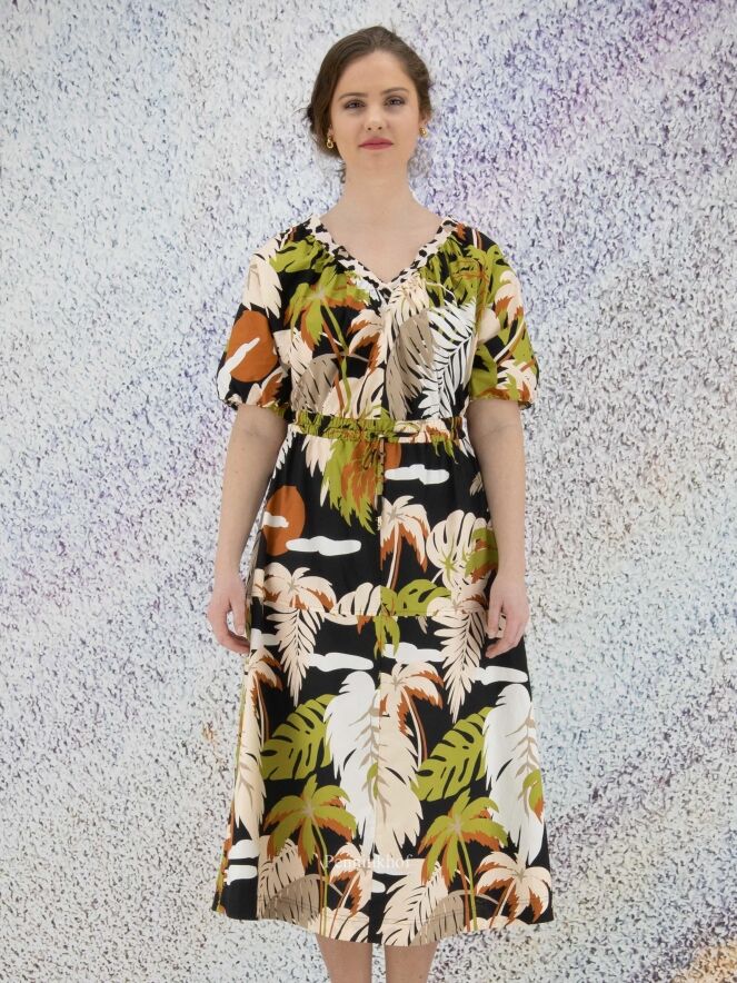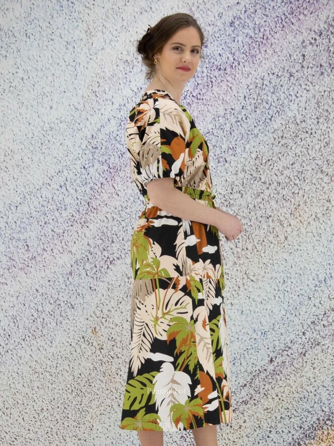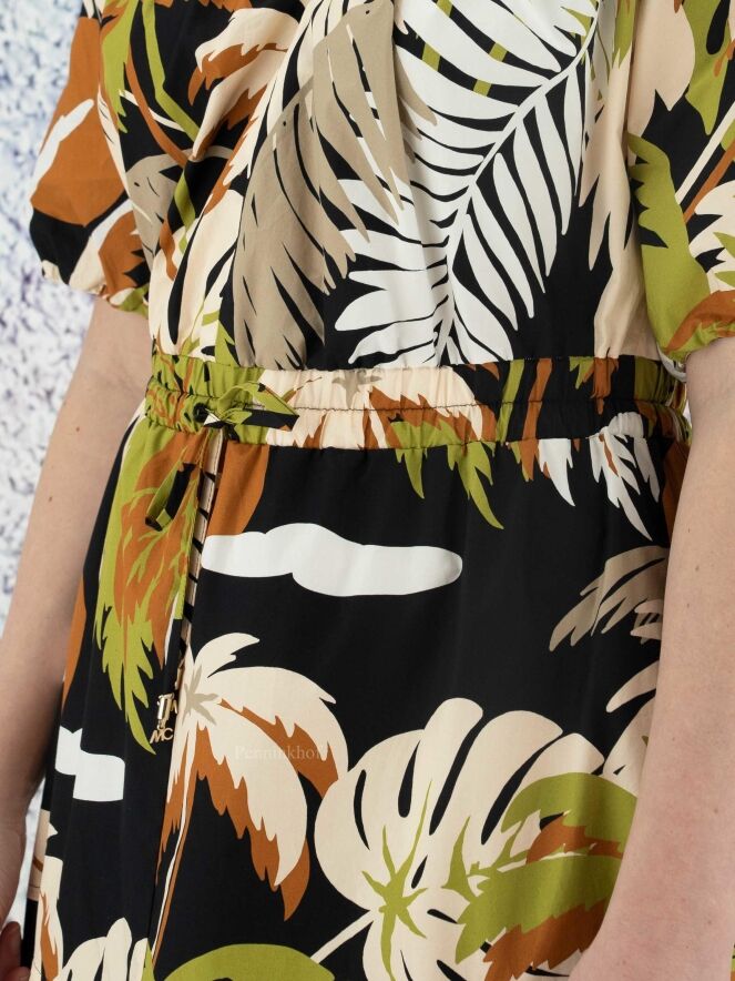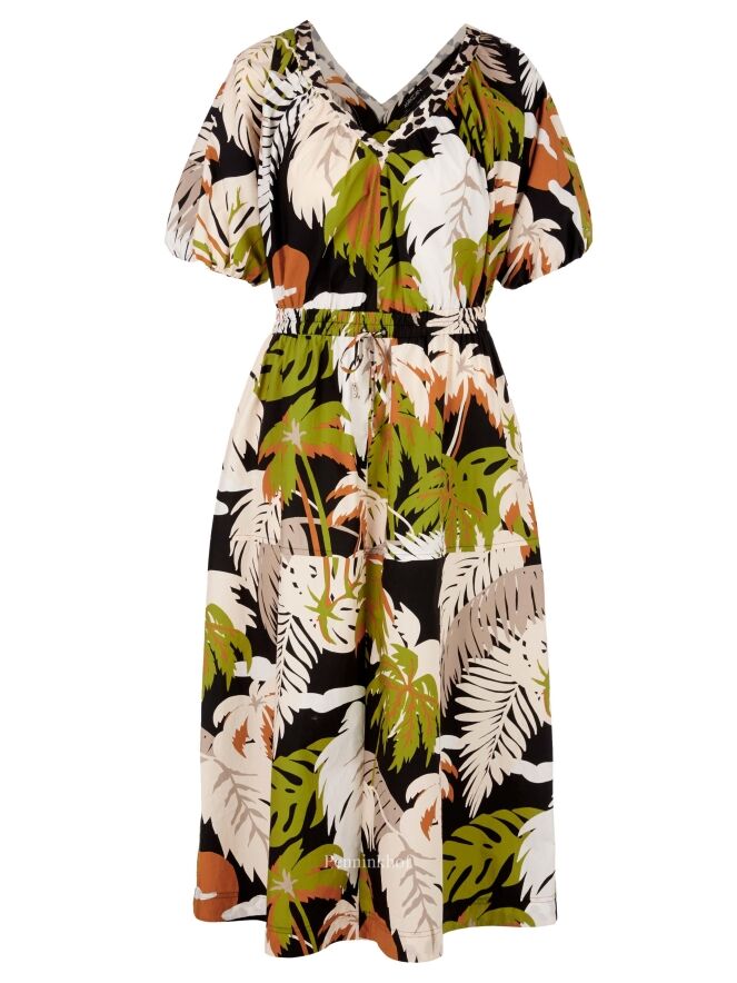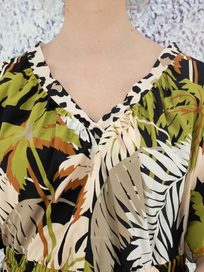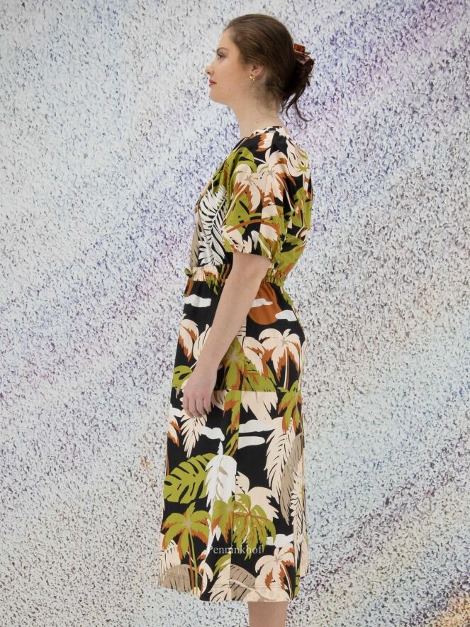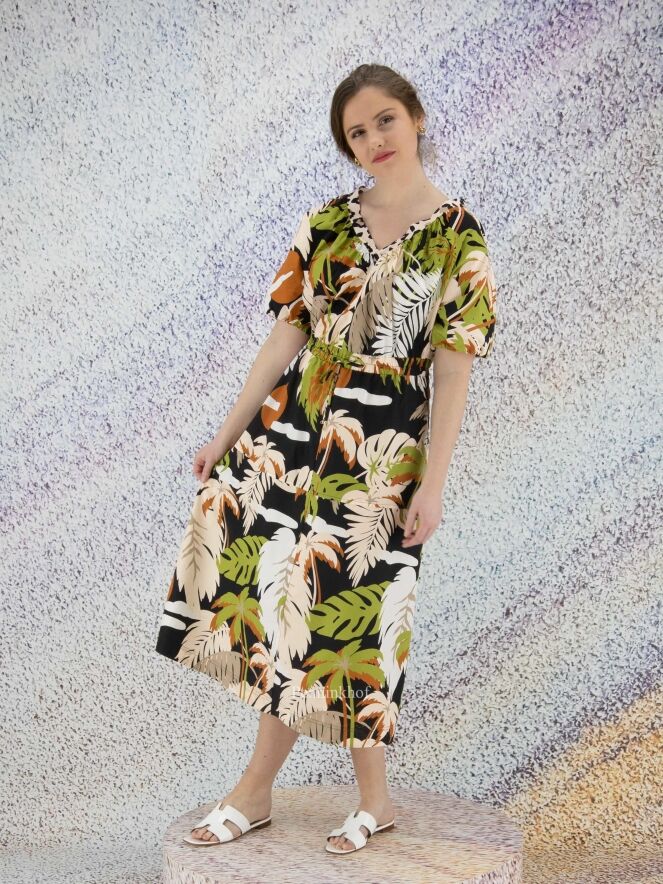 In de taille is een dubbele stiknaad waartussen de stof fijn geplooid is met een koord ceintuur in een tunnelverwerking. Vanuit de taille heeft de jurk een lichte A - Lijn. Langs de rand van de V - Hals is een bies in een panterprint. Langs de rand van de korte mouwen is de stof fijn geplooid. Deze jurk mag op 30 graden worden gewassen.
