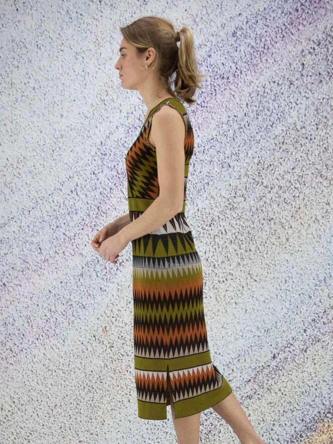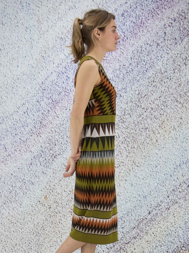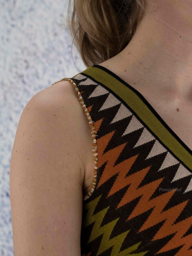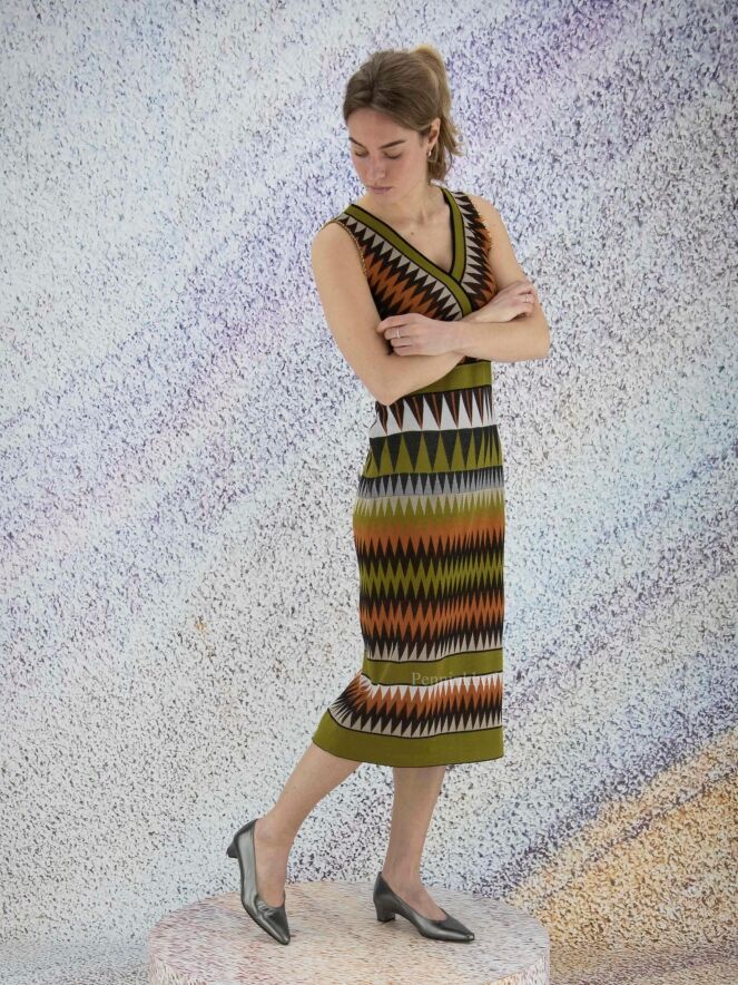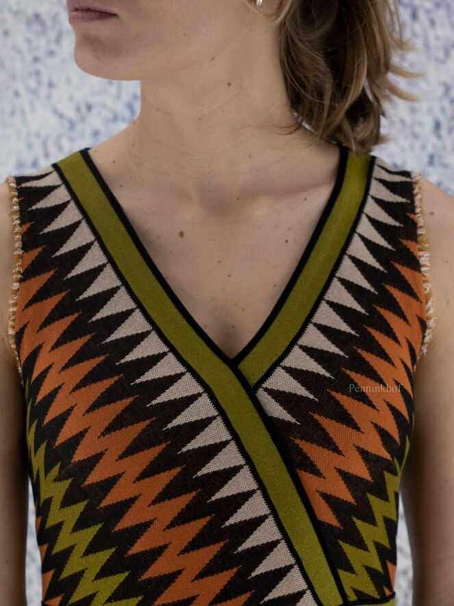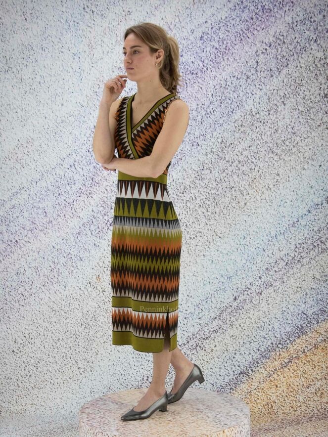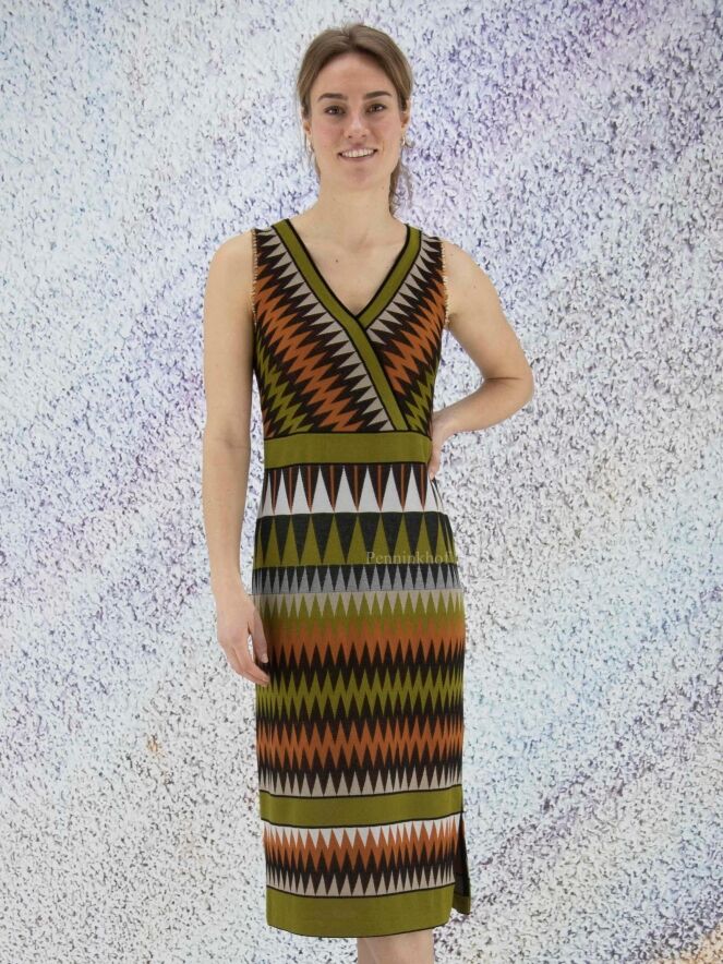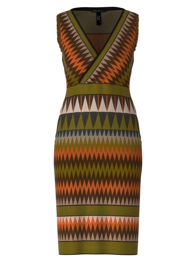 Een jurk van Marc Cain in een grafische mozaïekprint met de kleuren pistache groen, oranje, roomwit en zwart. De jurk heeft een V - Hals en langs de mouwinzet is de stof fijn gerafeld. Deze jurk mag op 30 graden worden gewassen.