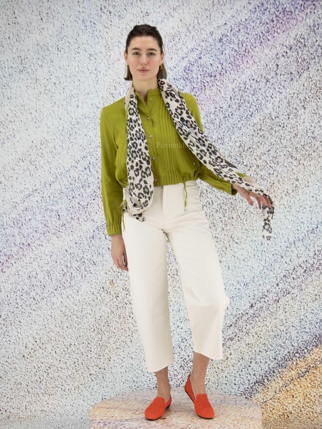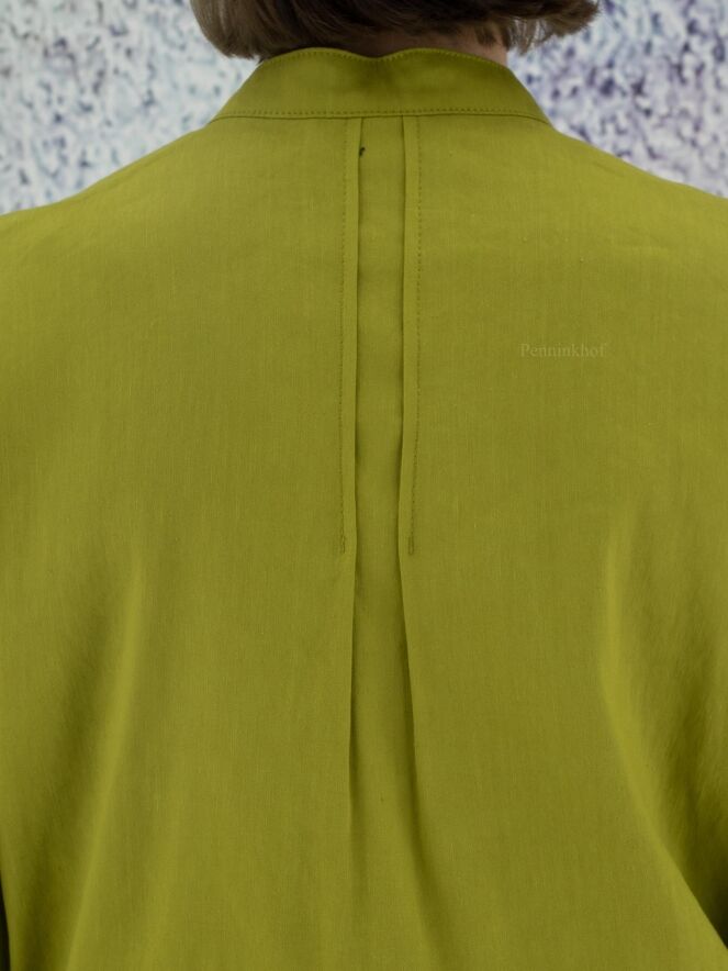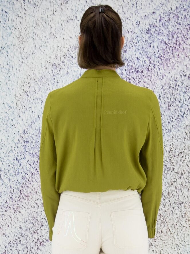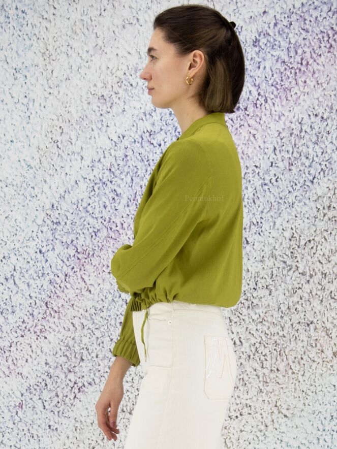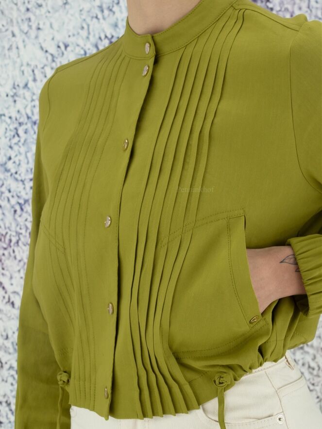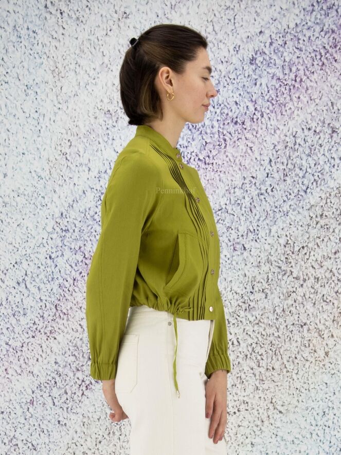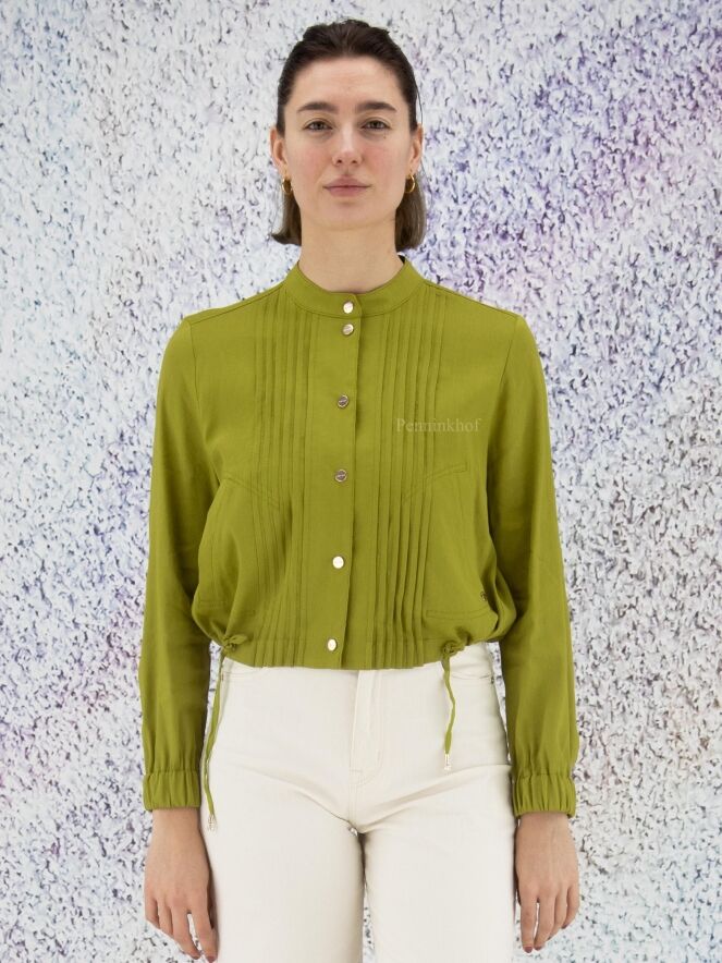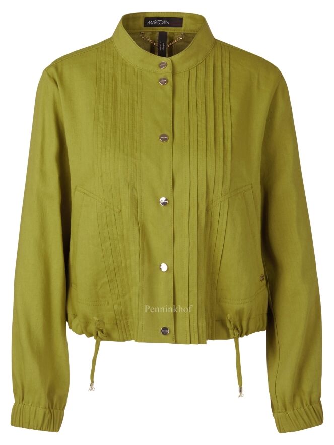 Een korte blazer van Marc Cain in een pistache groene kleur. Aan beide kanten van de sluiting met goudkleurige drukknopen zijn meerdere plissé plooien. Aan het uiteinde van de lange mouwen is een brede fijn geplooide elastieken band. De blazer heeft steekzakken en mag op 30 graden worden gewassen.