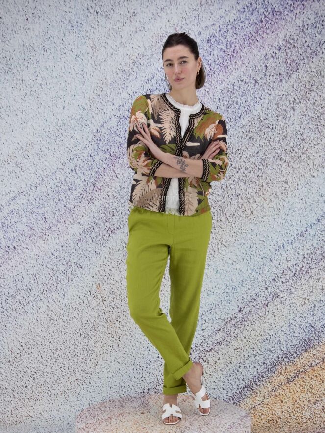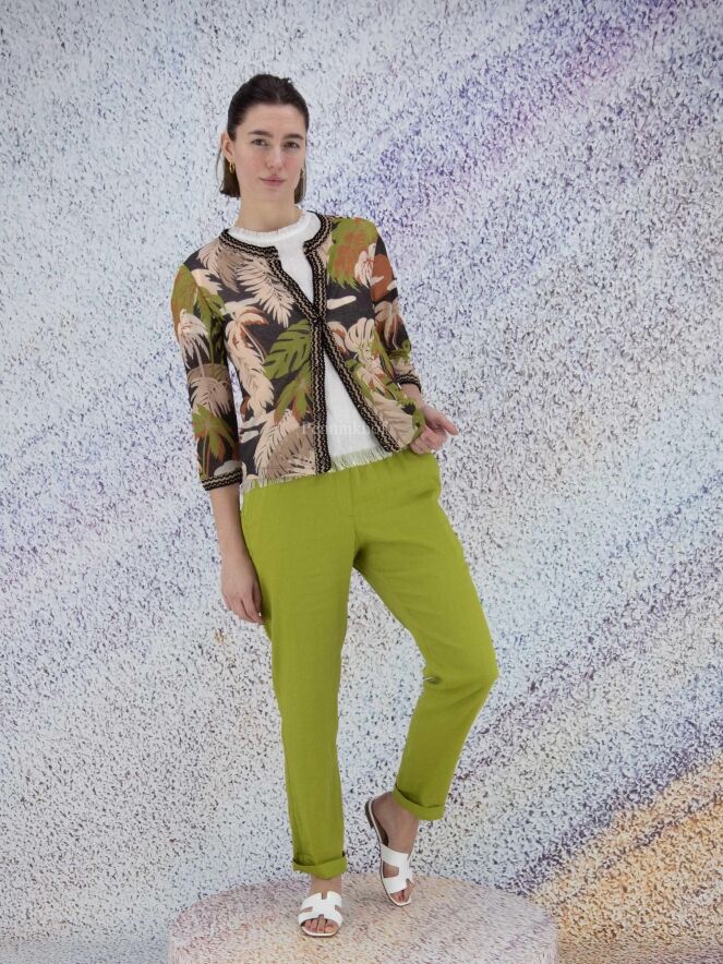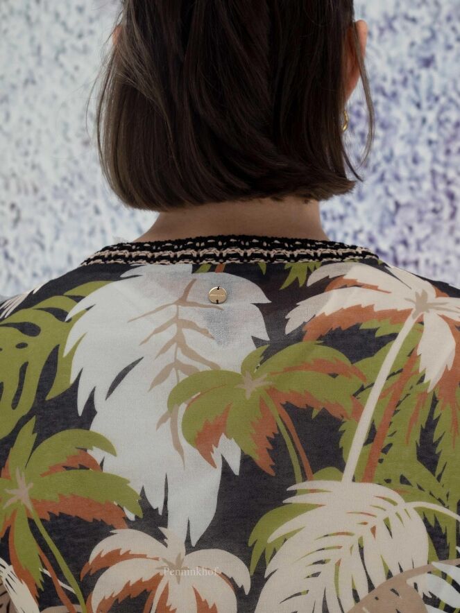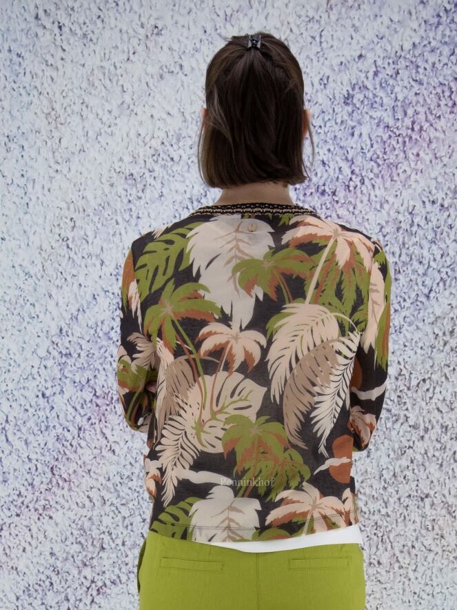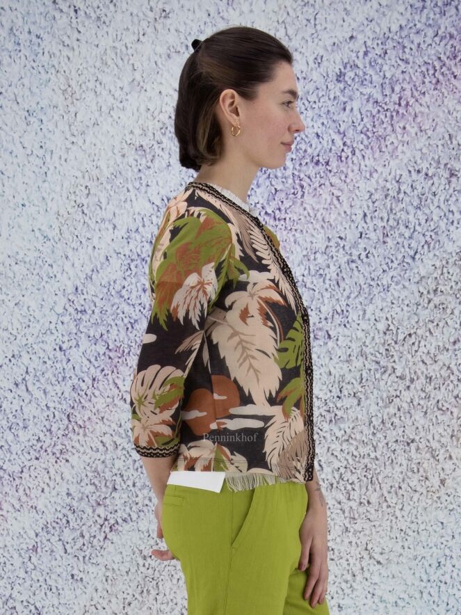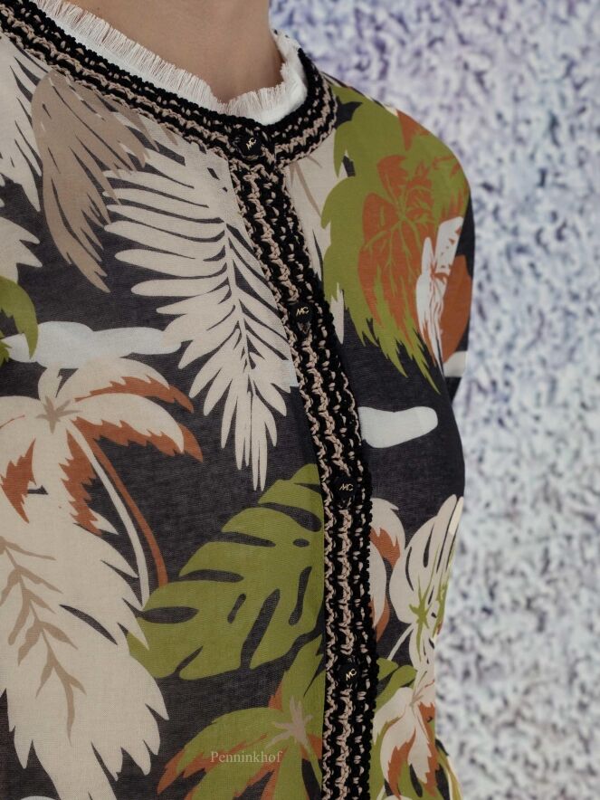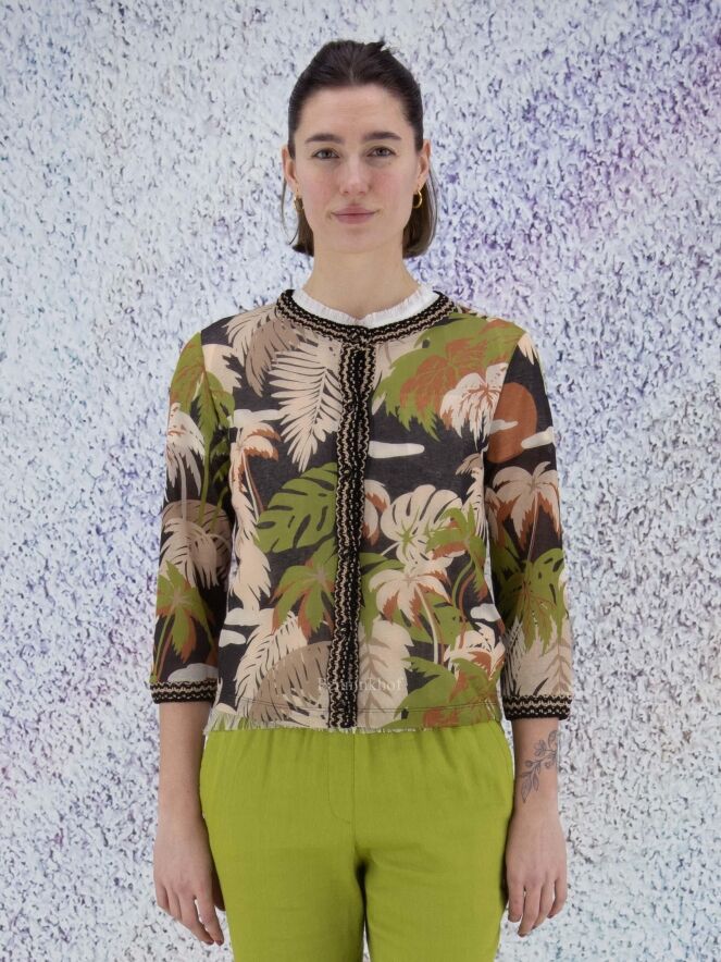 Een licht transparant vest van Marc Cain in een print van bladeren en palmbomen met de kleuren pistachegroen, zwart en cognac op een roomwitte achtergrond. Langs de rand van de ronde hals, de sluiting en de uiteinden van de halflange mouwen is een gevlochten bies in de kleuren zwart en zand. Dit vest mag op 30 graden worden gewassen.