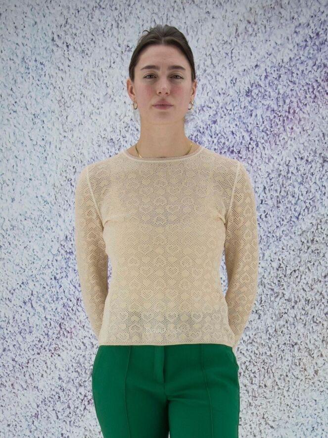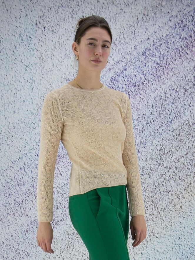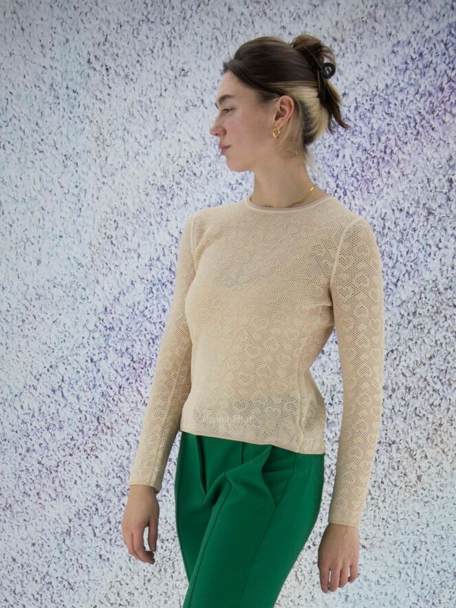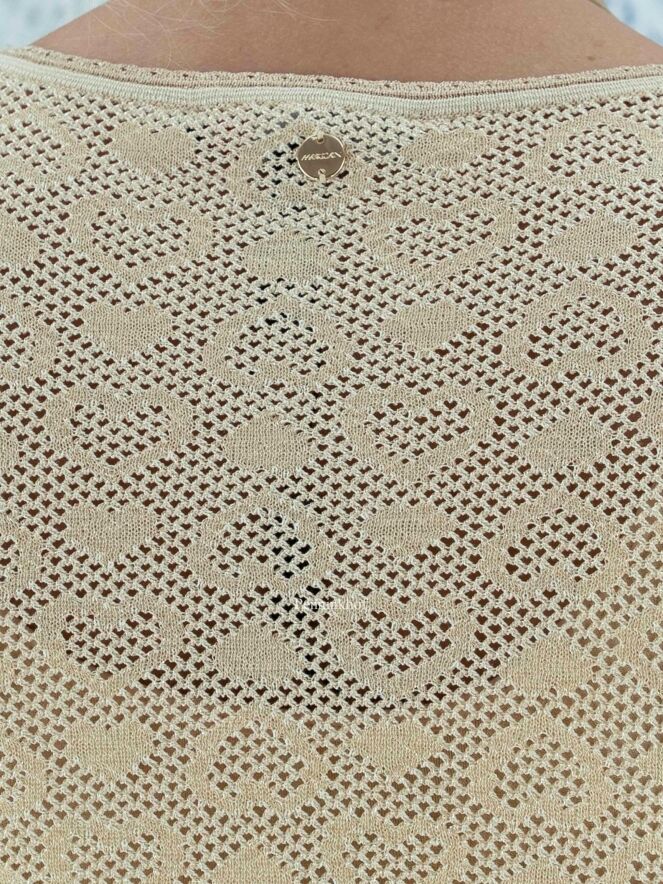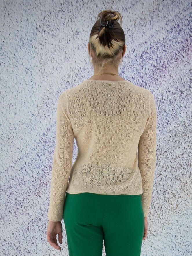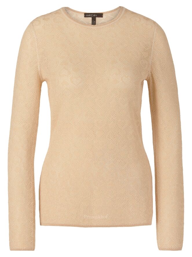 Een geperforeerd shirt van Marc Cain in de kleur nude met een gouddraad door de stof heen. in de stof zijn 2 soorten hartjes geweven. Langs de rand van de ronde hals is een ajour bies. Dit shirt mag op 30 graden worden gewassen.