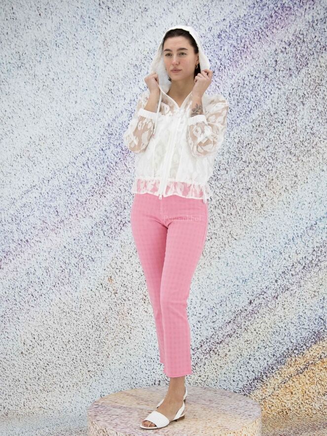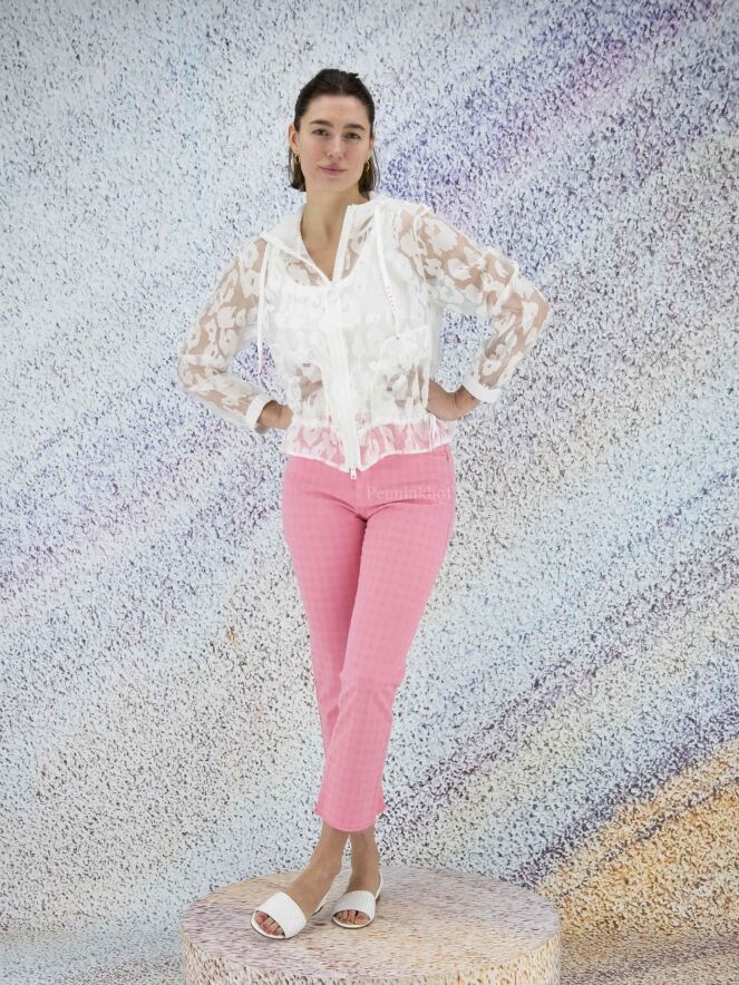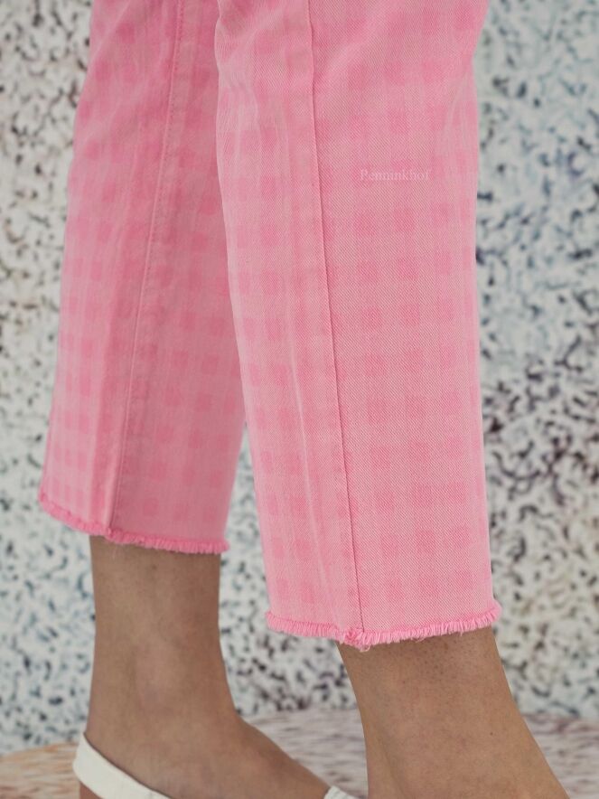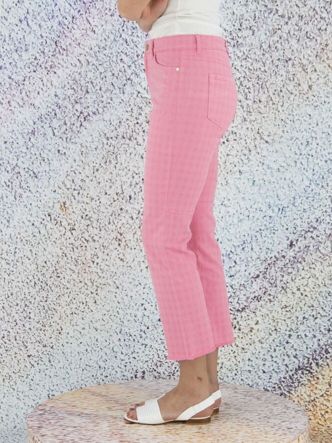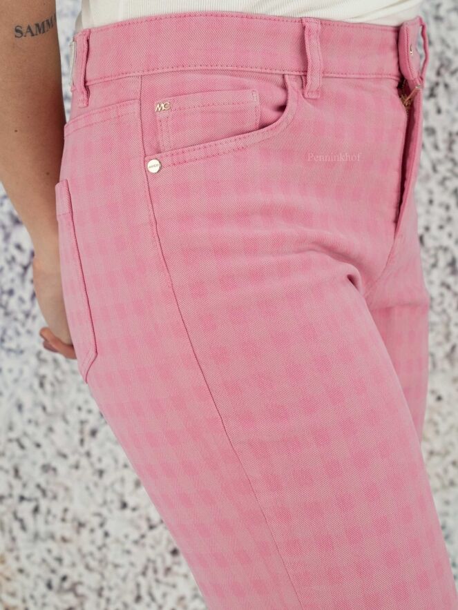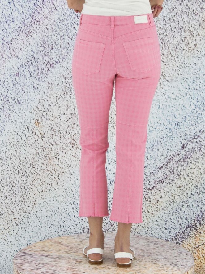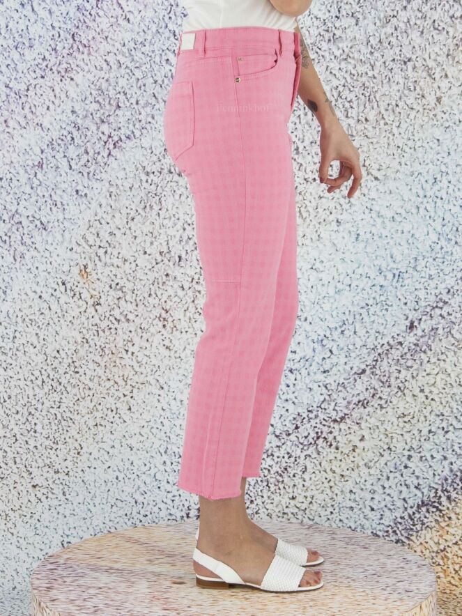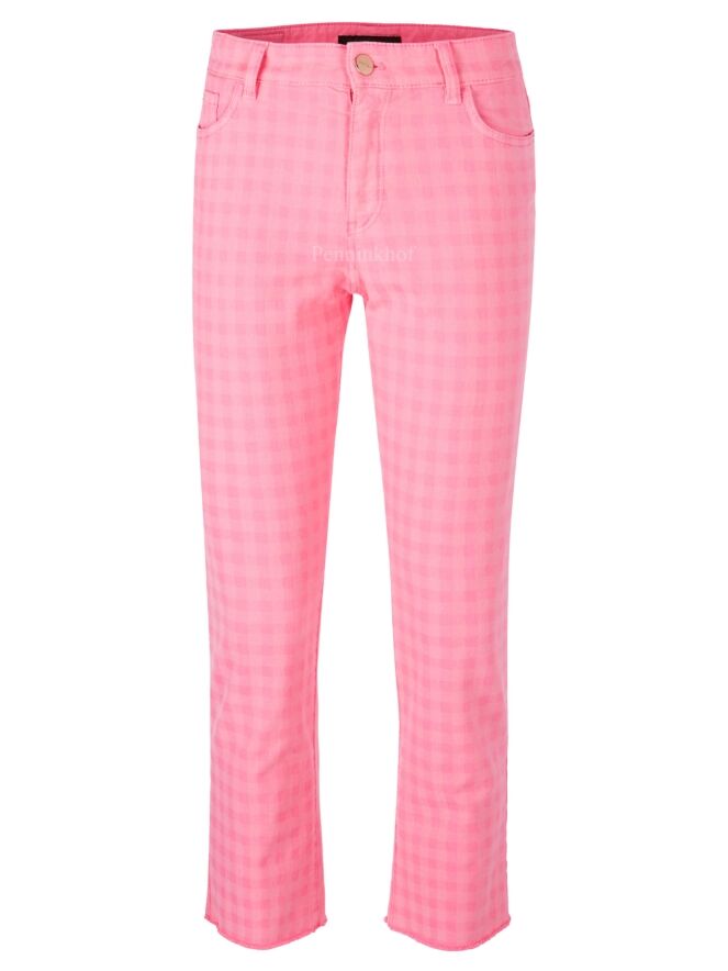 Een jeans van Marc Cain in een ruitpatroon met 2 tinten pink. De jeans is in een 5 pocket model. Aan de onderkant van de pijpen is de jeans fijn gerafeld. Deze jeans mag op 30 graden worden gewassen.