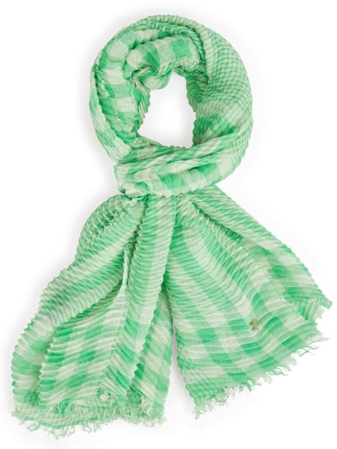 Een licht transparante shawl van Marc Cain in een ruitprint met de kleuren groen en wit. De stof is fijn geplisseerd en langs de rand is de stof fijn gerafeld. Deze shawl mag op de hand worden gewassen.