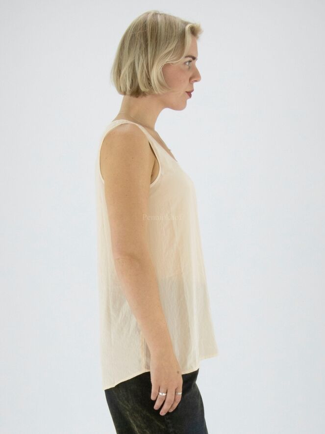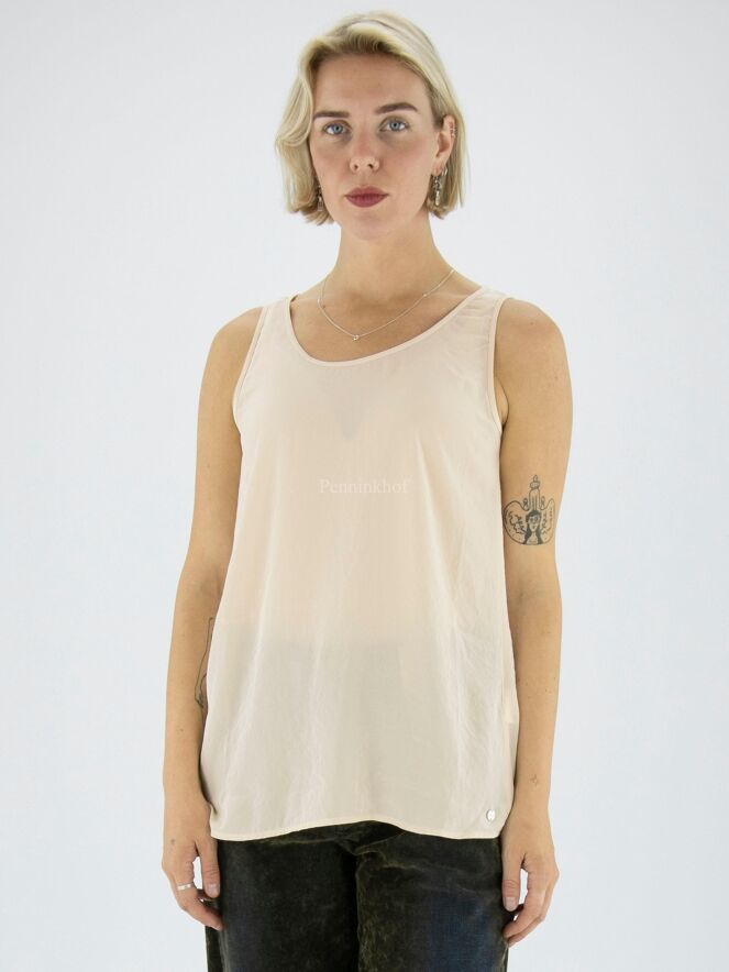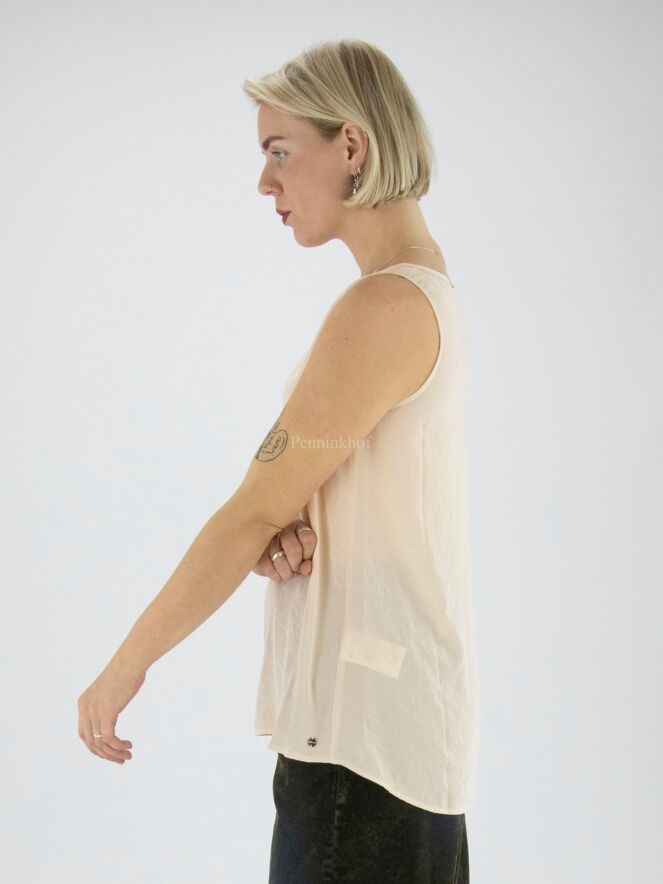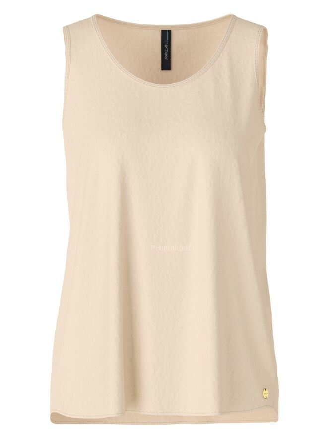 Een top van Marc Cain in een matte gladde stof in de kleur zand. De top heeft een ronde hals en mag op 30 graden worden gewassen.