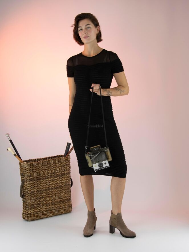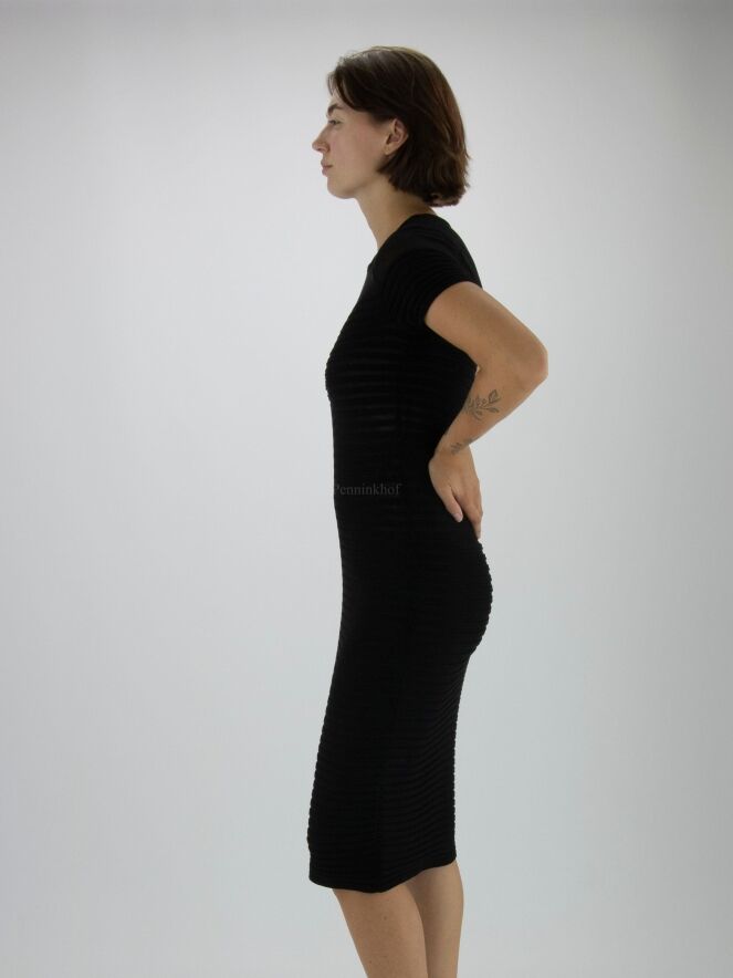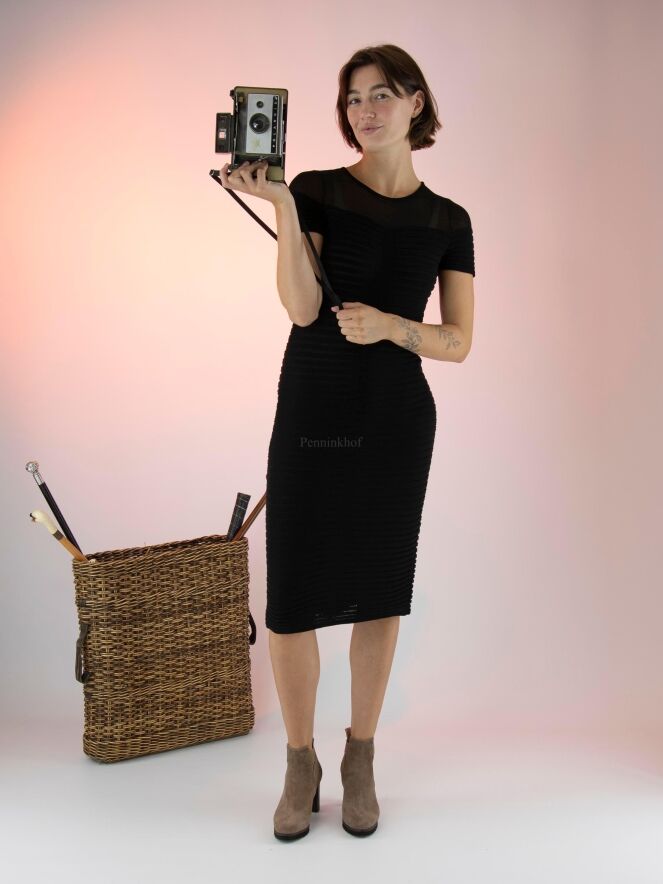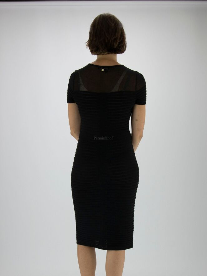 Een licht transparante jurk van Marc Cain in de kleur zwart. Boven de buste is de stof transparant en vanaf de buste is de stof in een strepen structuur die deels licht transparant is. Deze jurk mag op 30 graden worden gewassen.