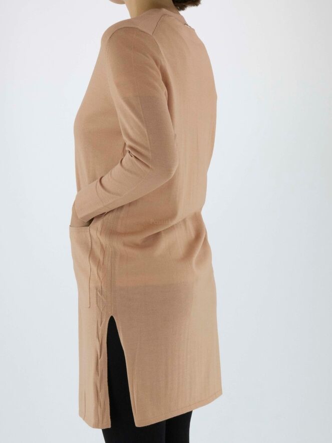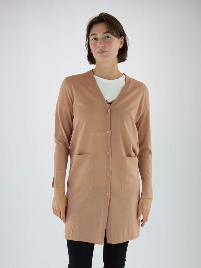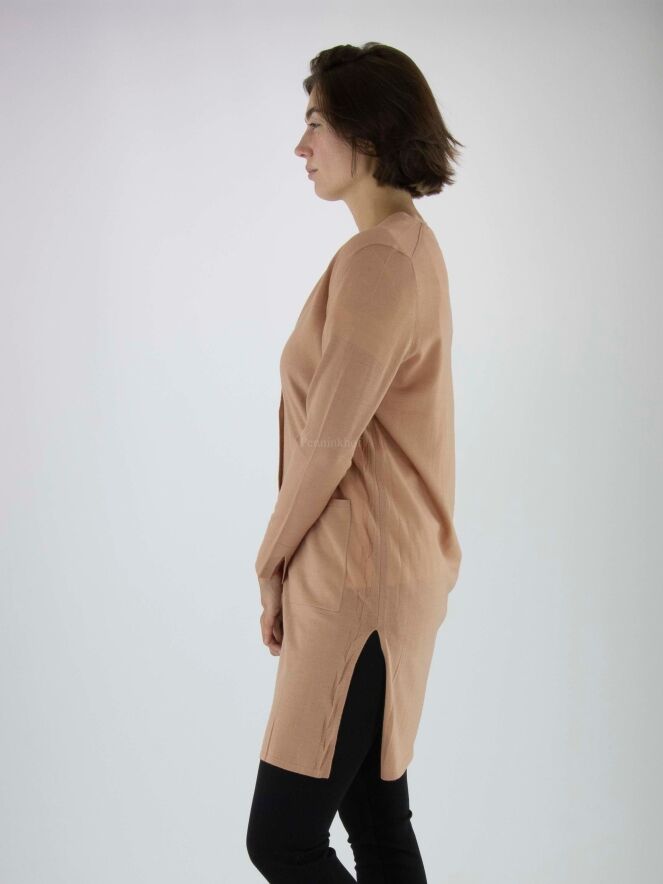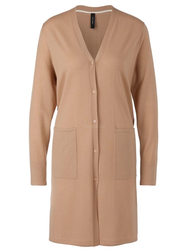 Een lang vest van Marc Cain in de kleur camel. Aan de onderkant zijn aan beide zijkanten diepe splitten. Het vest heeft lange mouwen en mag op de hand worden gewassen.