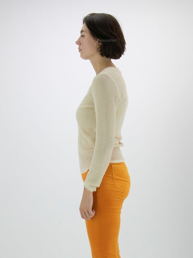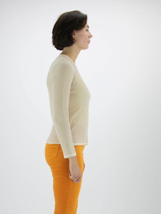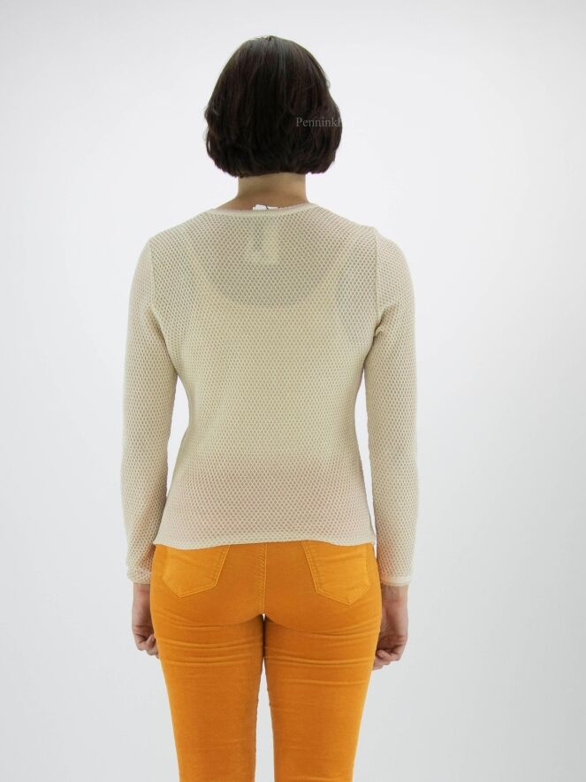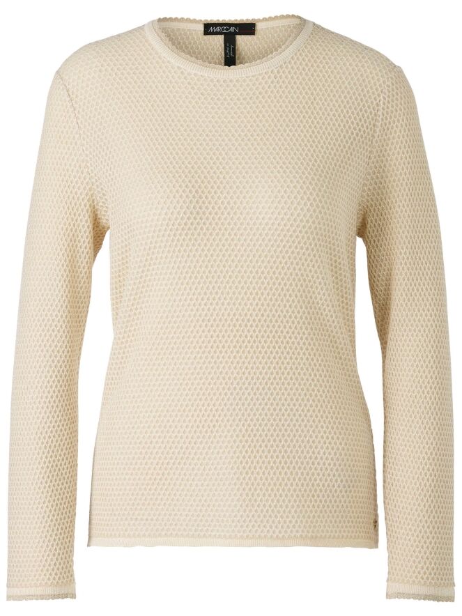 Een pullover van Marc Cain in een raten patroon in de kleur zand. Door de stof is een gouddraad geweven. Langs de rand van de ronde hals en aan het uiteinde van de lange mouwen is een geschubt biesje. Deze pullover mag op 30 graden worden gewassen.