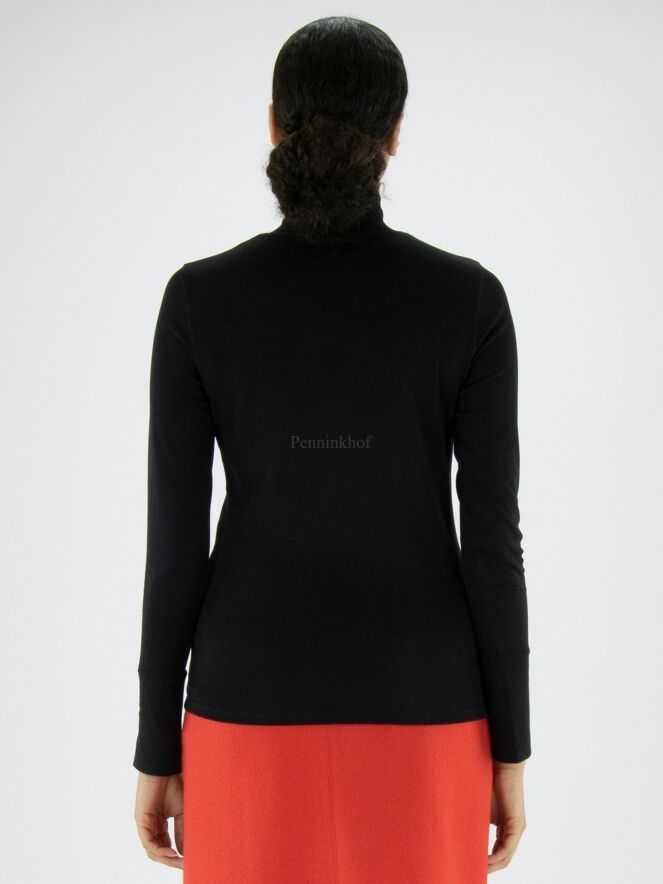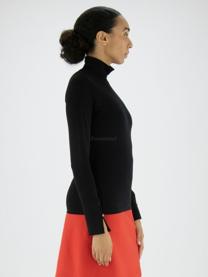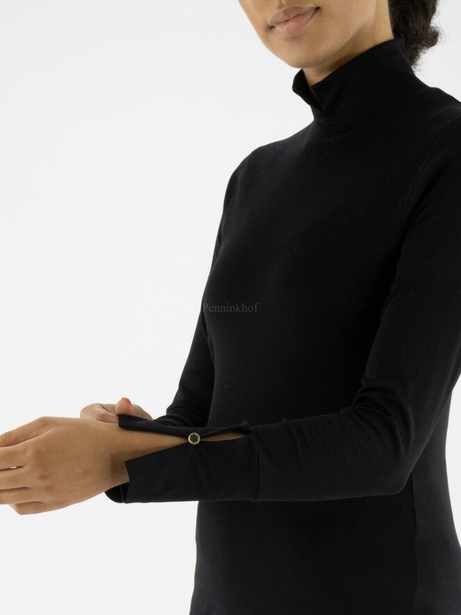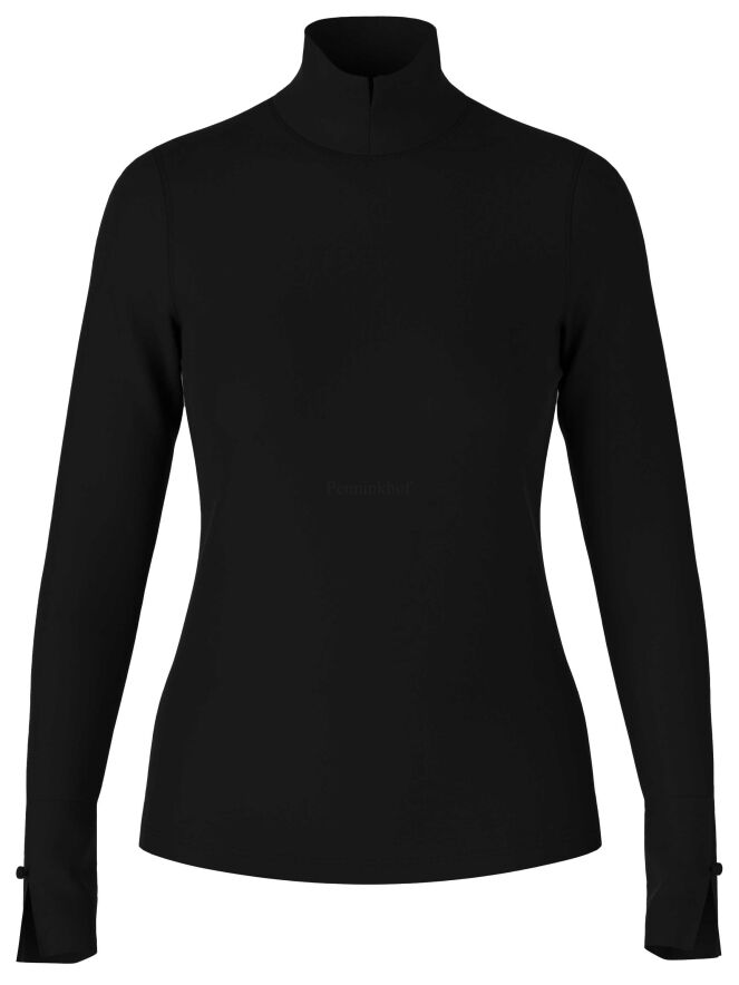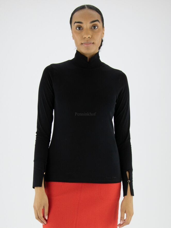 Een shirt van Marc Cain in de kleur zwart. Het shirt heeft een turtle col met een splitje in het midden. De lange mouwen van het shirt hebben manchetten met een decoratief knoopje. Dit shirt mag op 30 graden worden gewassen.