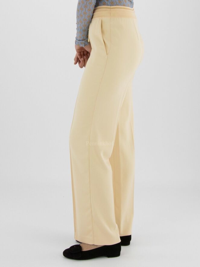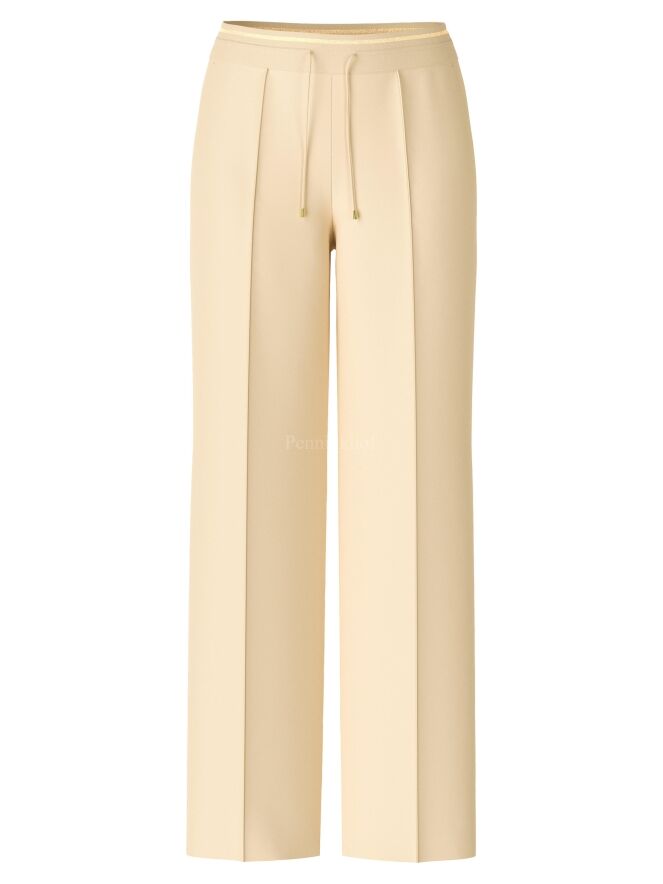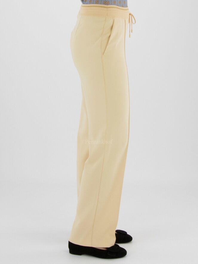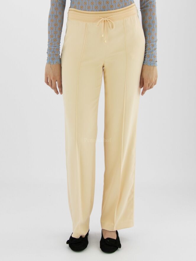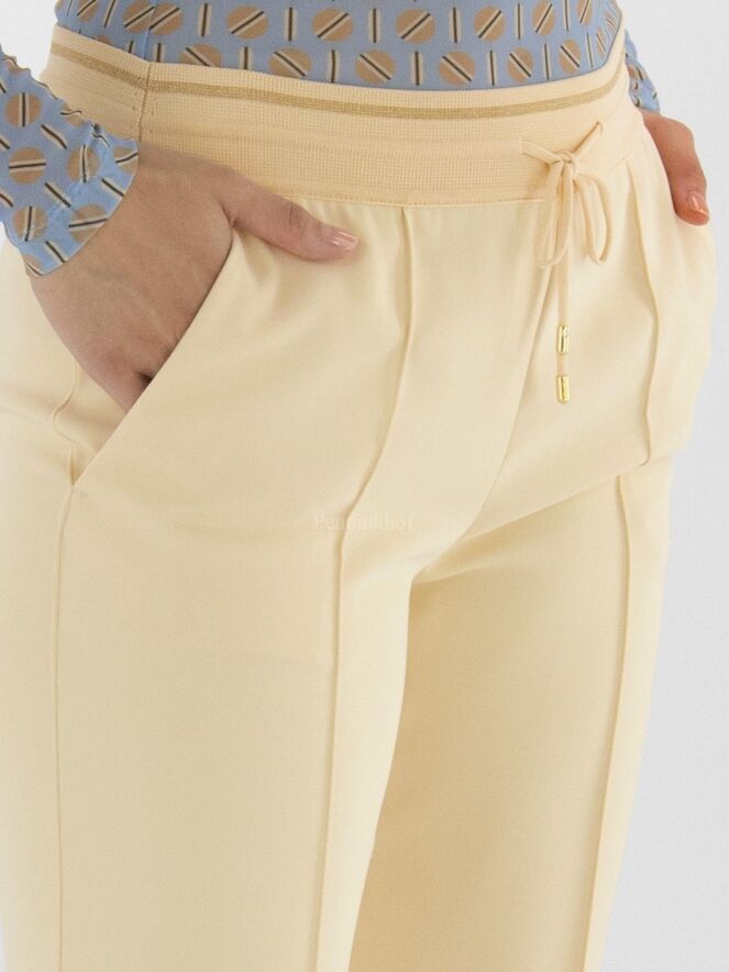 Een luxe joggingbroek van Marc Cain in een zandkleur. In de taille is een elastieken band met een koord in een tunnelverwerking. In het midden van de pijpen is een stiknaad. De broek heeft steekzakken en mag op 30 graden worden gewassen.