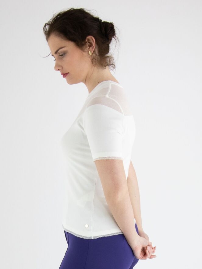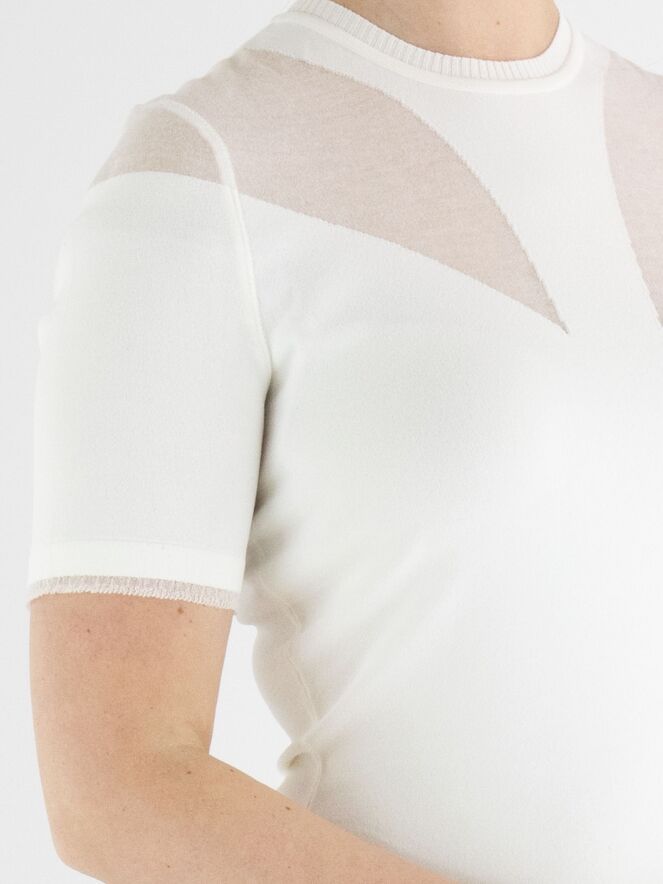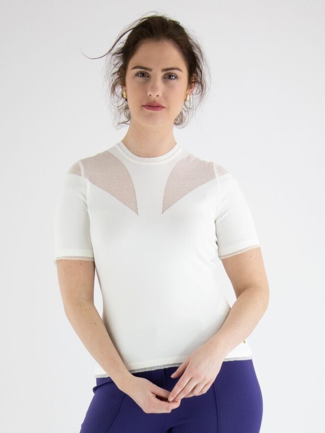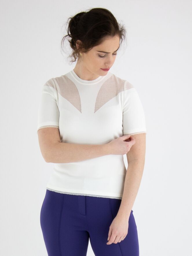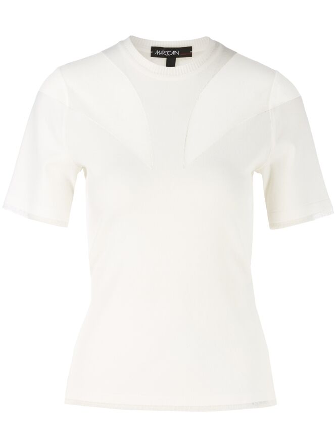 Een shirt van Marc Cain in een roomwitte kleur. Het shirt heeft een hoge ronde hals Met een fijn geribbelde tricot bies. Aan de voorzijde is de stof vanuit de schouders naar de buste in een druppelvorm licht transparant en aan de achterkant is de transparante stof tot boven de schouderbladen. Aan de onderkant is een fijn geplooide transparante bies. Dit shirt mag op 30 graden worden gewassen.