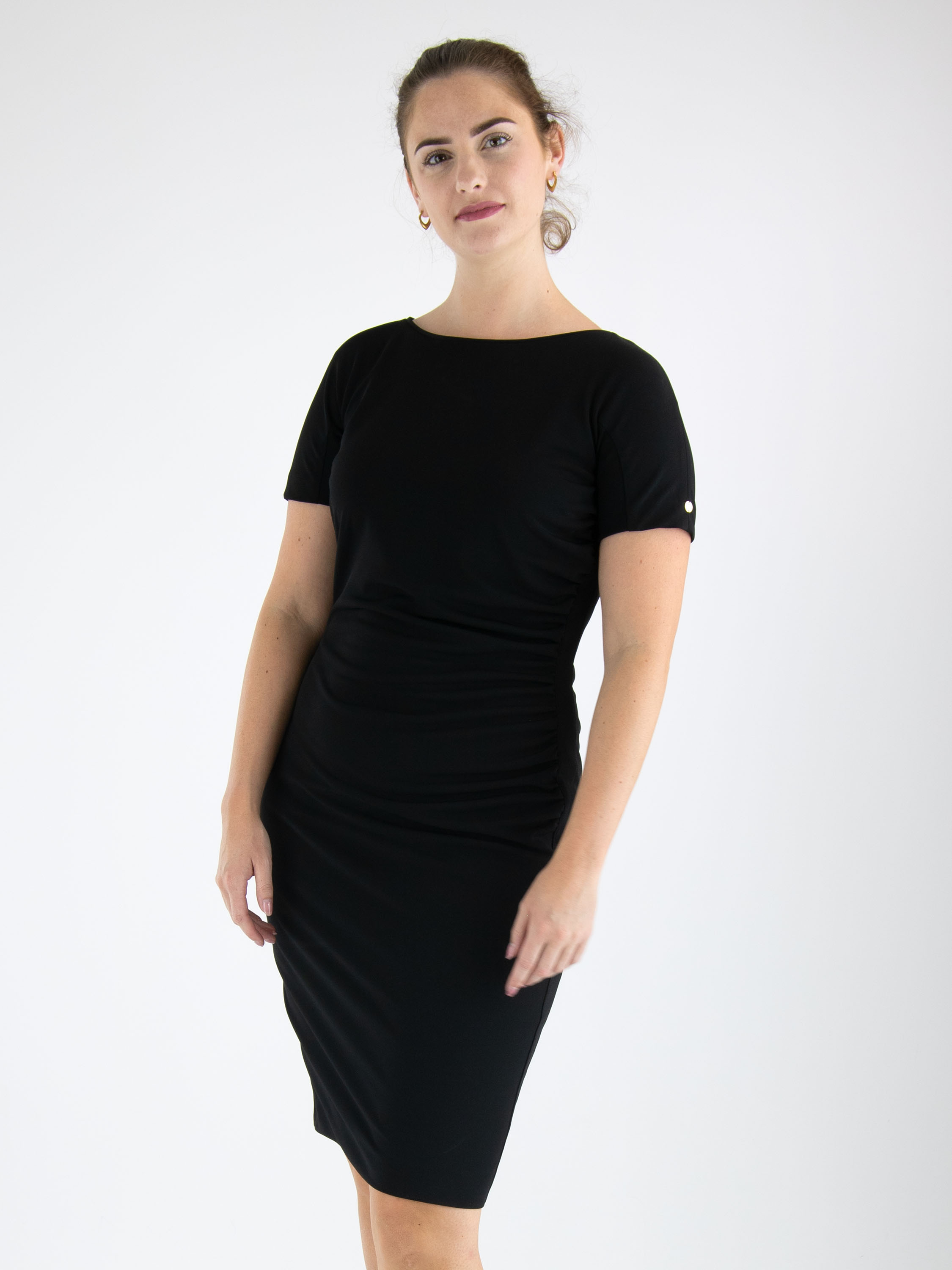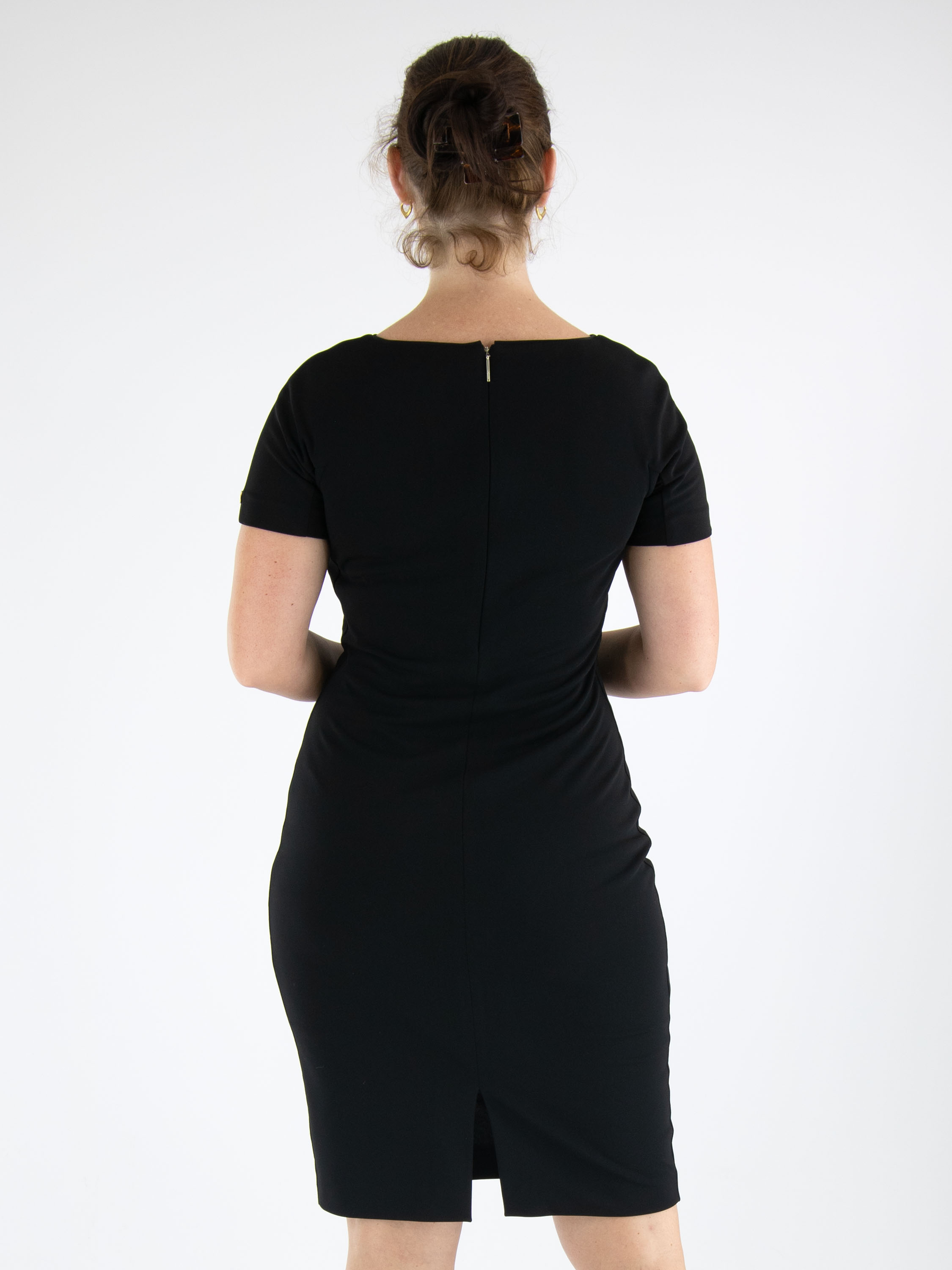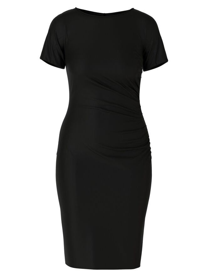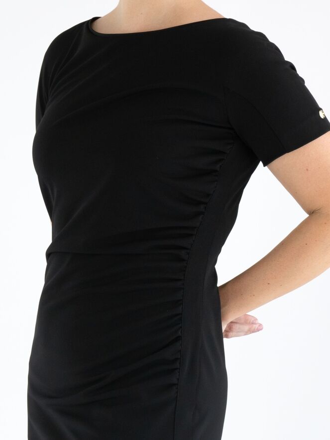Een jurk van Marc Cain in de kleur zwart. Langs de linker zijkant is de stof langs de stiknaad pijn geplooid wat een drapeer effect geeft aan de voorzijde. De jurk heeft korte mouwen, een ronde hals en mag op 30 graden worden gewassen.