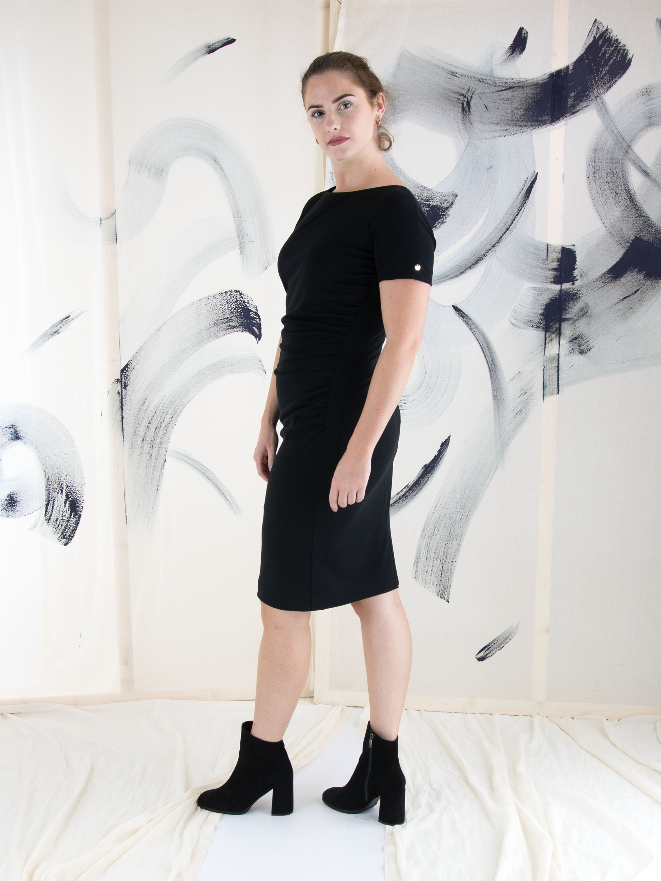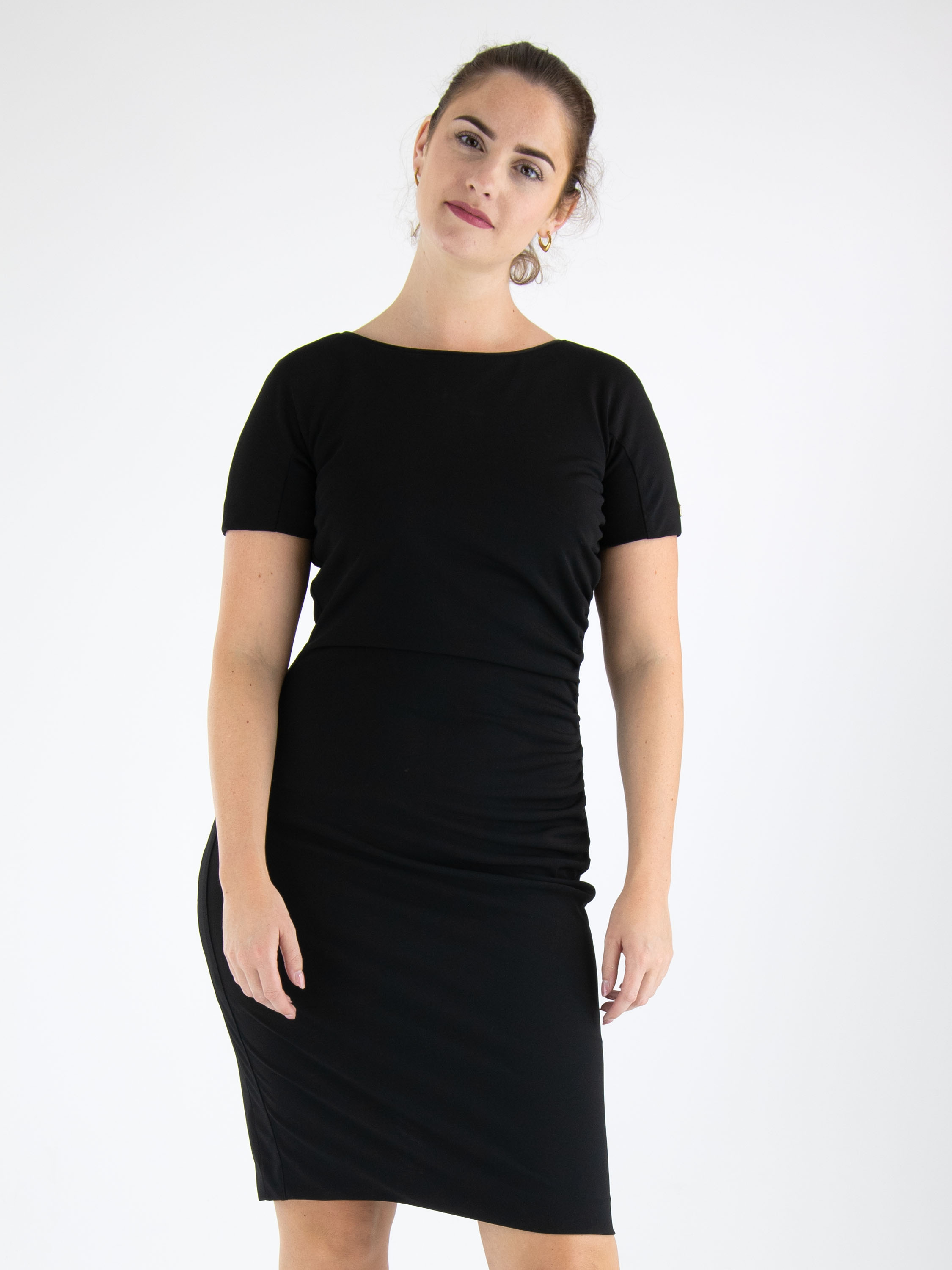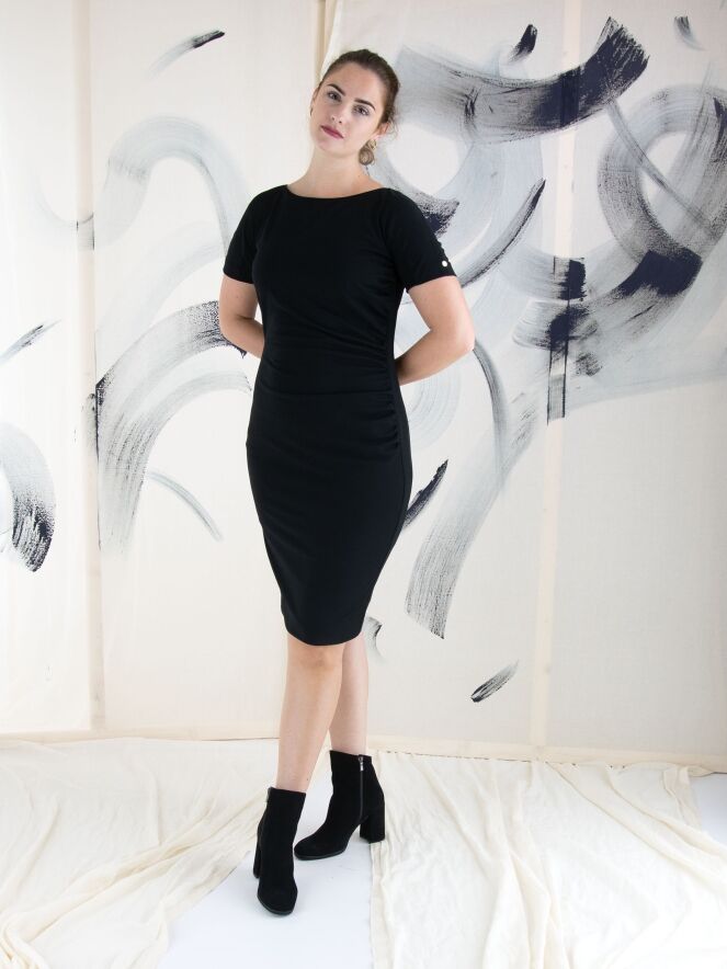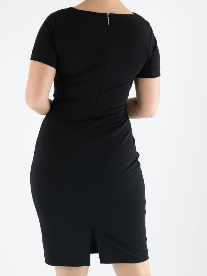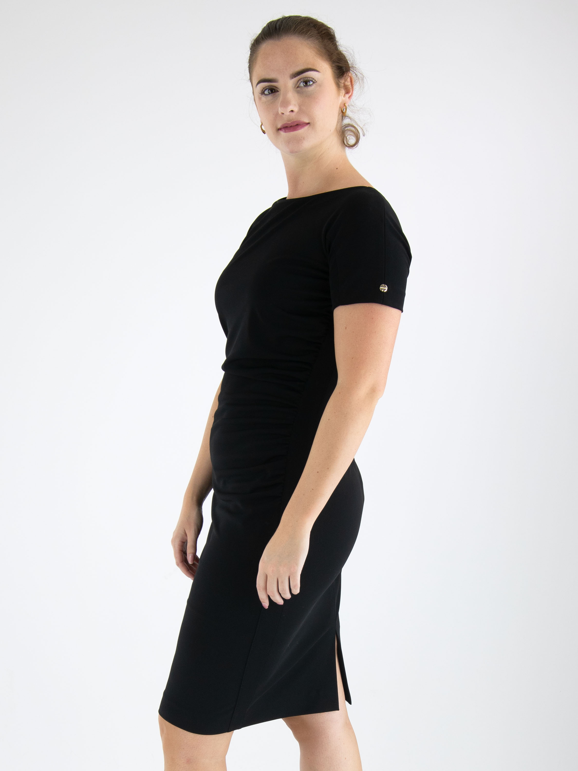 Een jurk van Marc Cain in de kleur zwart. Langs de linker zijkant is de stof langs de stiknaad pijn geplooid wat een drapeer effect geeft aan de voorzijde. De jurk heeft korte mouwen, een ronde hals en mag op 30 graden worden gewassen.
