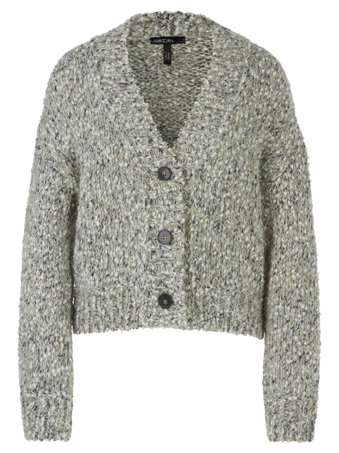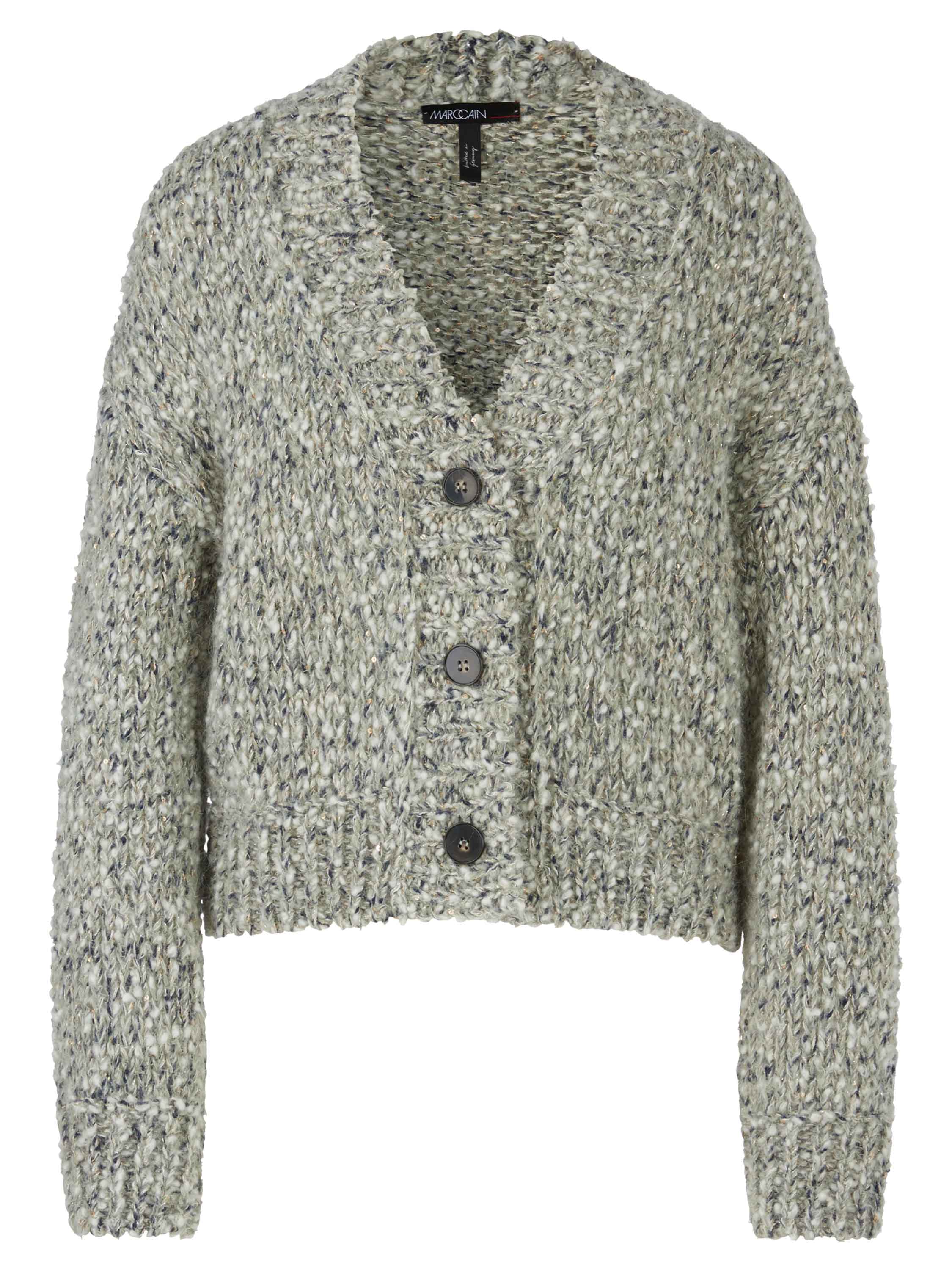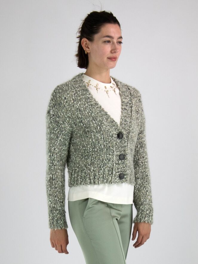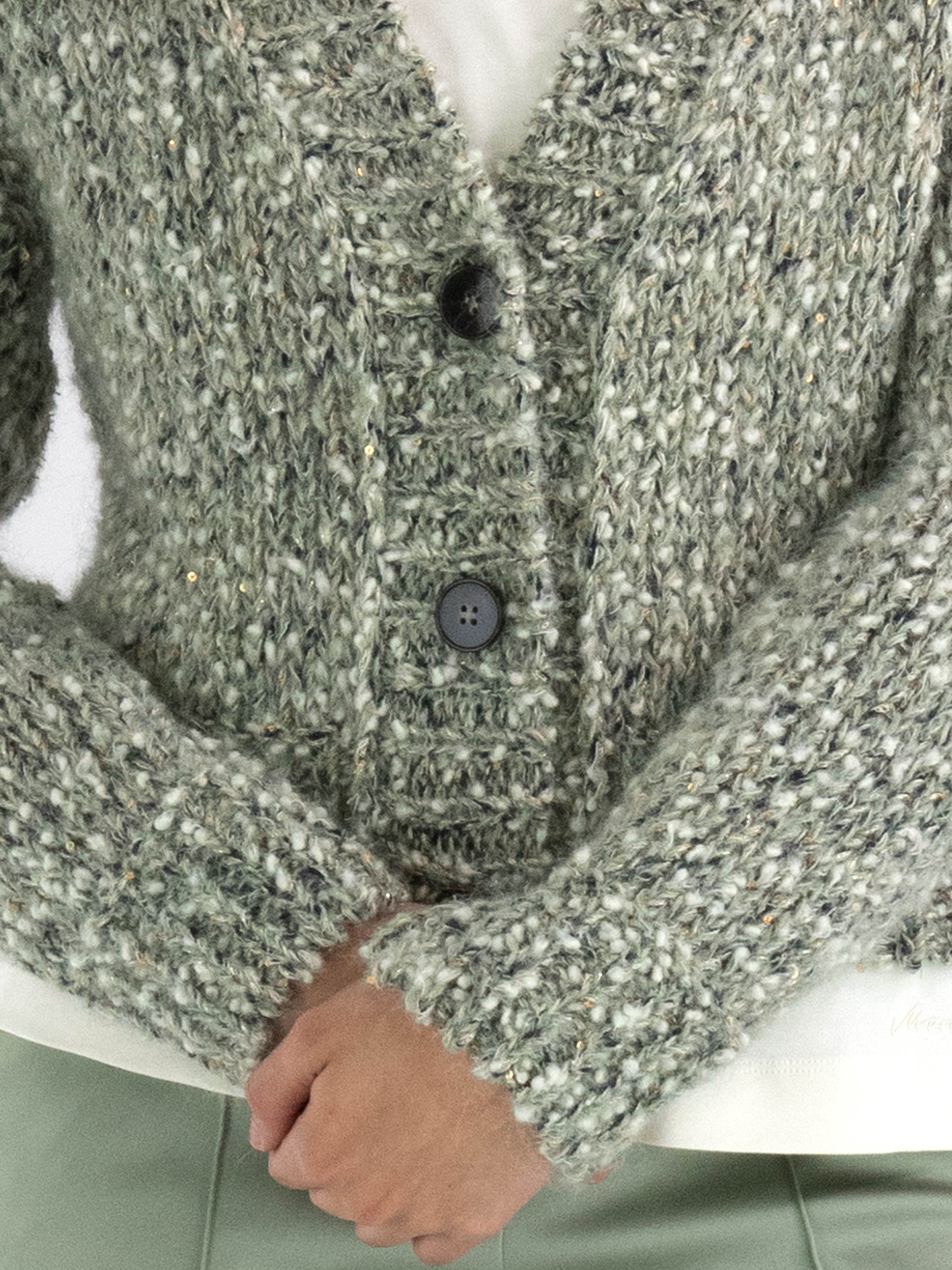 Een kort gebreid gemêleerd vest van Marc Cain met meerdere tinten olijfgroen en roomwit. Door de stof is een gouddraad geweven met goudkleurige lovertjes. Het vest heeft een 3 knoops sluiting en mag op de hand worden gewassen.