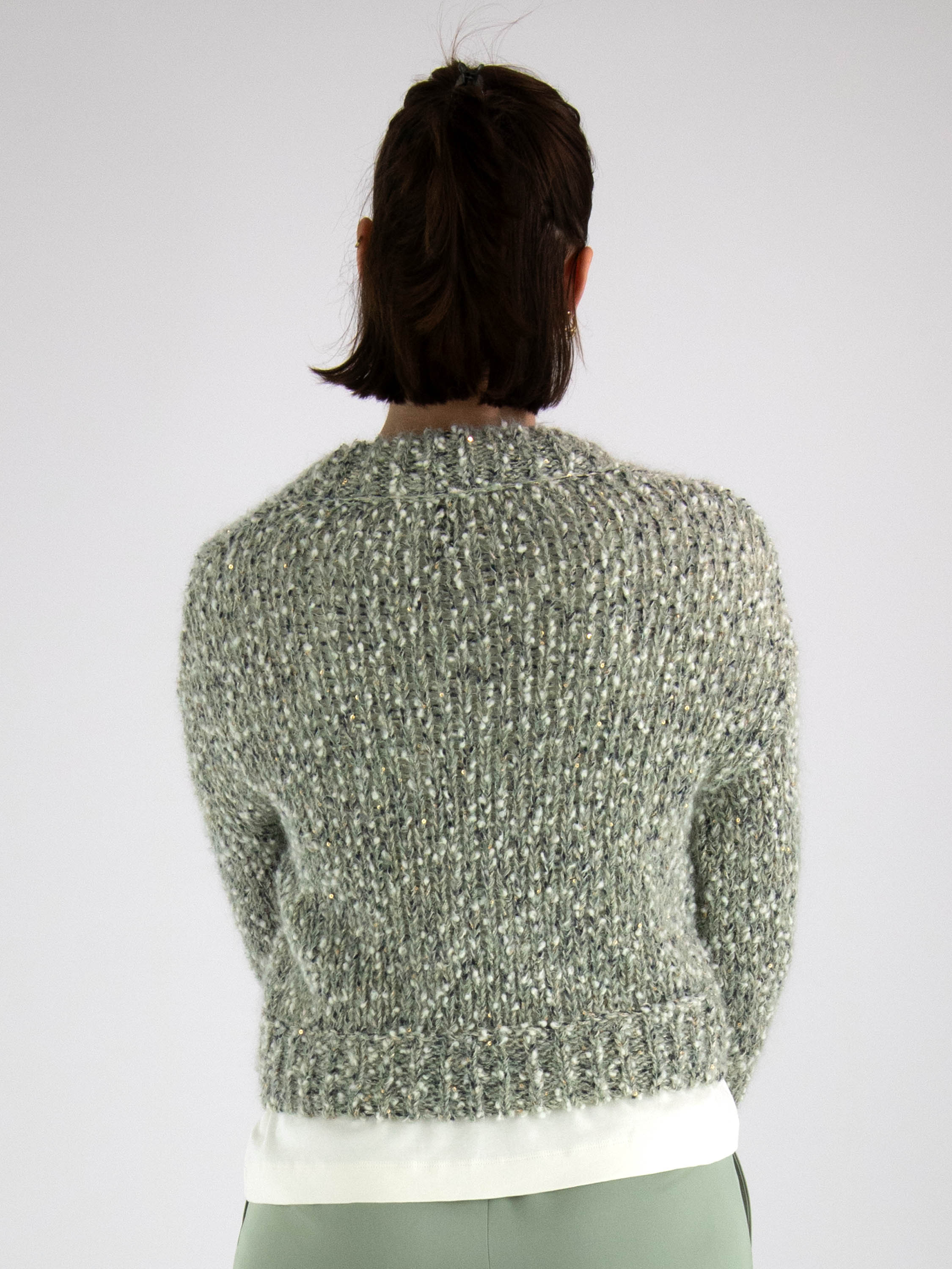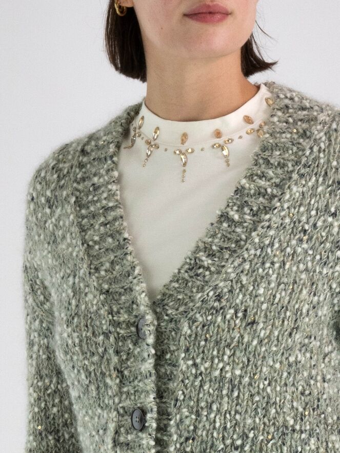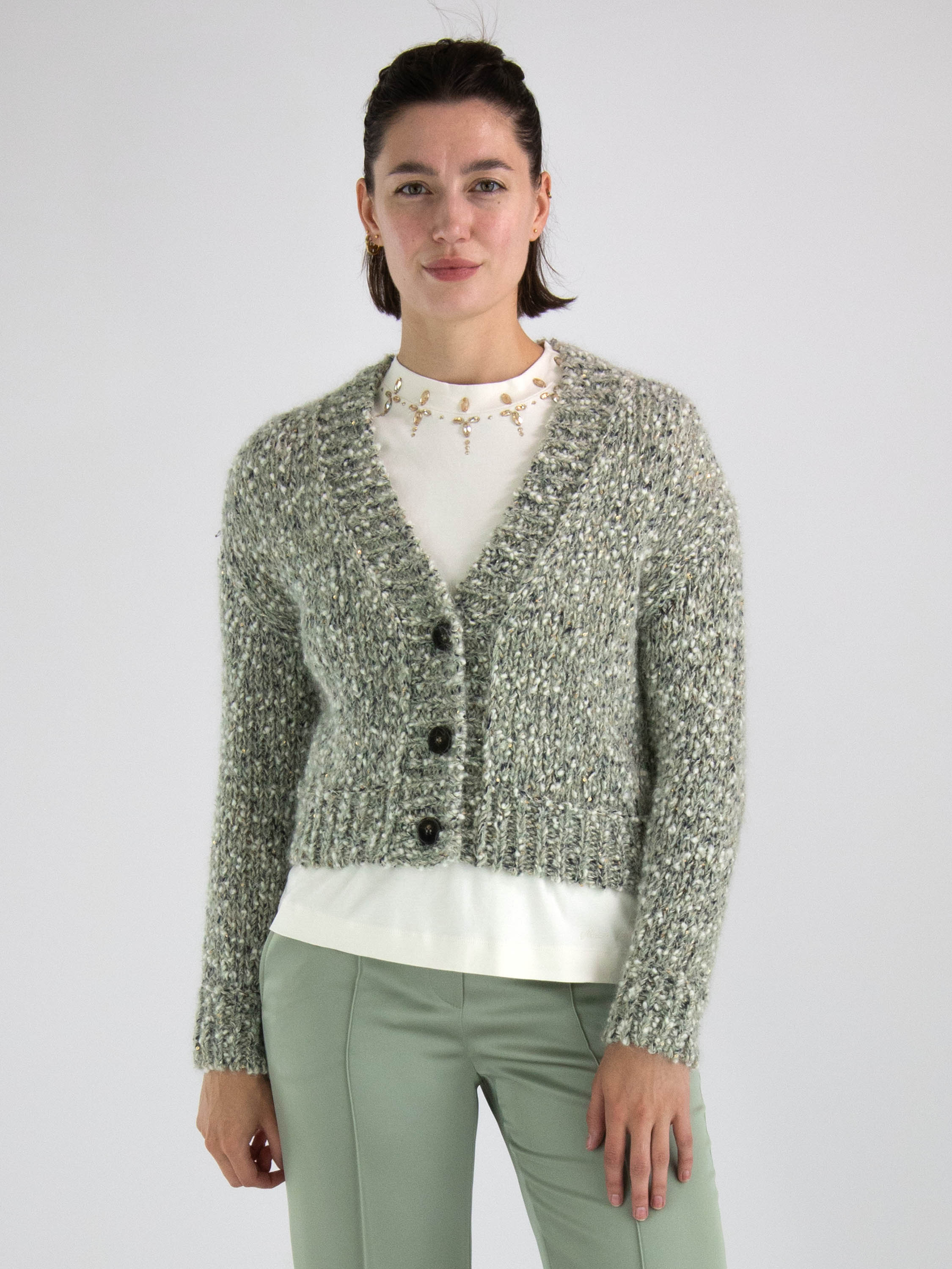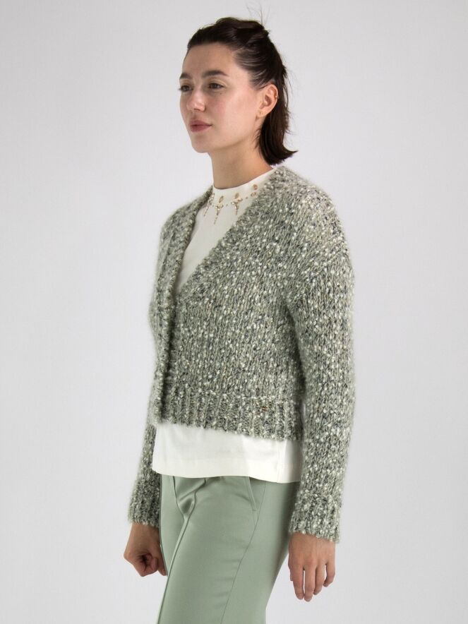 Een kort gebreid gemêleerd vest van Marc Cain met meerdere tinten olijfgroen en roomwit. Door de stof is een gouddraad geweven met goudkleurige lovertjes. Het vest heeft een 3 knoops sluiting en mag op de hand worden gewassen.