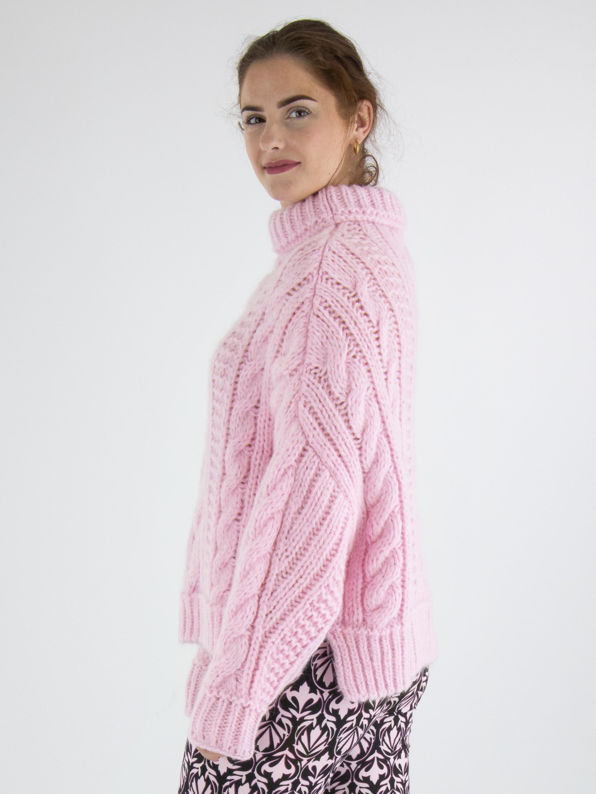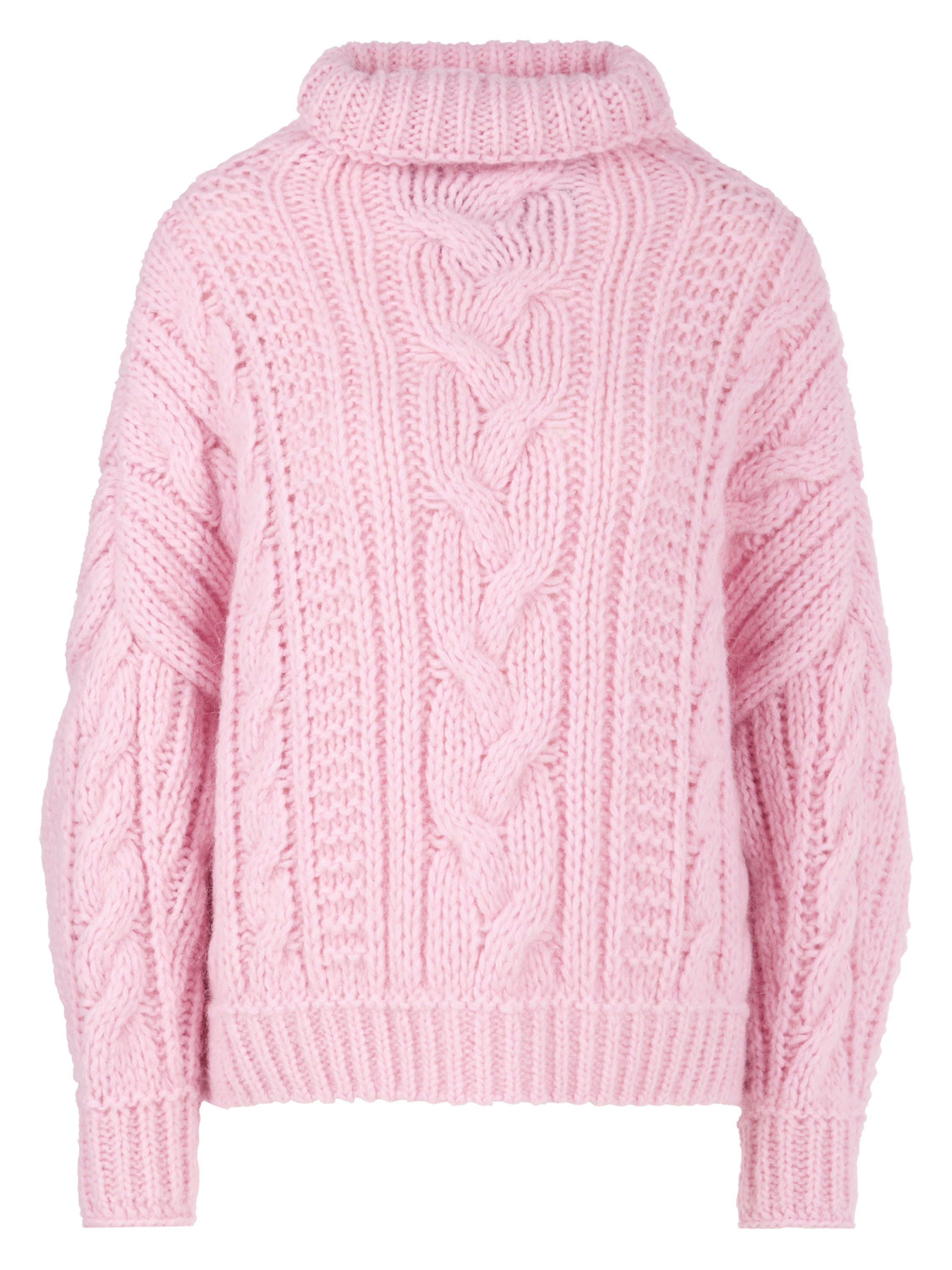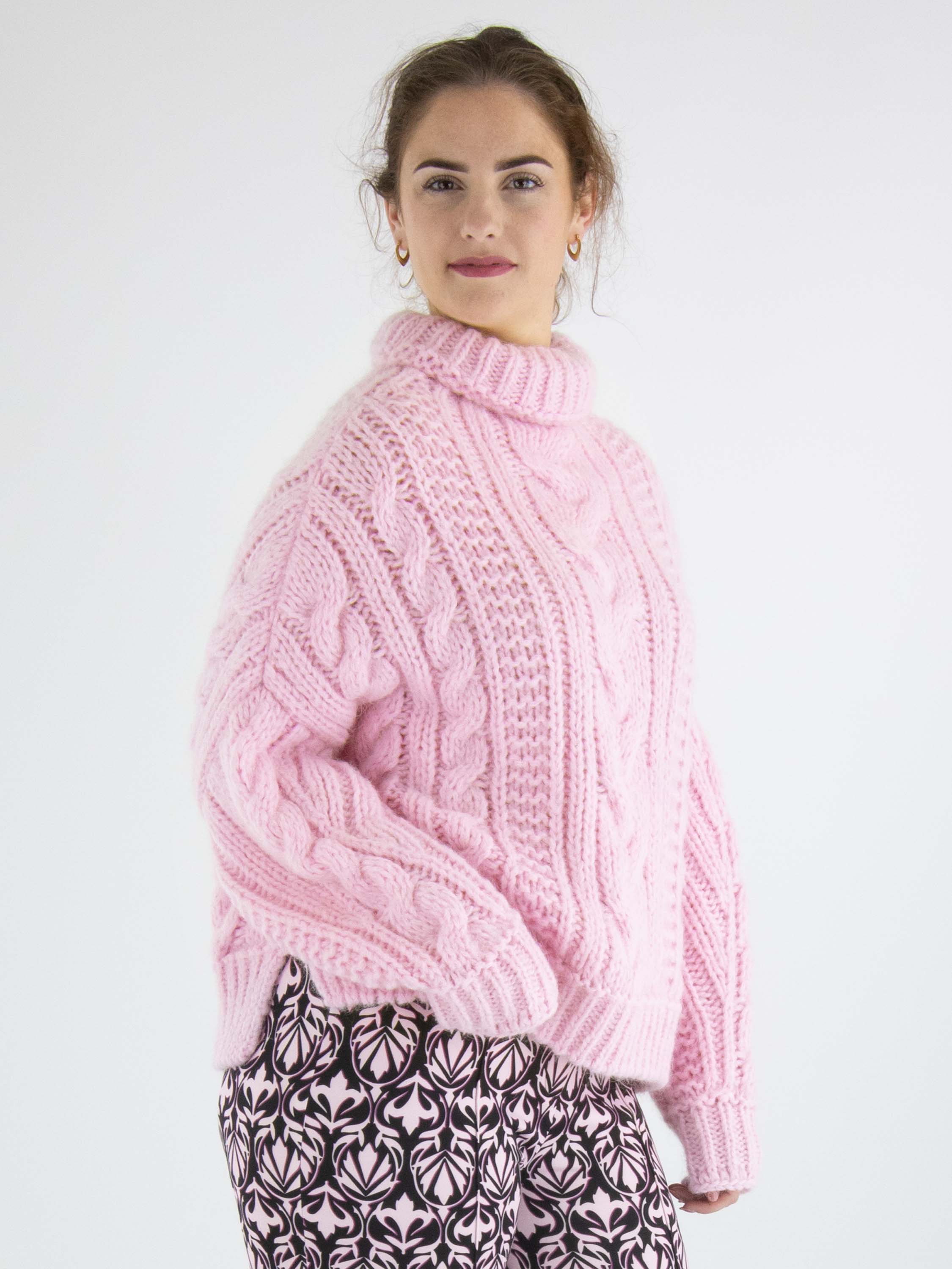 Een pullover van Marc Cain in een kabelpatroon gecombineerd met twee andere patronen in de kleur roze. De pullover heeft een turtleneck en lange mouwen. Deze pullover mag met de hand worden gewassen.
