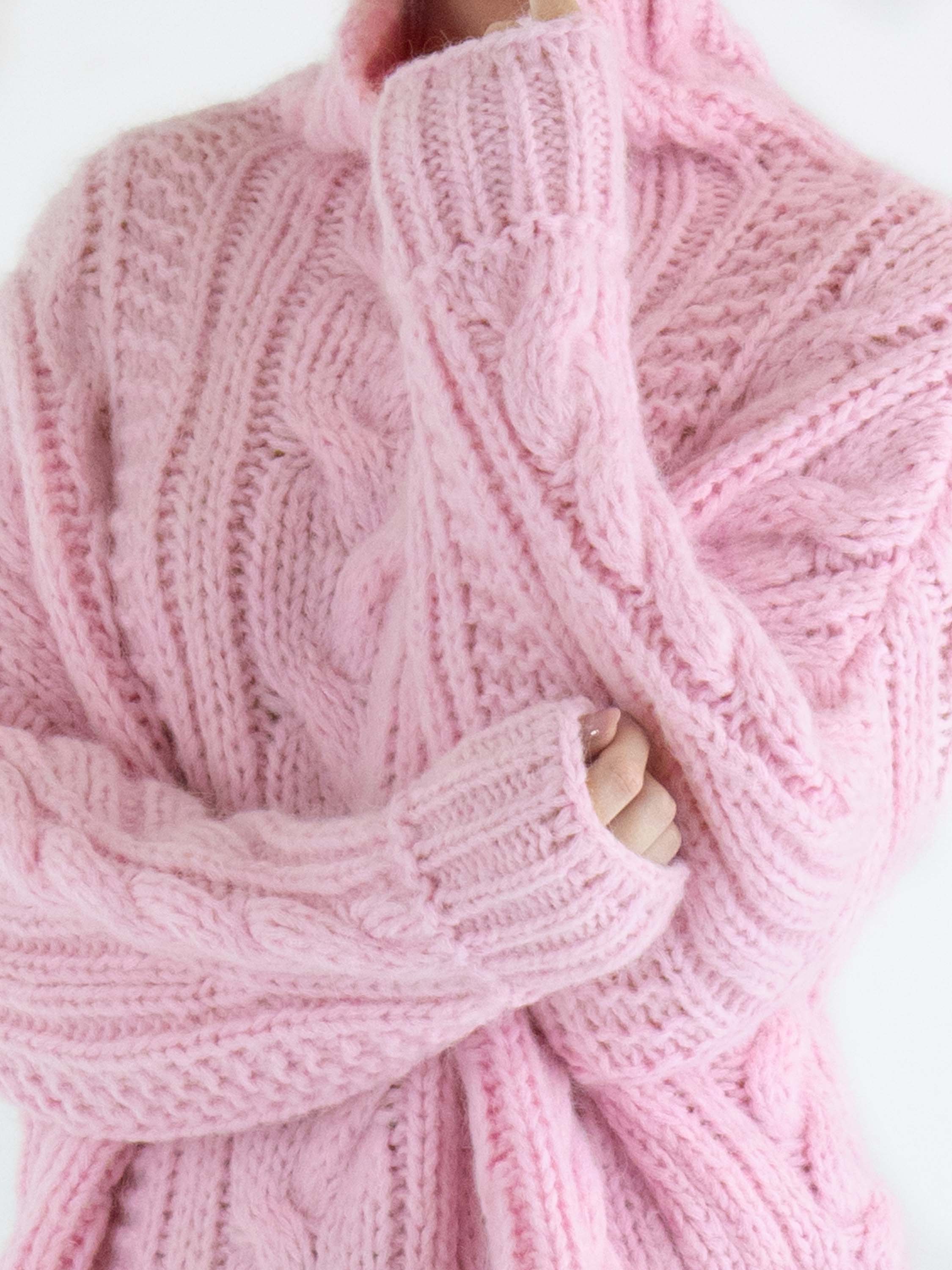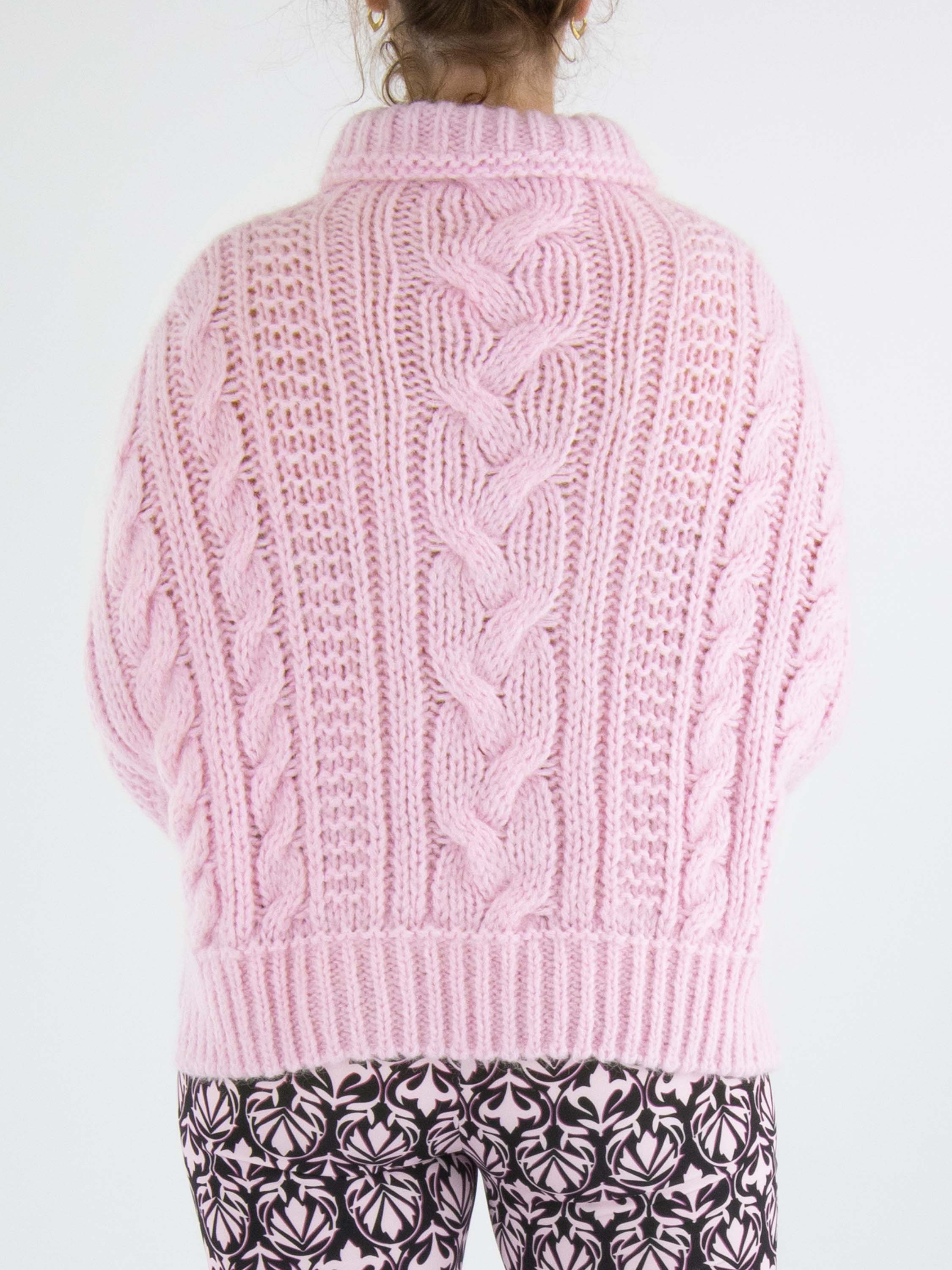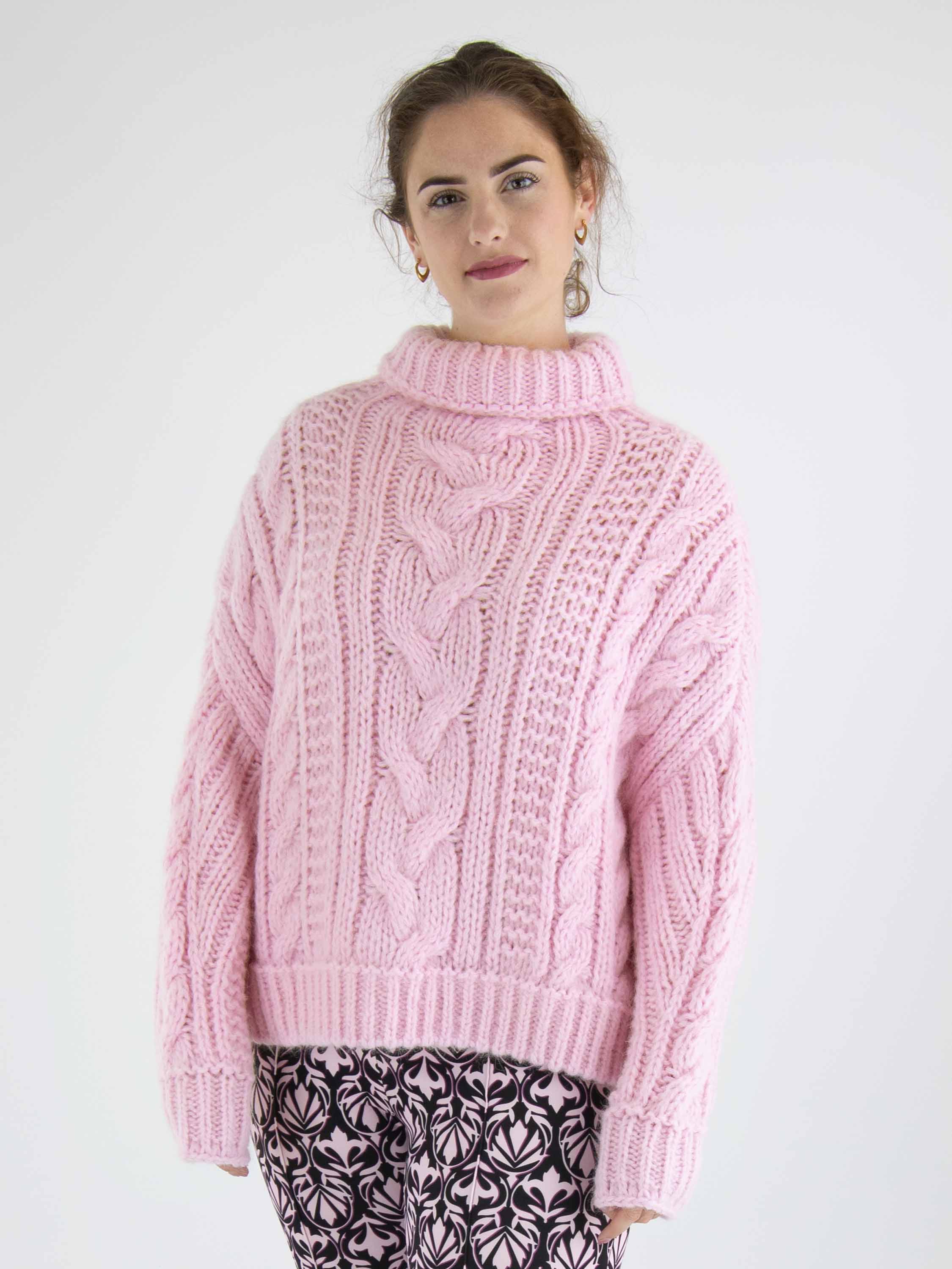 Een pullover van Marc Cain in een kabelpatroon gecombineerd met twee andere patronen in de kleur roze. De pullover heeft een turtleneck en lange mouwen. Deze pullover mag met de hand worden gewassen.