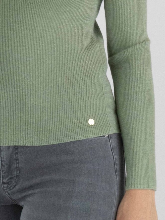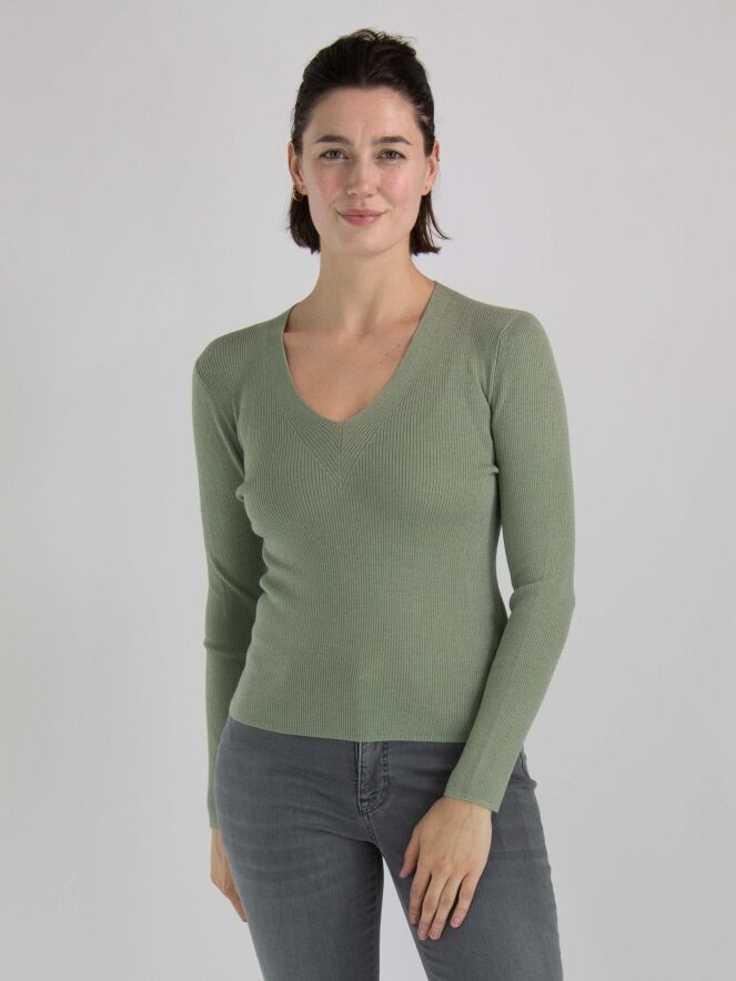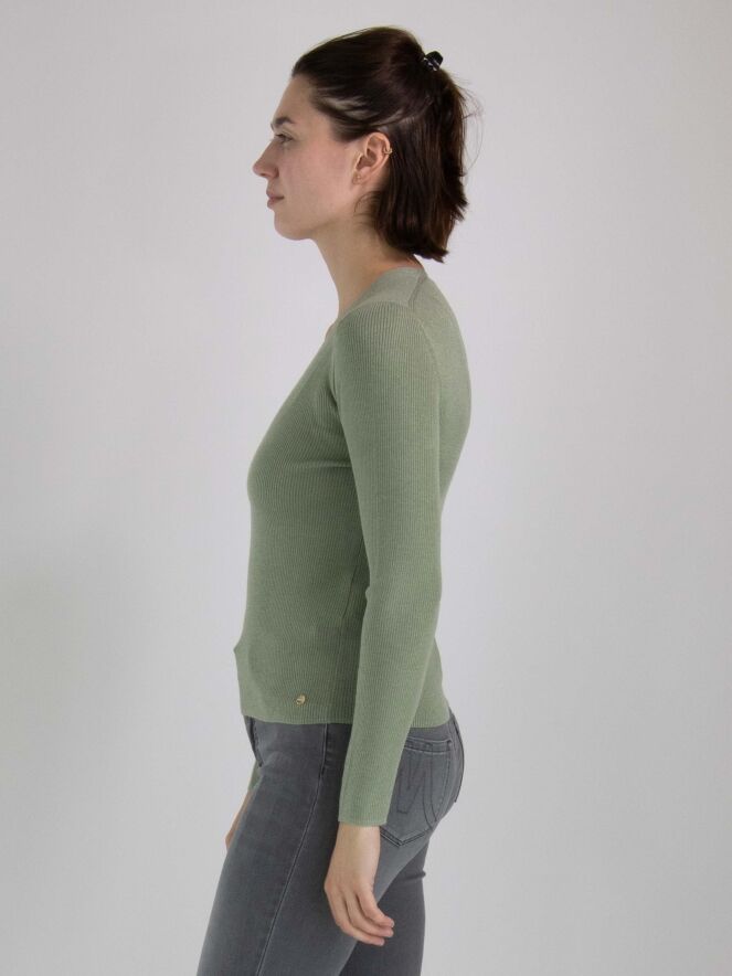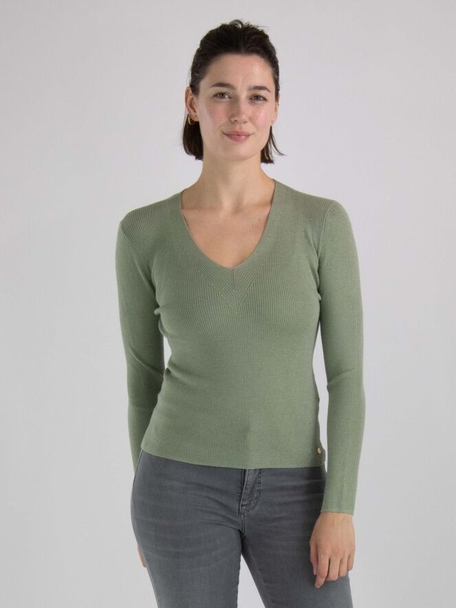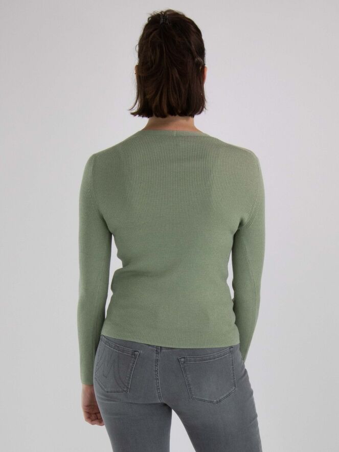 Een shirt van Marc Cain in een geribbelde structuur in de kleur pastel olijfgroen. In de stof is een zilverdraad geweven. Het shirt heeft een V-hals en lange mouwen. Dit shirt mag met de hand worden gewassen.