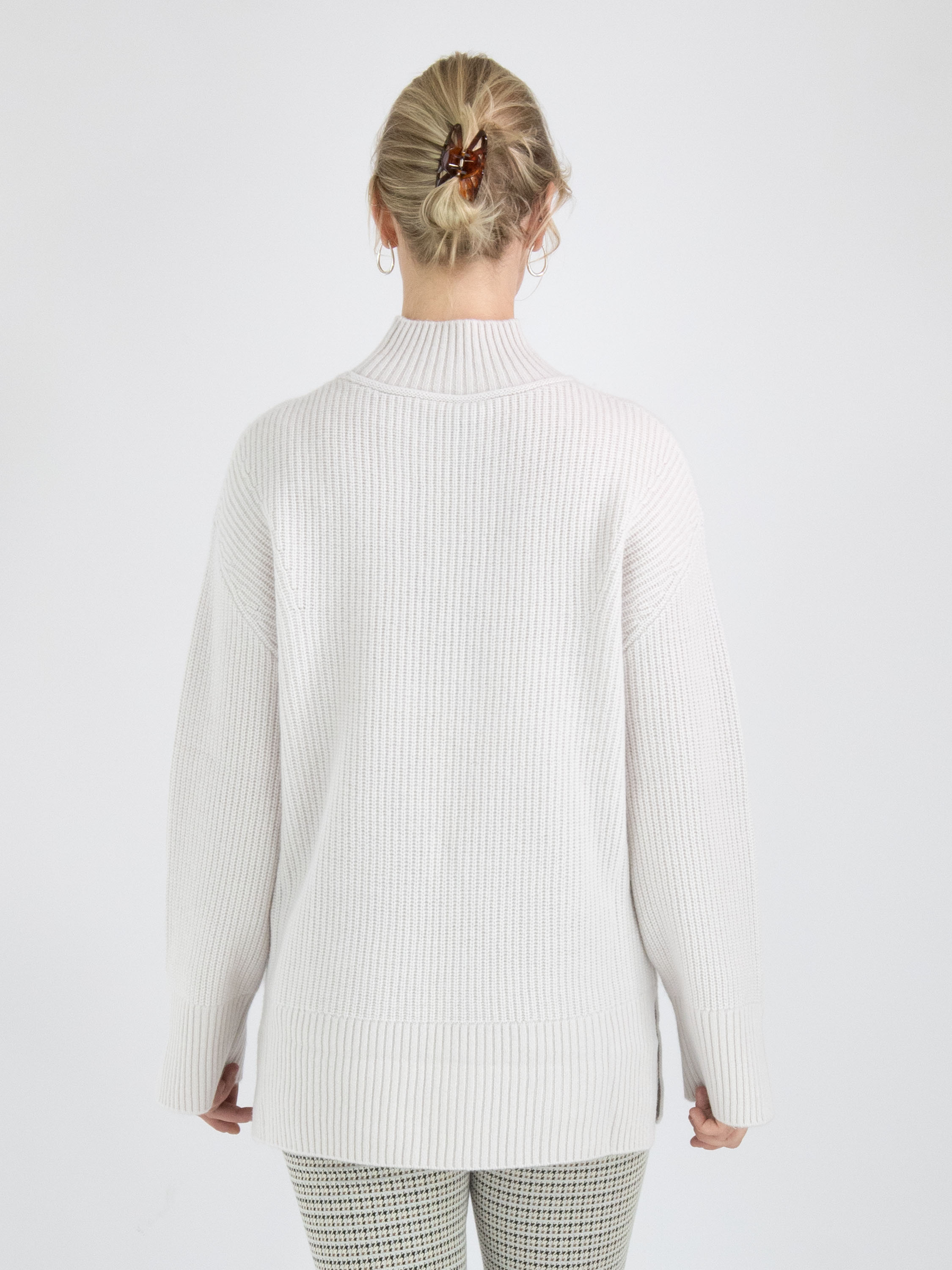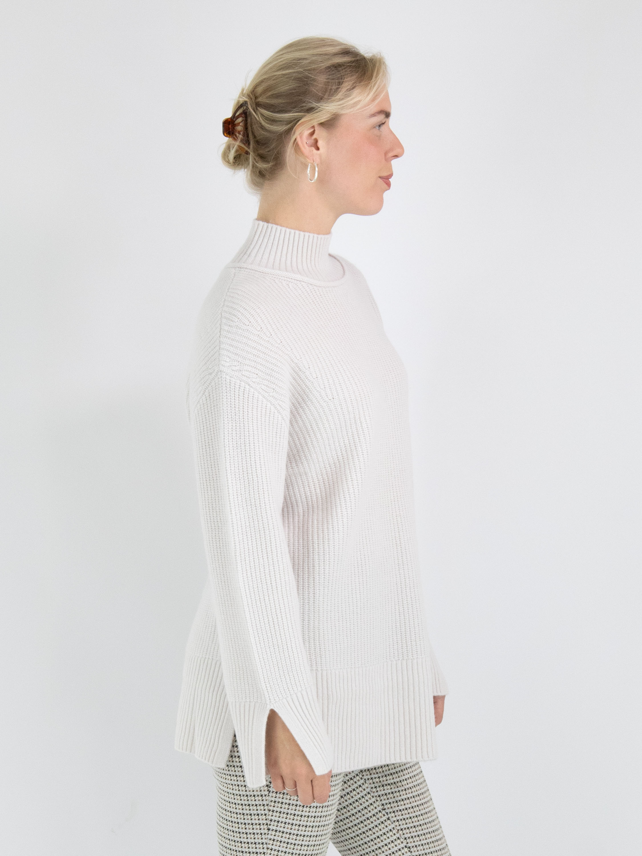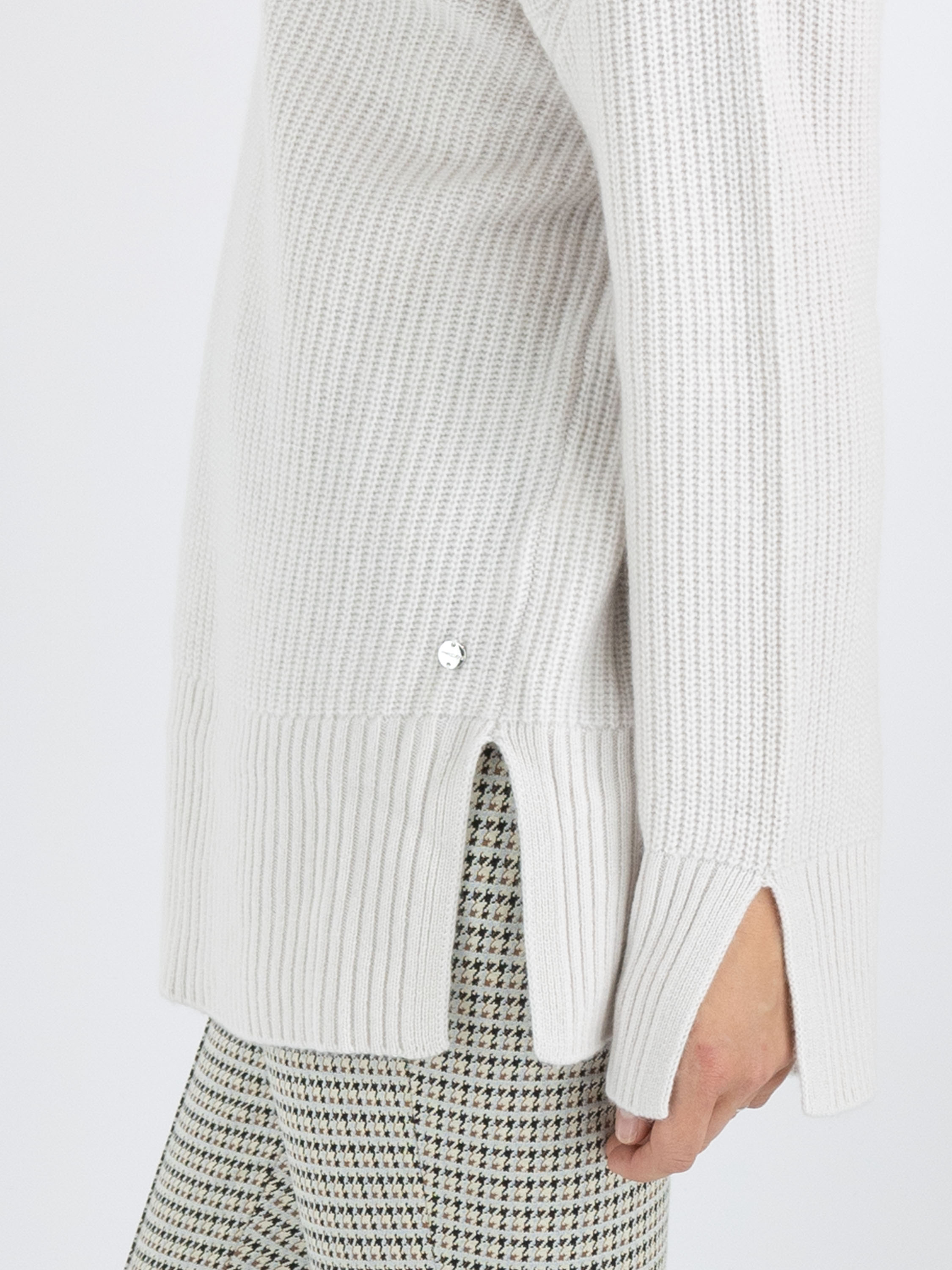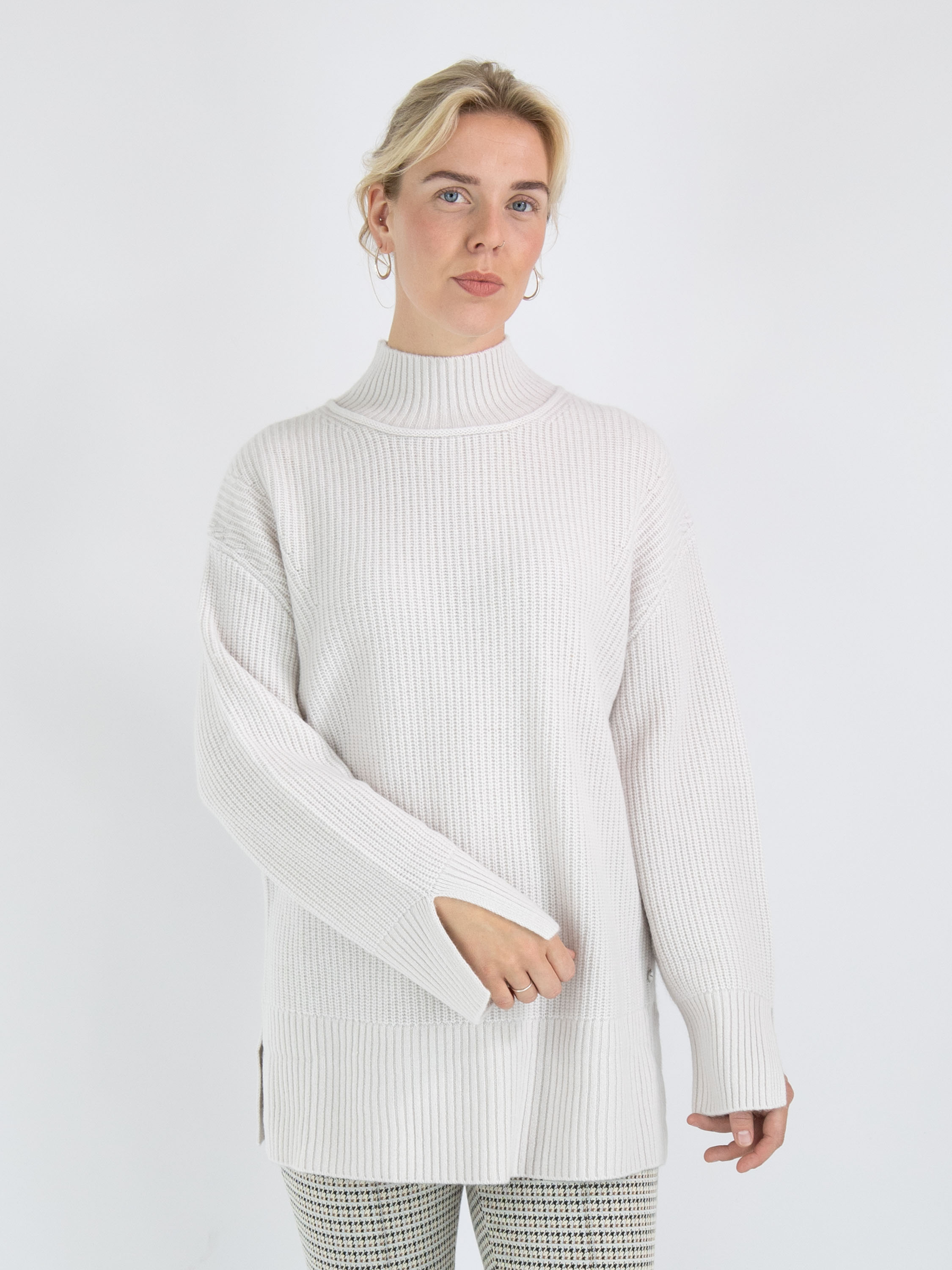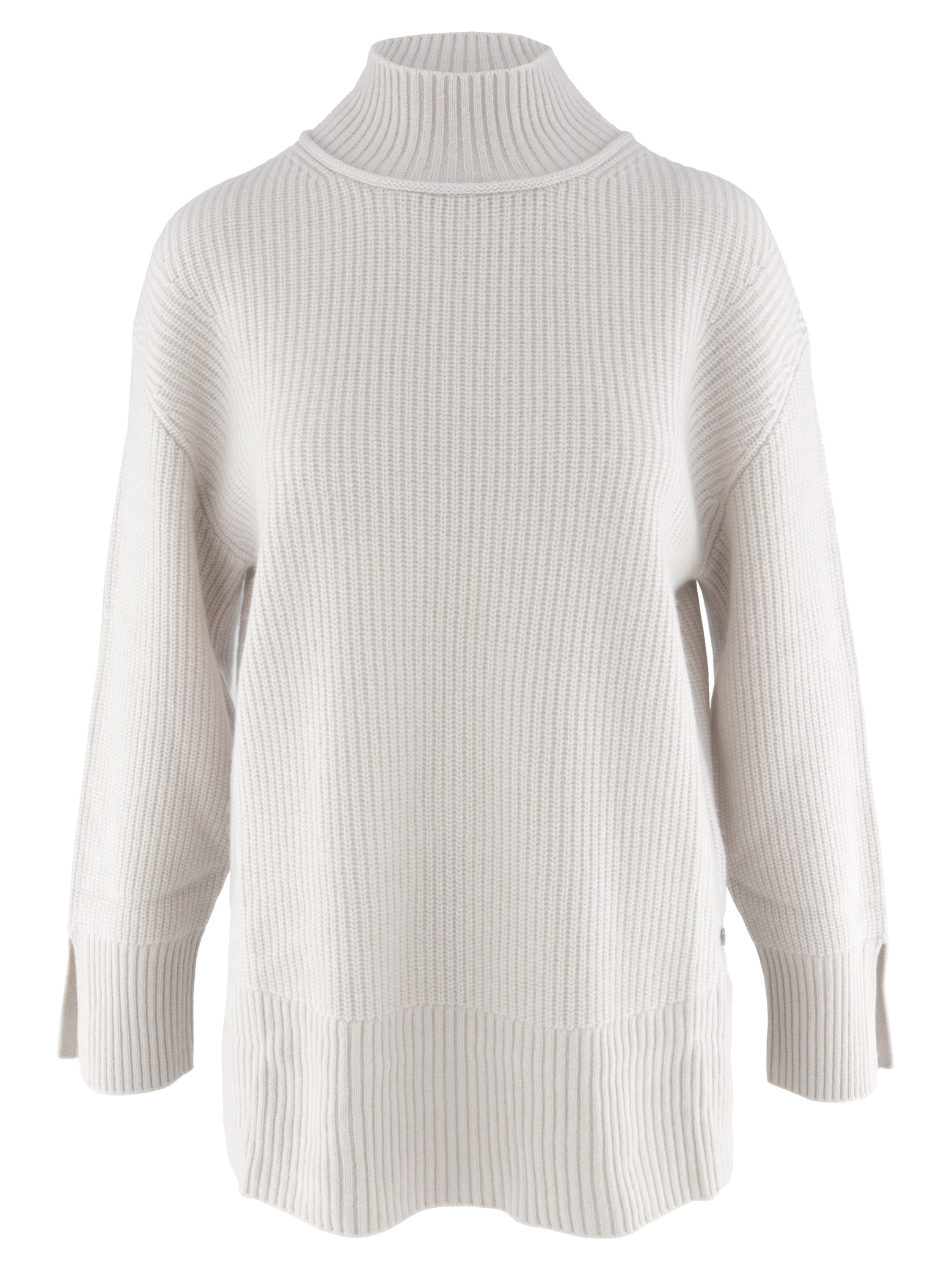 Een ruime pullover van Marc Cain, gebreid in een patentsteek, in de kleur roomwit. De pullover heeft een turtleneck en aan de onderkant is aan beide zijden een split. De pullover heeft lange mouwen en mag met de hand worden gewassen.