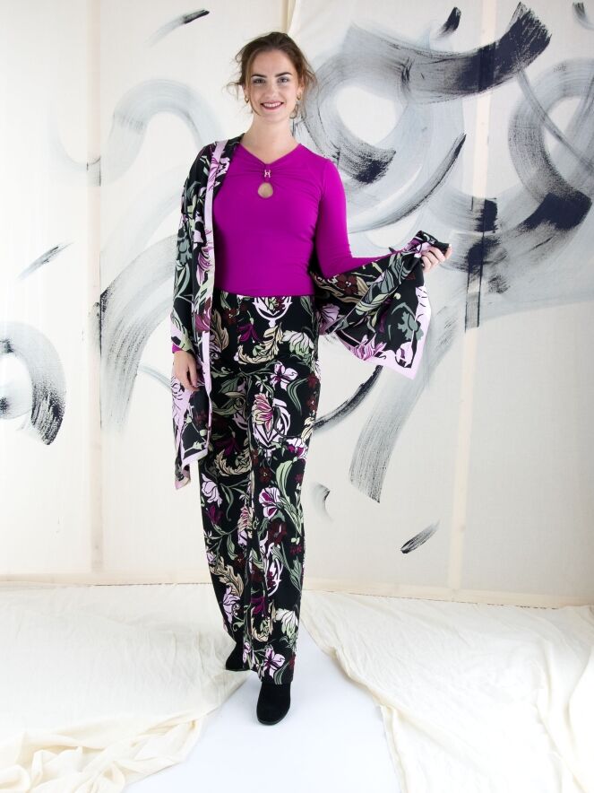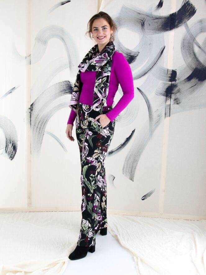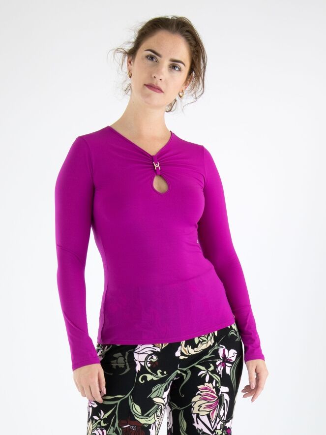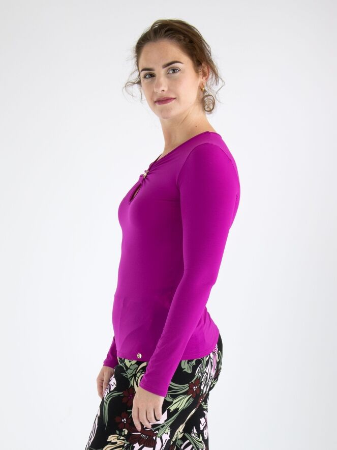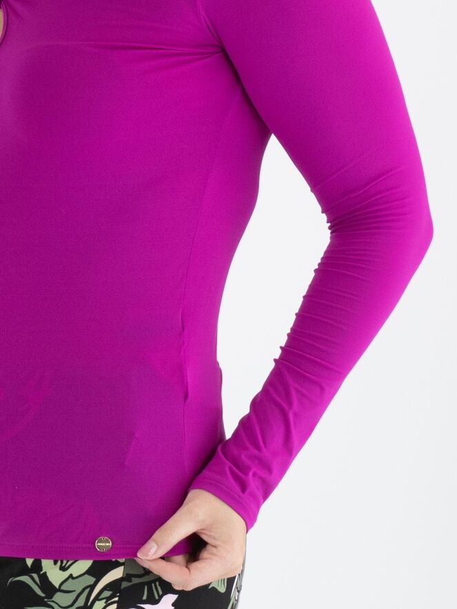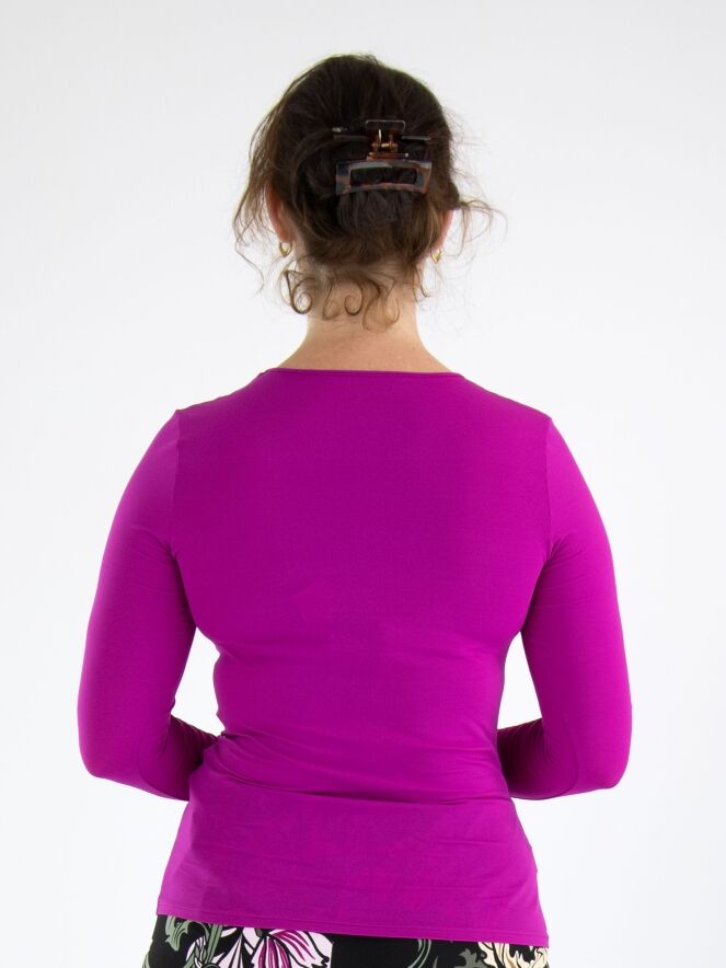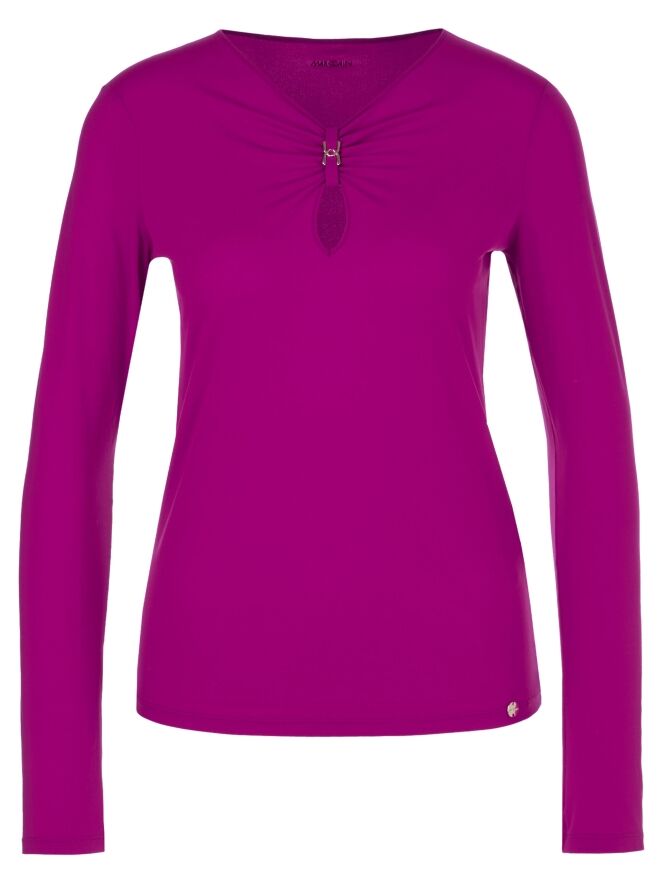 Een pantyshirt van Marc Cain in de kleur paars. Tussen de ronde hals en de buste is een druppelopening. Vanuit deze opening is er een band naar de ronde hals die een geplooid effect creëert. Het shirt heeft lange mouwen en mag op 30 graden worden gewassen.