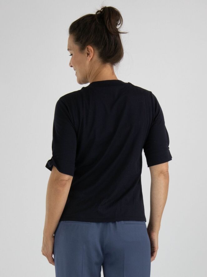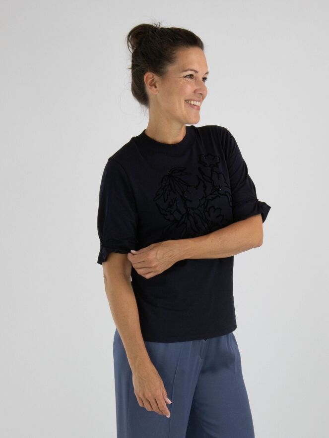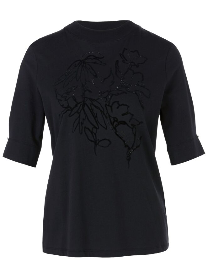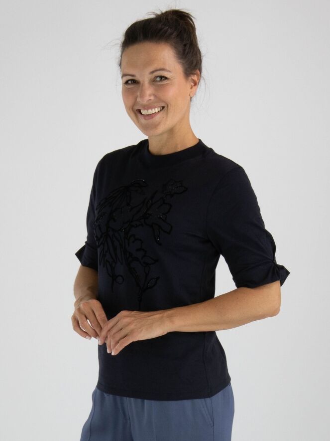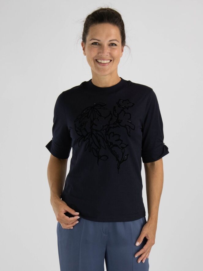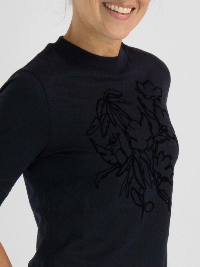 Een shirt van Marc Cain in de kleur marineblauw. Aan de voorzijde is een dessin van bloemen in velour biezen met strassteentjes. Het shirt heeft korte mouwen en een hoge ronde hals met langs de rand een fijn geribbelde tricot boord. Dit shirt mag op 30 graden worden gewassen.