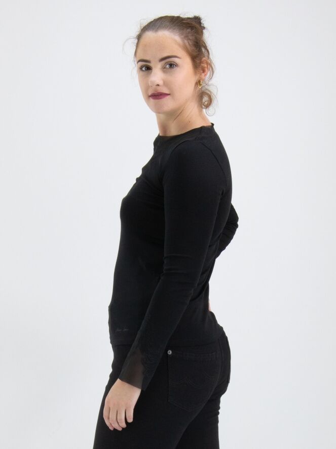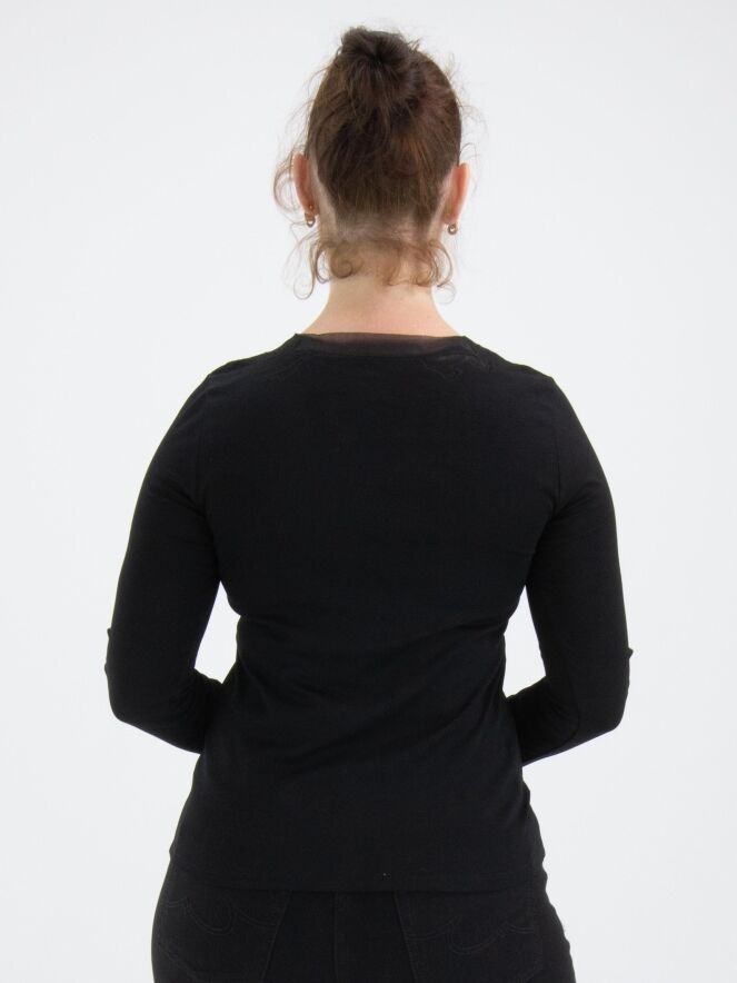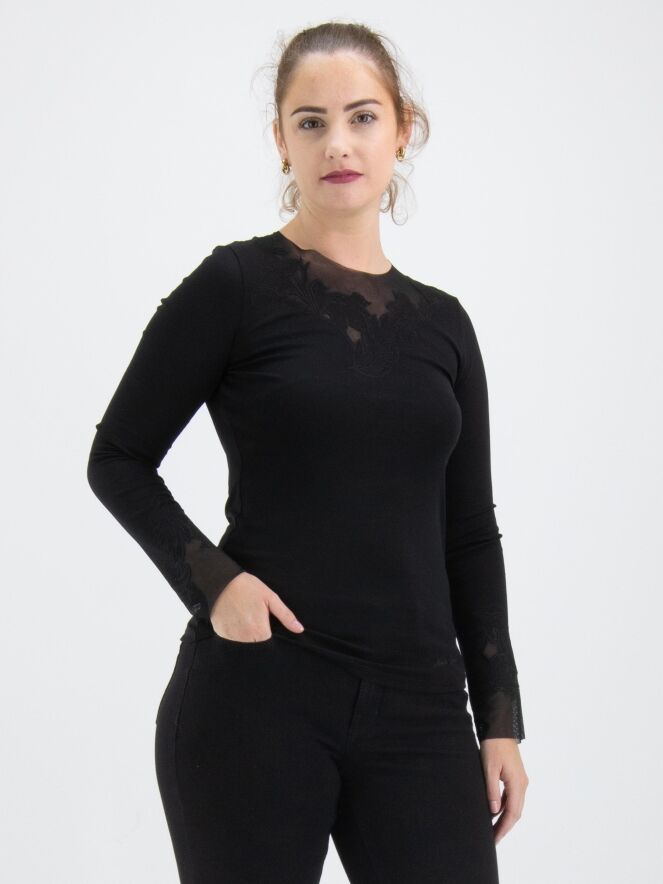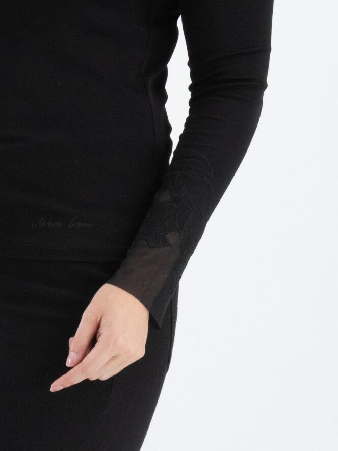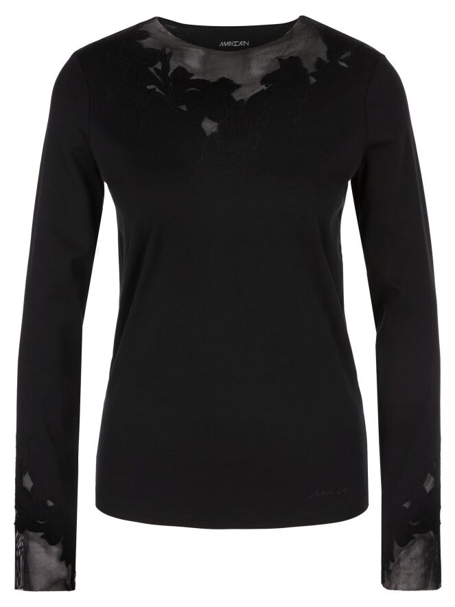 Een shirt van Marc Cain in de kleur zwart. Langs de rand van de ronde hals is een voile stof met een bladstructuur die met biezen wordt vormgegeven. Dit detail komt terug aan het uiteinde van de lange mouwen. Dit shirt mag op 30 graden worden gewassen.