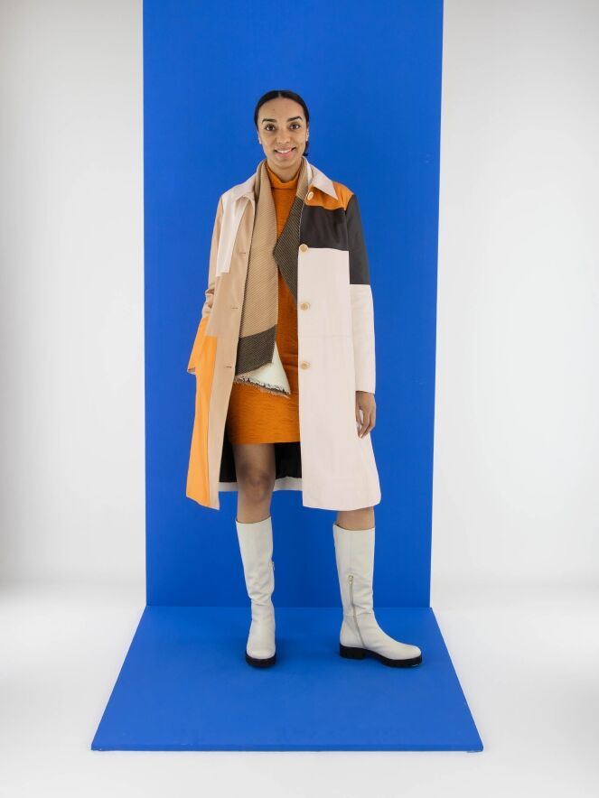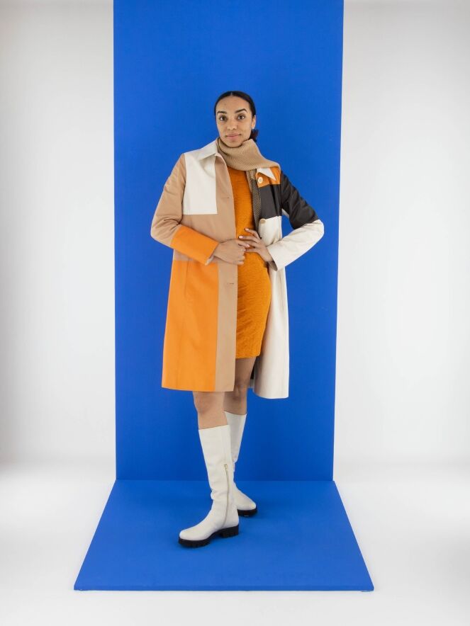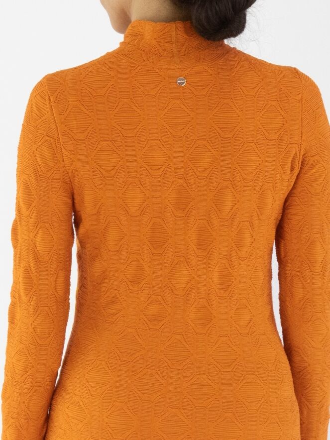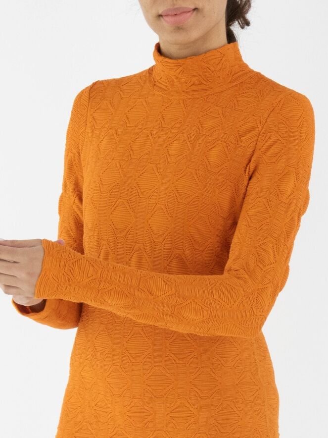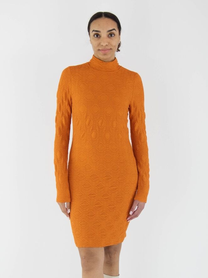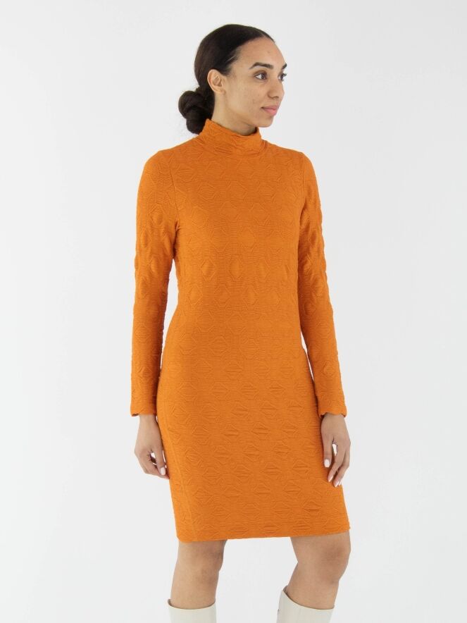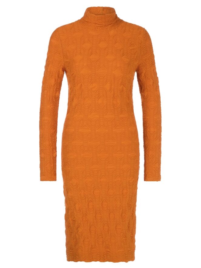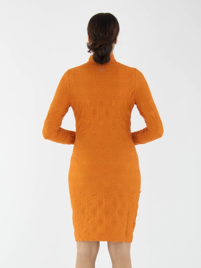 Een jurk van Marc Cain in de kleur oranje. De stof is licht getailleerd en heeft een gesmokte structuur. De jurk heeft een turtle hals en lange mouwen en mag op 30 graden worden gewassen.