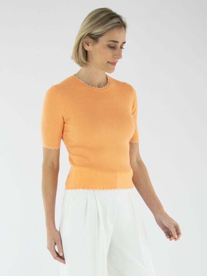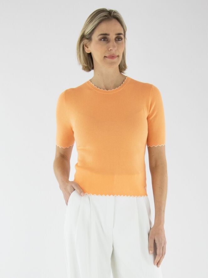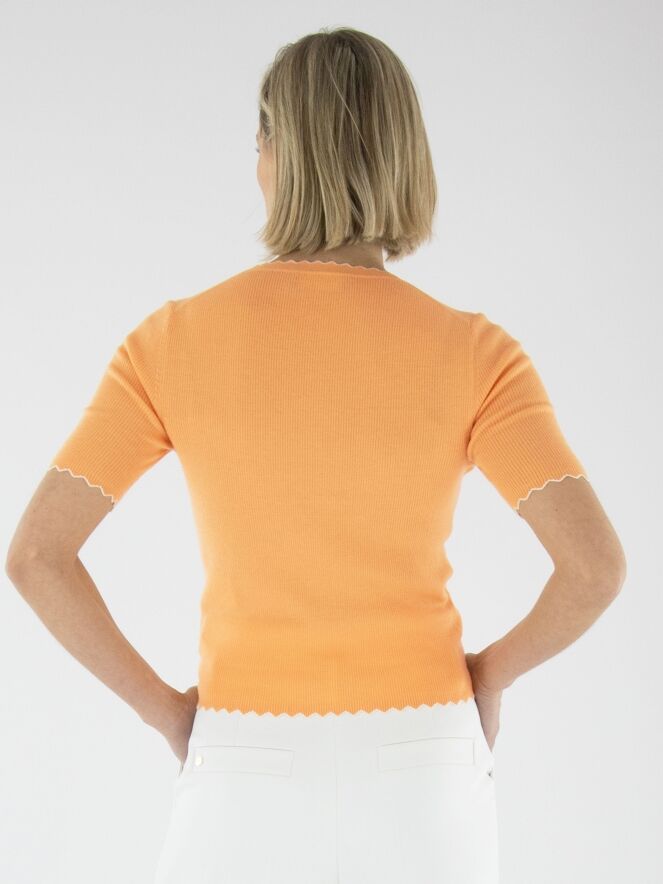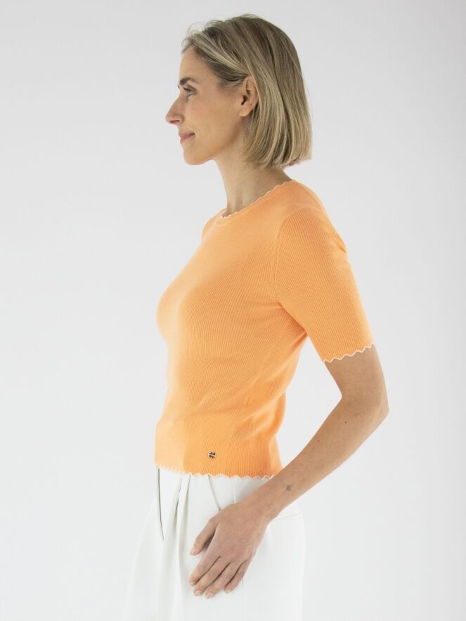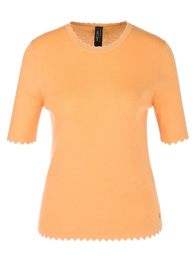 Een shirt van Marc Cain in de kleur oranje. De stof is fijn geribbeld. De rand van de ronde hals, korte mouwen en onderkant is afgewerkt in een golvend patroon met een witte bies. Dit shirt dient met de hand te worden gewassen.