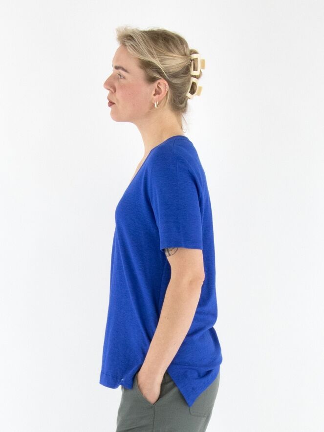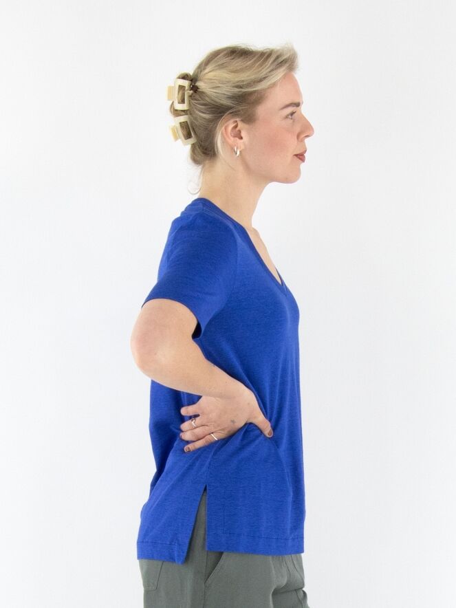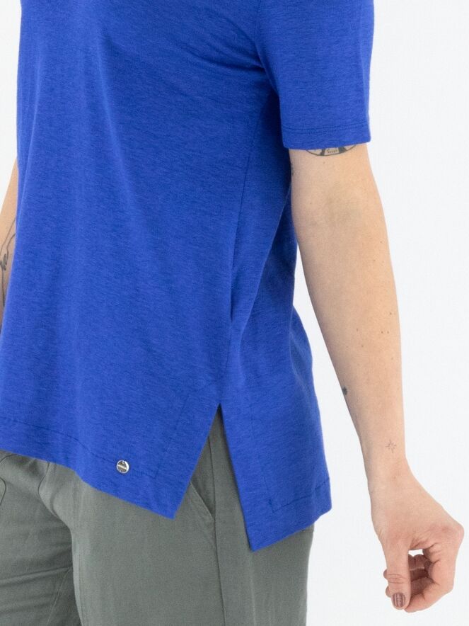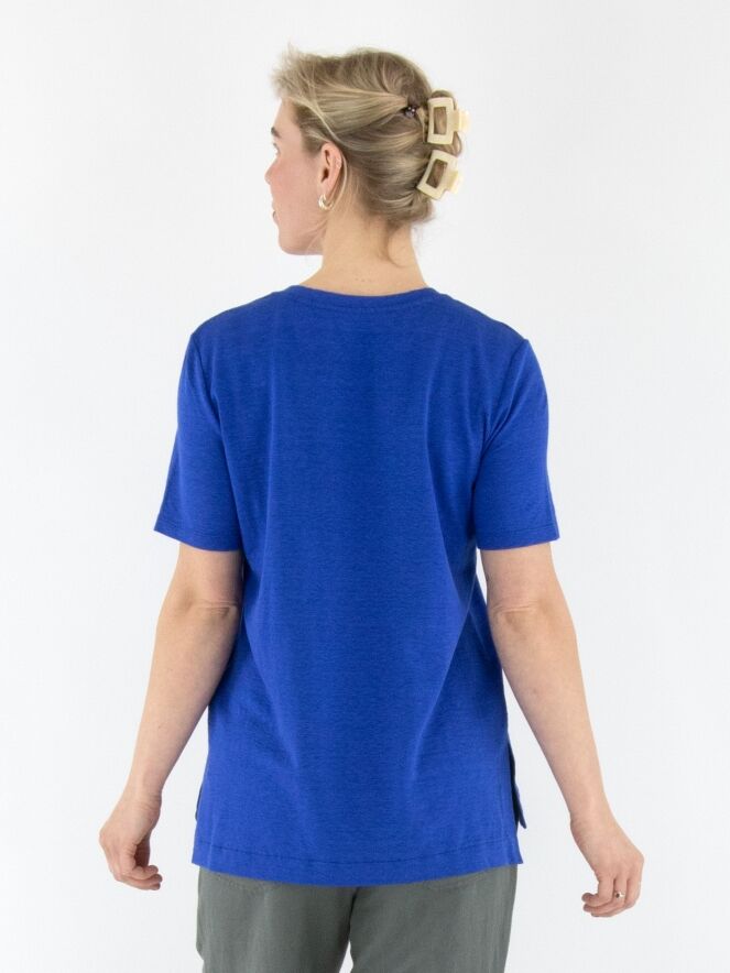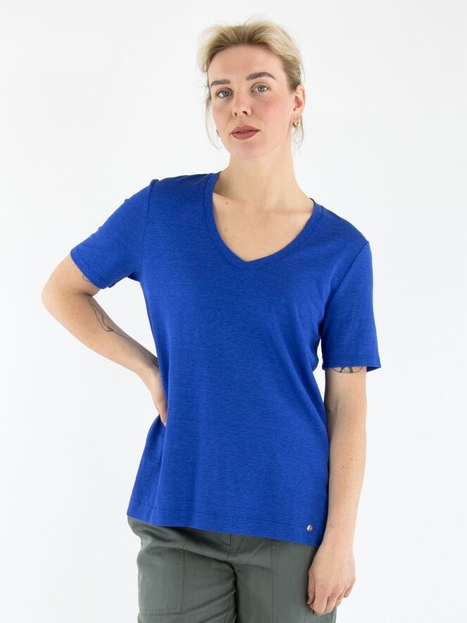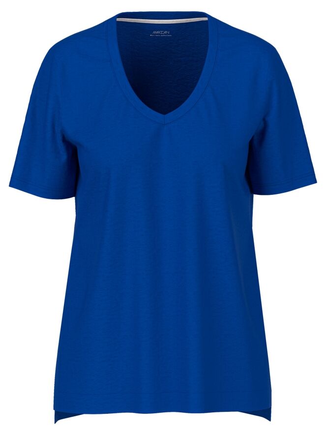 Een shirt van Marc Cain in de kleur kobaltblauw. Het shirt heeft een V-hals en aan de onderkant zit aan beide zijkanten een korte split. Dit shirt mag op 30 graden worden gewassen.