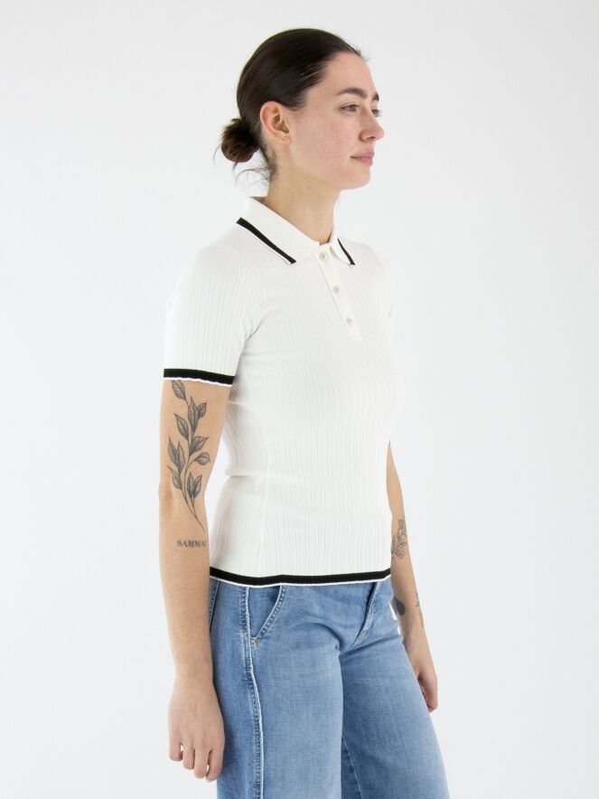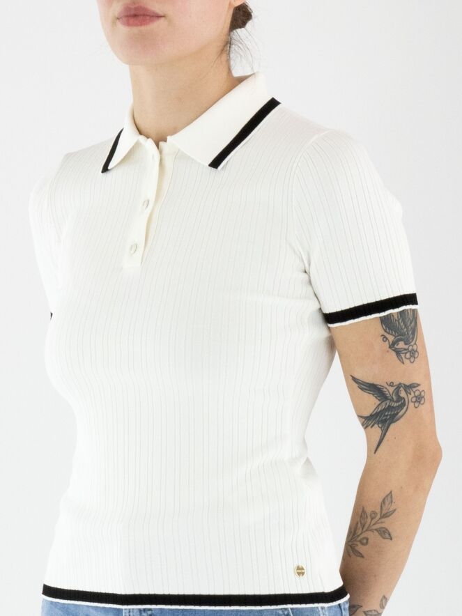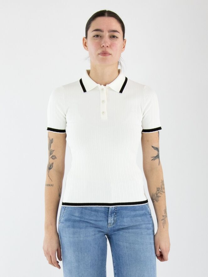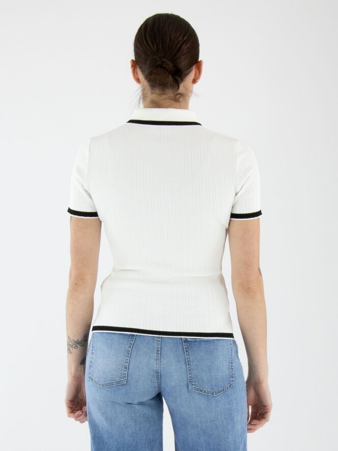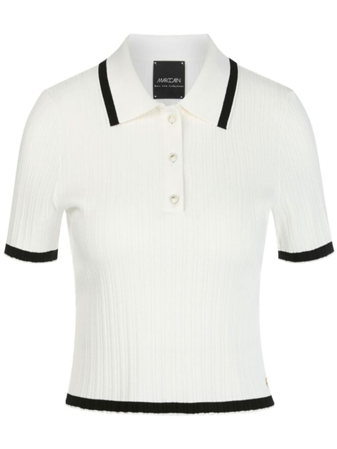 Een polo shirt van Marc Cain in de kleur roomwit. De stof is geribbeld. De polo heeft een fijn geribbelde tricot kraag met een zwarte streep langs de rand. Deze streep komt terug aan het uiteinde van de korte mouwen en de onderkant van het shirt. Dit shirt kan op 30 graden worden gewassen.