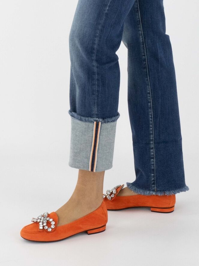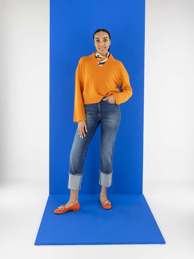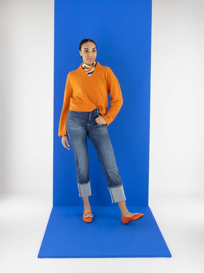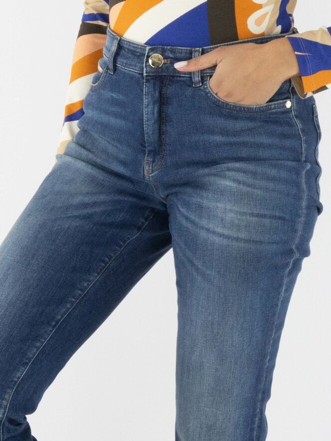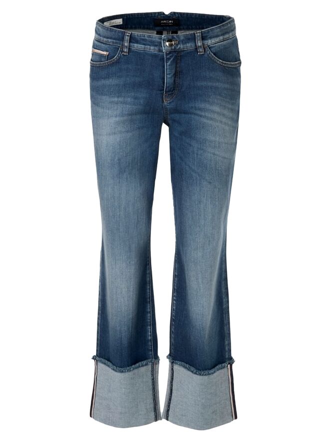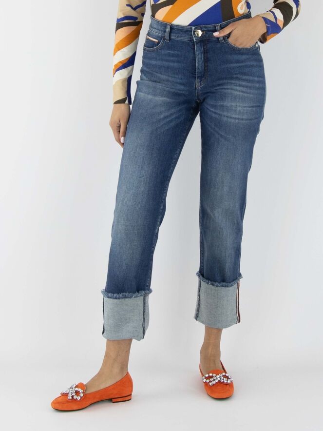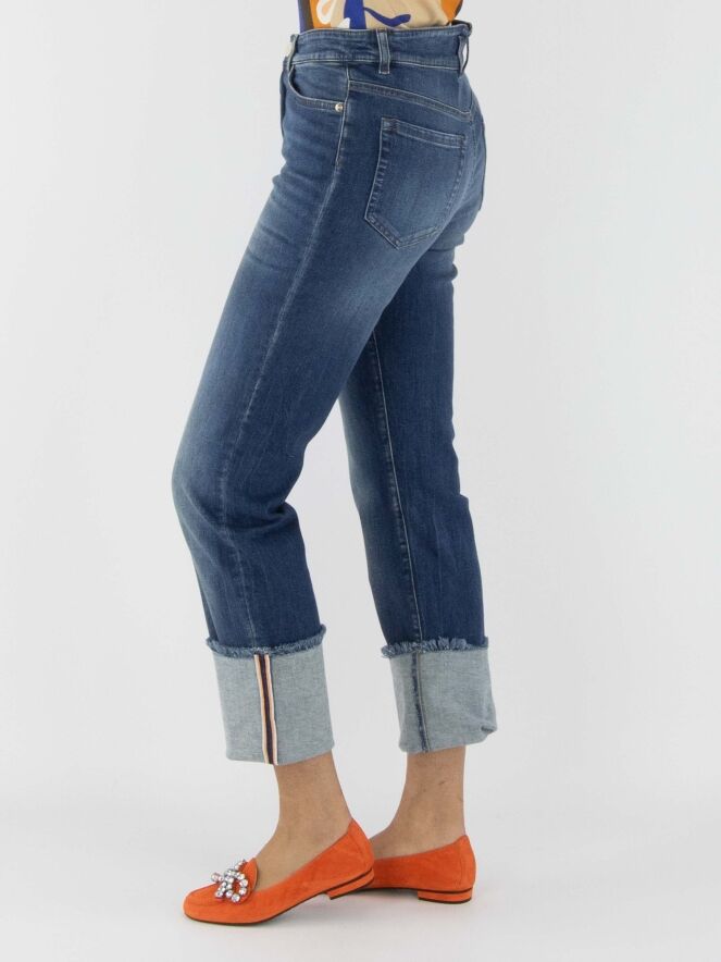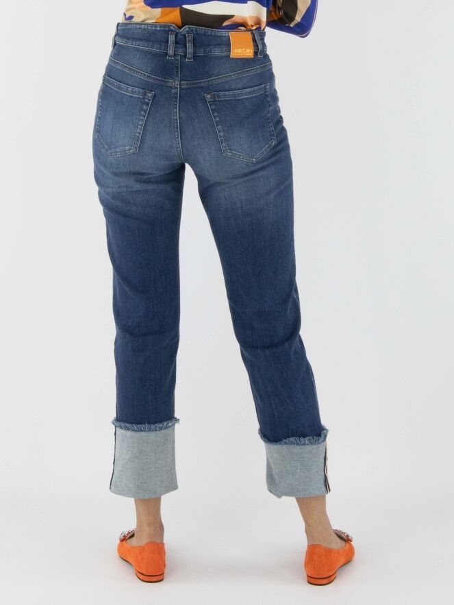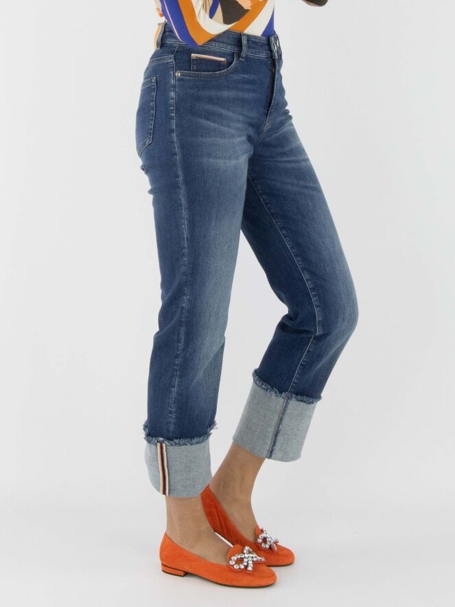 Een jeans van Marc Cain in een volle basic jeanskleur. De jeans is in een 5-pocketmodel. Aan de onderkant van de pijpen is een zeer lange omslag van 15 cm, waarbij de rand fijn gerafeld is. Deze jeans mag op 30 graden worden gewassen.