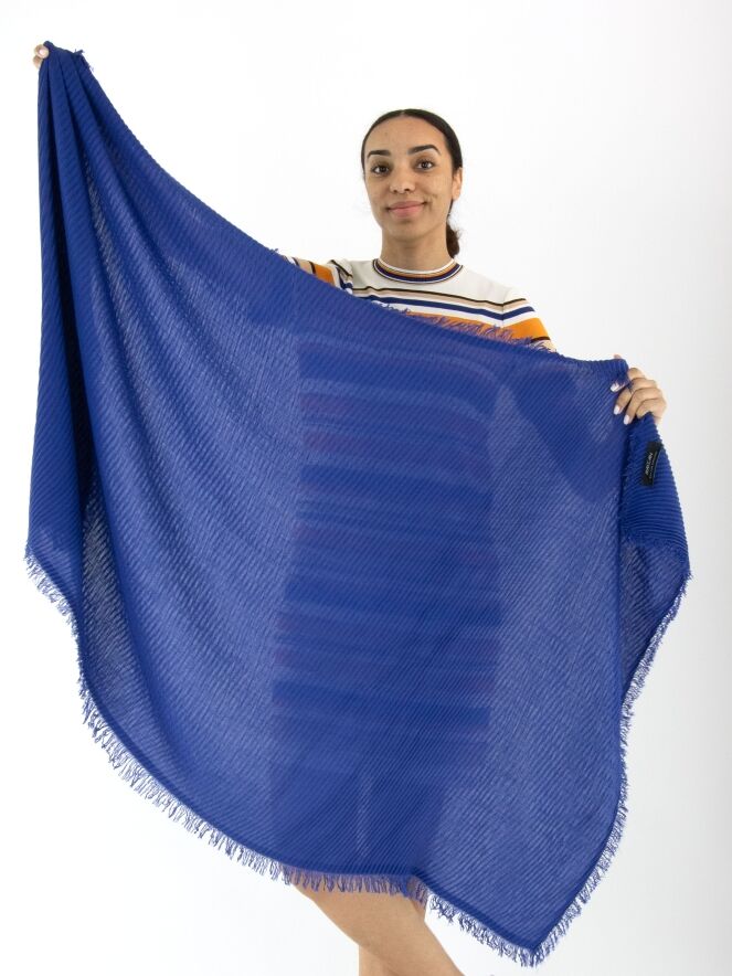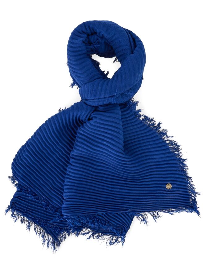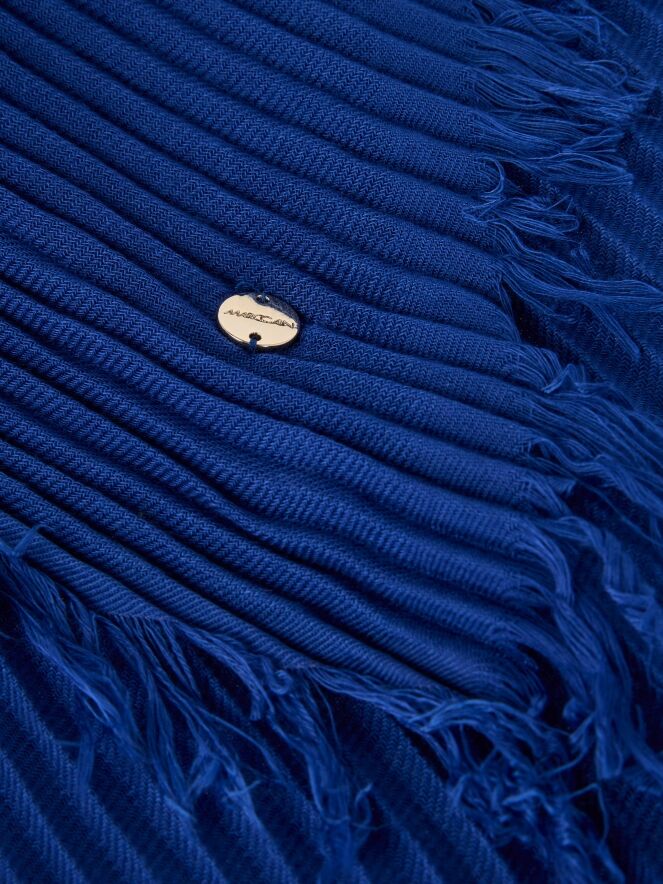 Een geribbelde shawl van Marc Cain in de kleur kobaltblauw. De uiteinden van de shawl zijn fijn gerafeld. Deze shawl dient met de hand te worden gewassen.