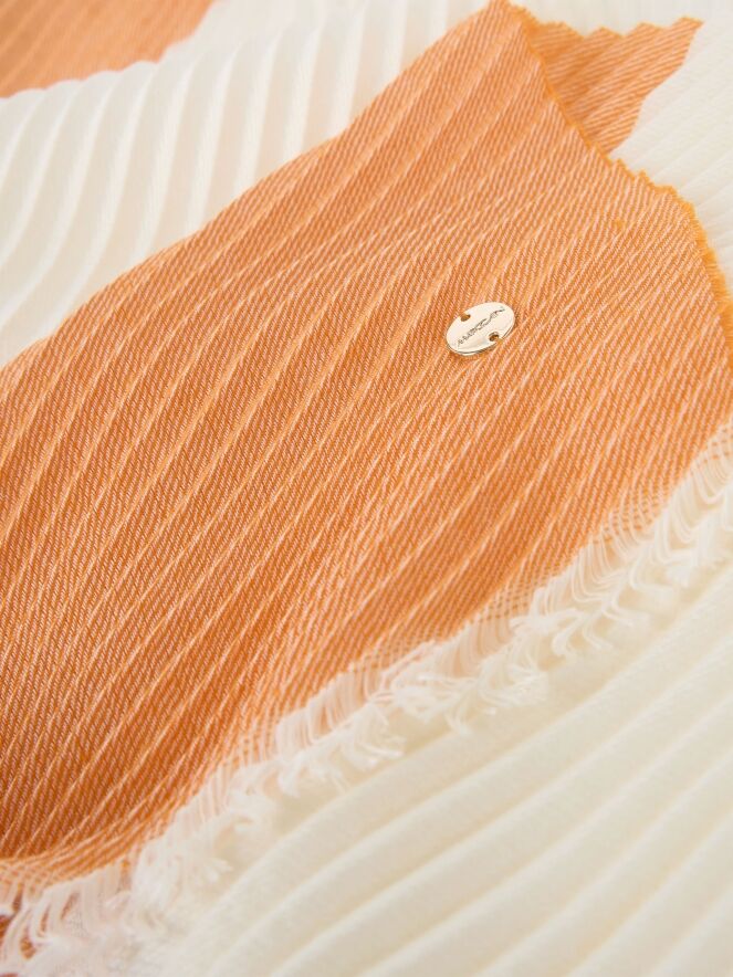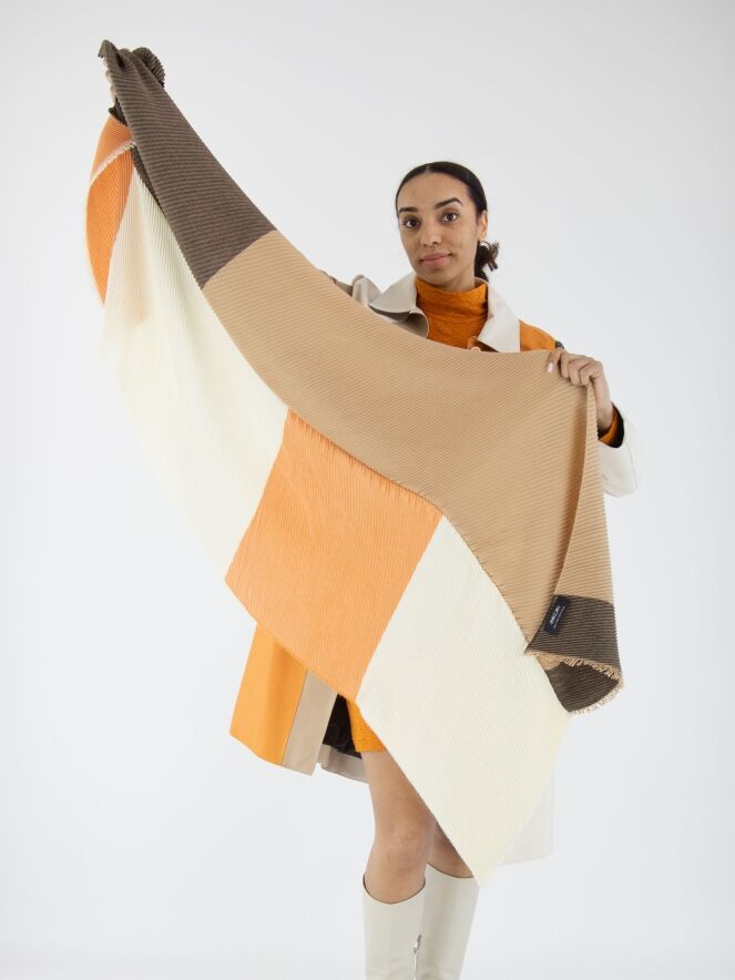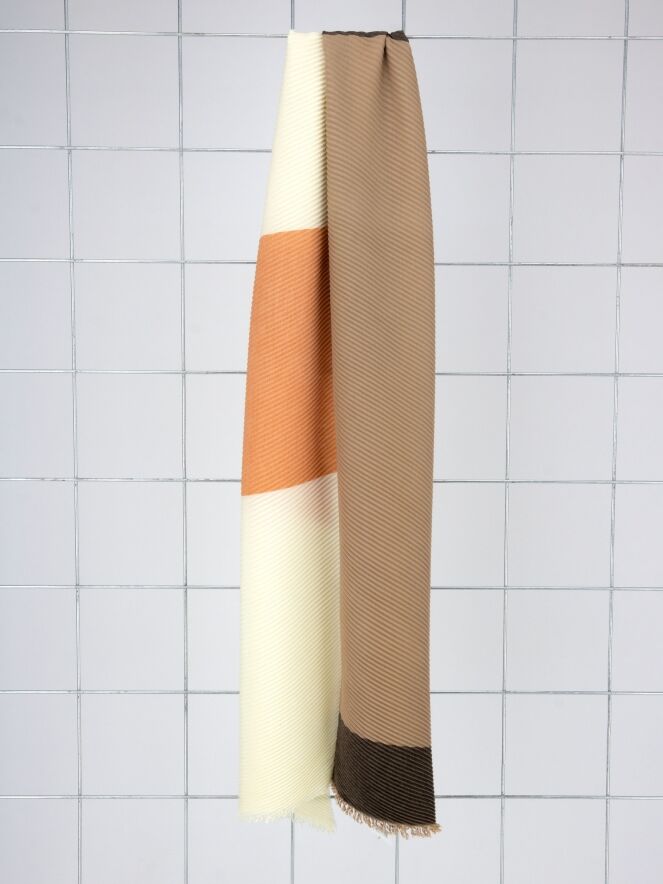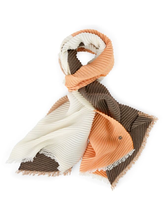 Een geribbelde shawl van Marc Cain met meerdere kleurvlakken in verschillende tinten bruin. De uiteinden van de shawl zijn fijn gerafeld. Deze shawl dient met de hand te worden gewassen.