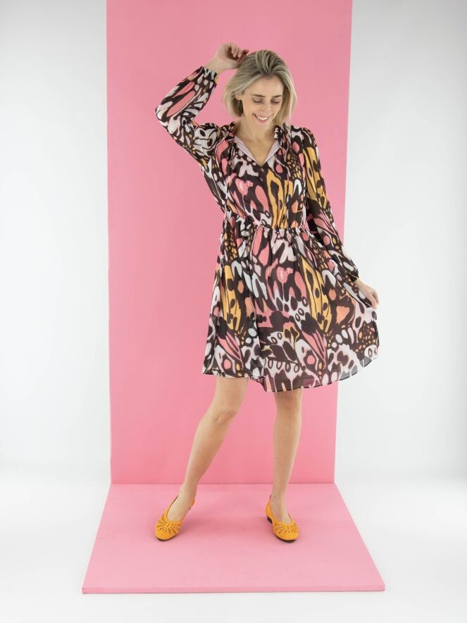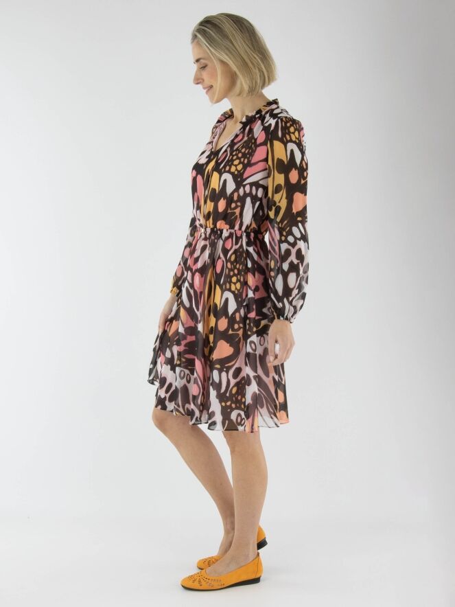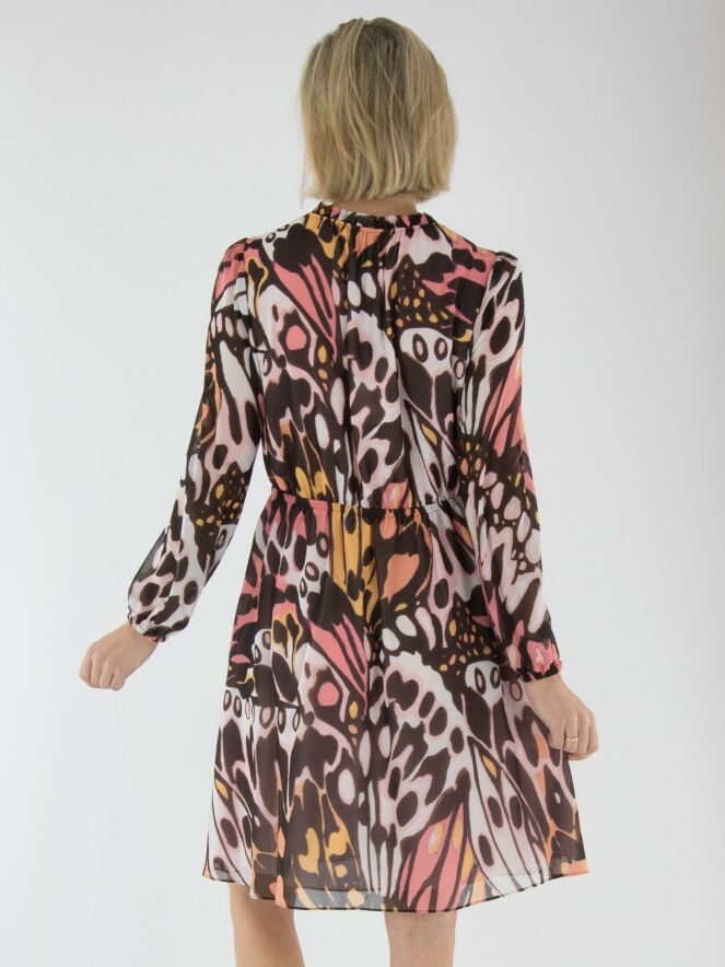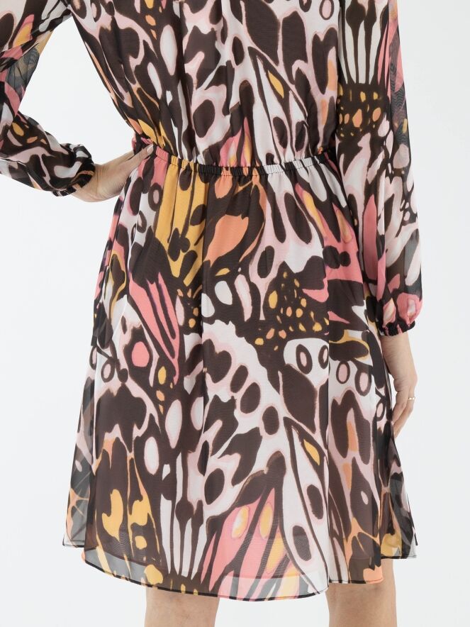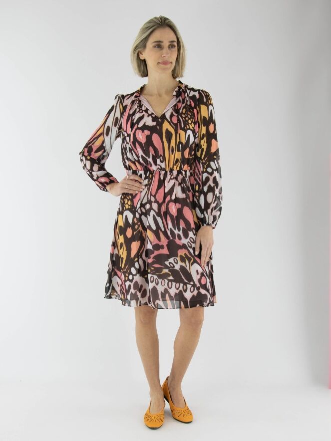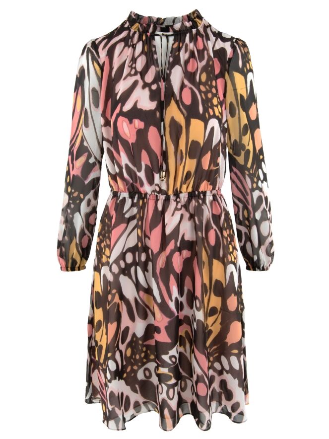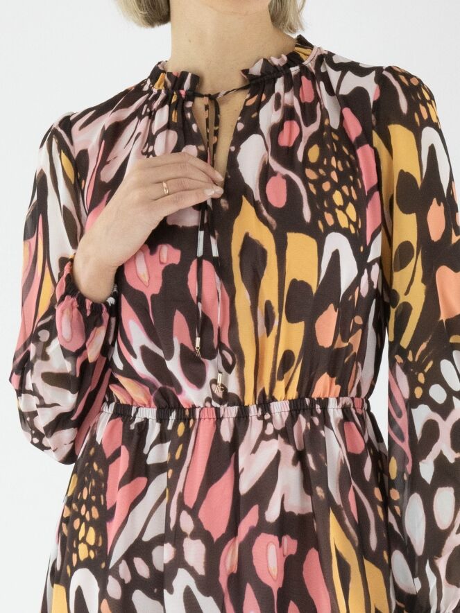 Een licht transparante jurk van Marc Cain in een grafische flower-power print met de kleuren oranje, zalmroze, zwart en roomwit. Langs de rand van de ronde hals loopt een fijn geplooide transparante bies met een koord in een tunnelverwerking. In het midden van de hals bevindt zich een V-uitsnijding tot aan de buste. Ter hoogte van de taille is een taillenaad met een elastisch koord. In de fijn geplooide rand van de lange mouwen is eveneens een elastisch koord verwerkt. De jurk is gevoerd en kan op 30 graden worden gewassen.